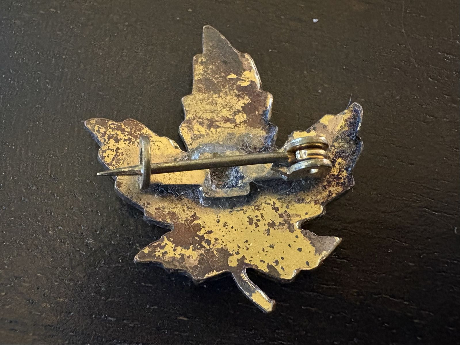 I have a vintage enamel maple leaf pin with red, green and yellow. It is 1 inch tall and 1 inch wide. The back looks like it was gold over silver but the gold has worn off. It doesn’t stick to a magnet but I don’t see any metal content markings so I don’t know what the metal actually is. See my other ads for jewelry, artwork, home decor and more.