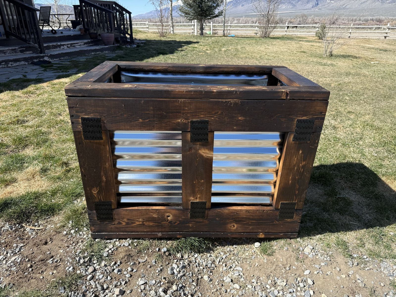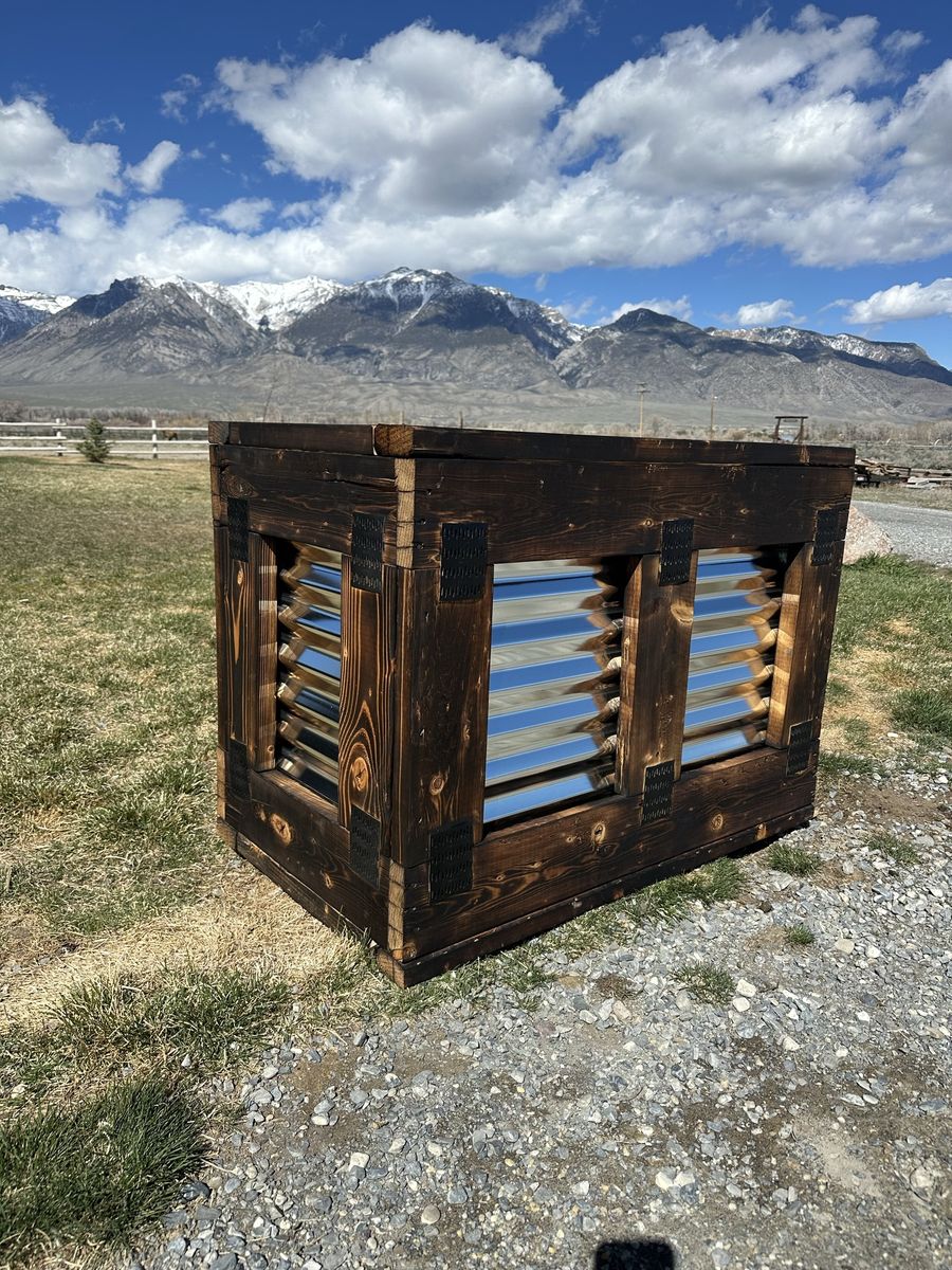 Details: • Size: 30” tall x 41” long x 24” wide • Solid wood with a rich rustic finish • Corrugated metal panels for a modern farmhouse look
