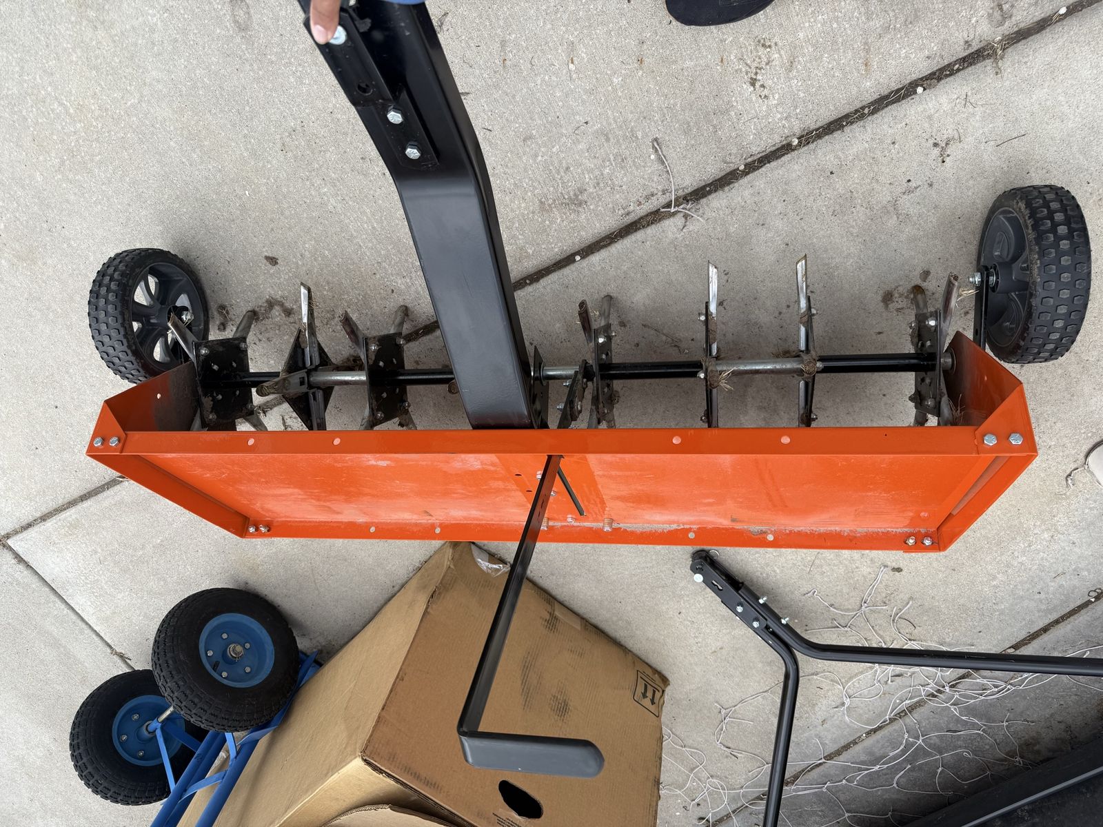 This aerator works great. It’s to pull behind with your atv or riding lawnmower.