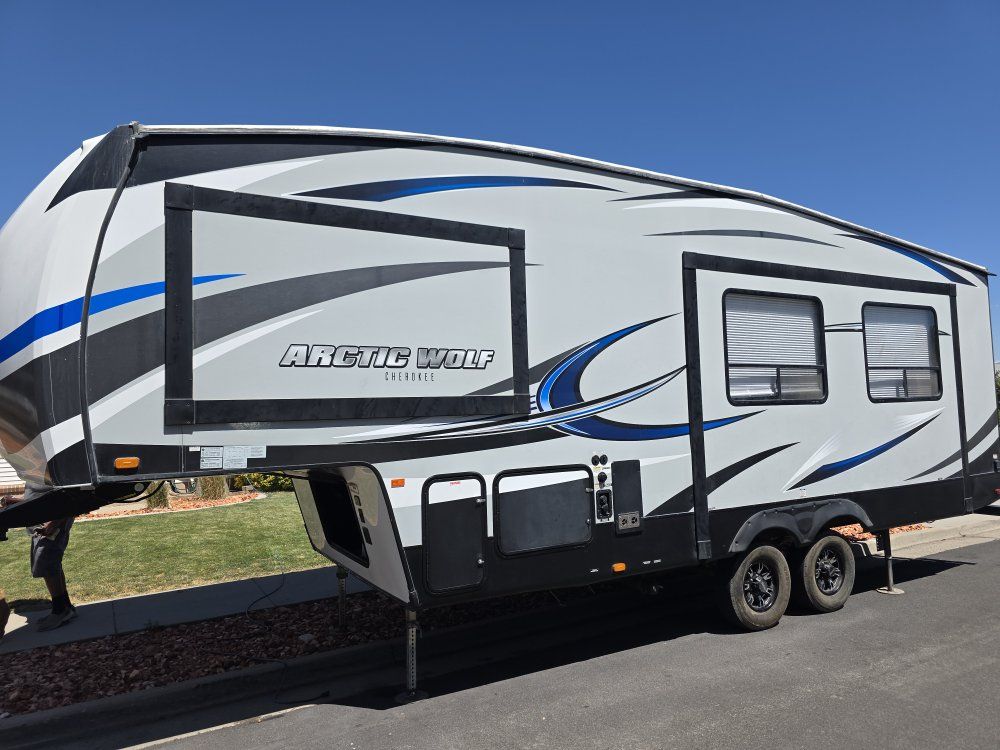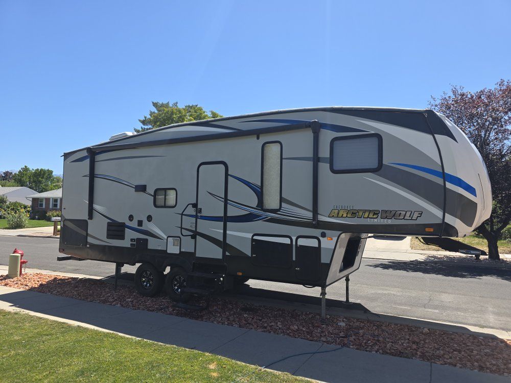 PRICE DROP TO SELL. 2018 Artic wolf limited Gvw 5609 Sleeps 4 2 propane tanks Stove and over head microwave. Aftermarket wheels Queen bed. Large bathroom. 40 gallon clean water. Power leveling. Solar outlet on out side of trailer. Central air. Tons of storage. Will Come with 5th wheel bed hitch. Surround sound throughout trailer and outside. Choice of 3 station of speakers to play on. Will also come with solar panel,but will need connectors. Title in hand. No trades. See Less