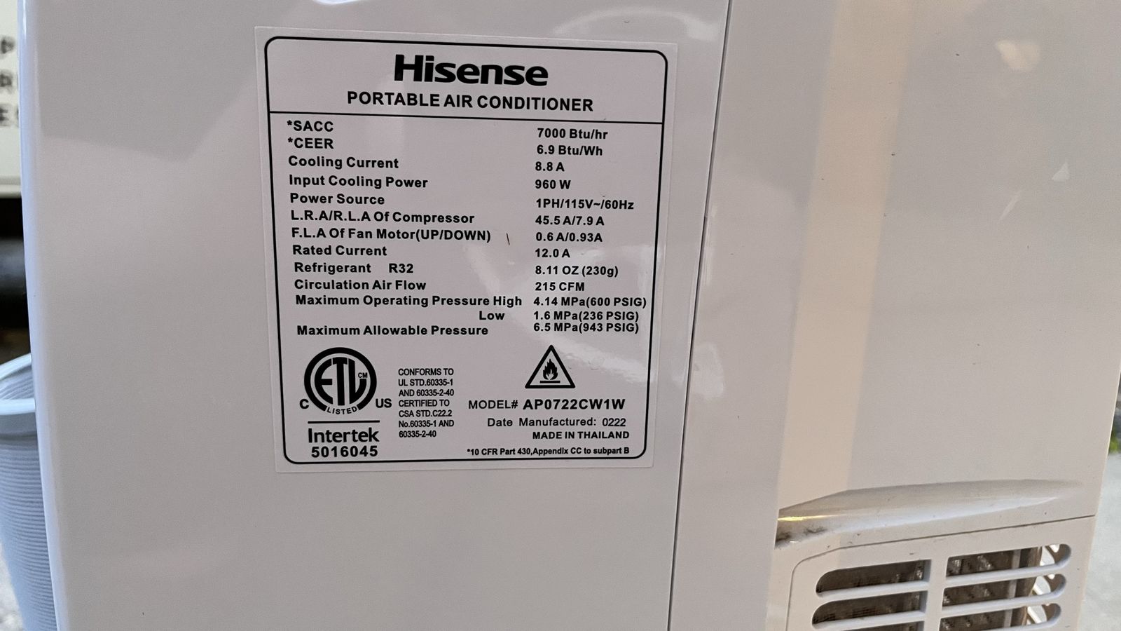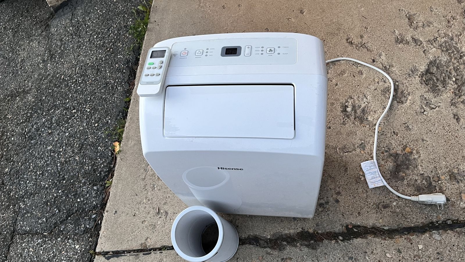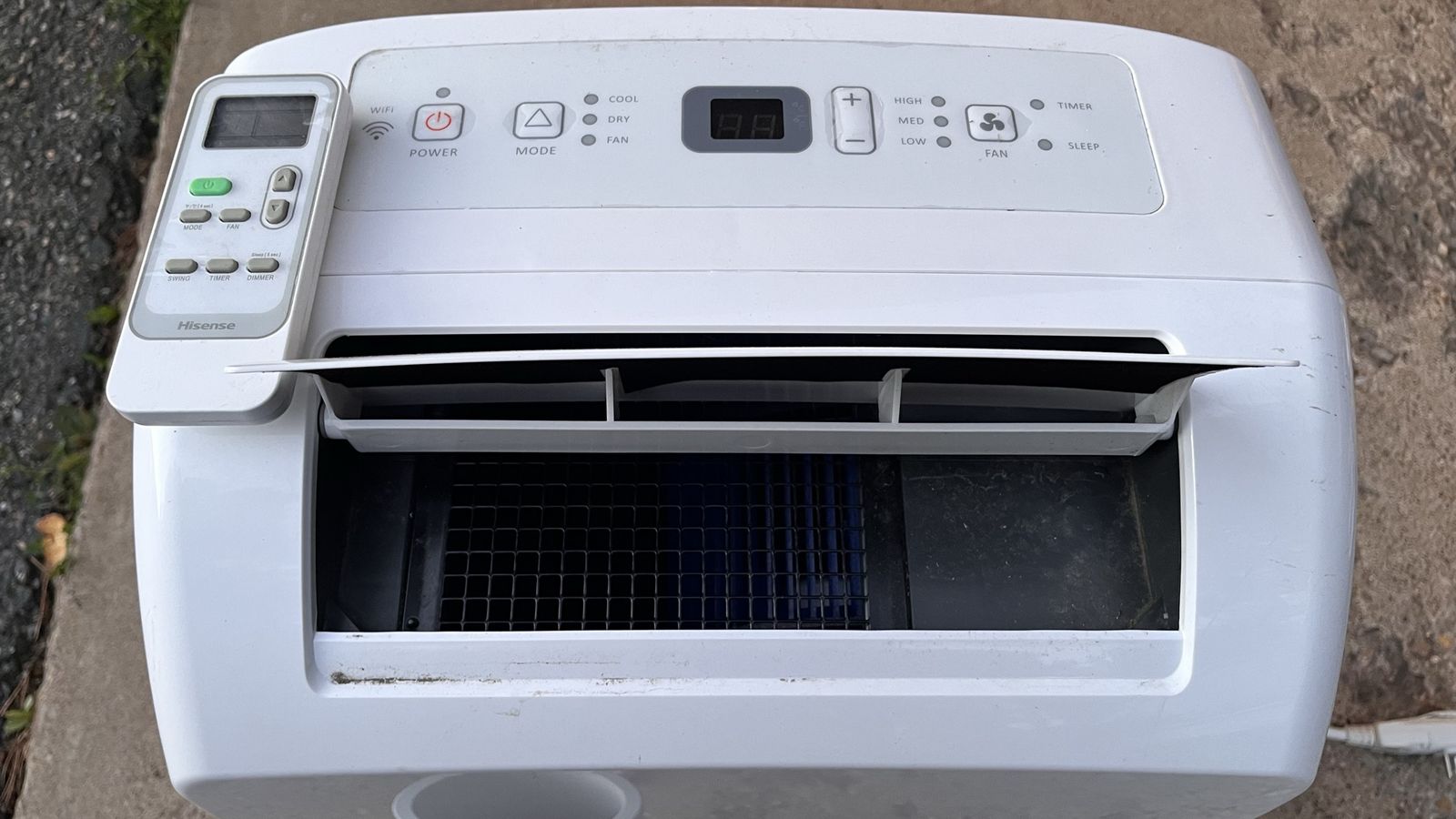 VenmoWhite Hisense portable AC unit. Comes with the remote, power cord, and exhaust hose. Great for keeping cool.