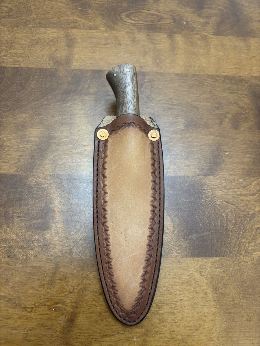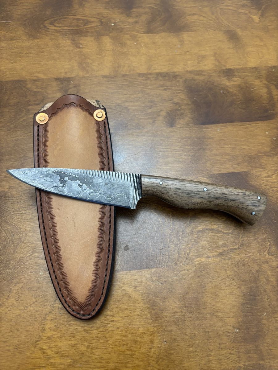 ApplePayThis handmade knife is just $165. It has a thick spine, a beefy handle, and heavy skandi grind. The metal is a rasp used by farriers to shoe horses. The rasp is a high carbon steel that creates a really hard edge while still being easy to sharpen. The finish is called brute de forge where the black scale and rustic appearance from the forge and quenching process remains on the blade. I then wire brush the metal for its final finish. This leaves a unique and rustic appearance to each blade. The handle is made of Mahogany wood. It is hardwood that is both beautiful and durable. The sheath is made in Springville, UT by Travis Oakey at Western Trade. The sheath is a tan and brown in color and is made from high quality full grain leather, and is custom fit for this knife so it keeps it secure. This upgraded sheath is hand tooled and stitched. I am willing to engrave anything you want (such as your name or an important date) on the spine of the handle for free. Pickup is in Springville, UT. I am able to ship to the lower 48 for an additional $10.