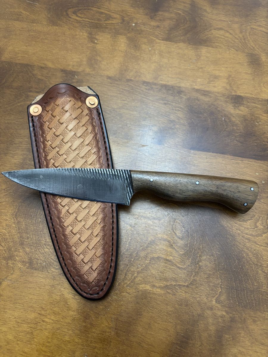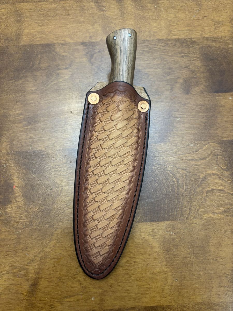 The handle is made of Mahogany wood. It is hardwood that is both beautiful and durable. The sheath is made in Springville, UT by Travis Oakey at Western Trade. The sheath is a tan and brown in color and is made from high quality full grain leather, and is custom fit for this knife so it keeps it secure. This upgraded sheath is hand tooled and stitched.