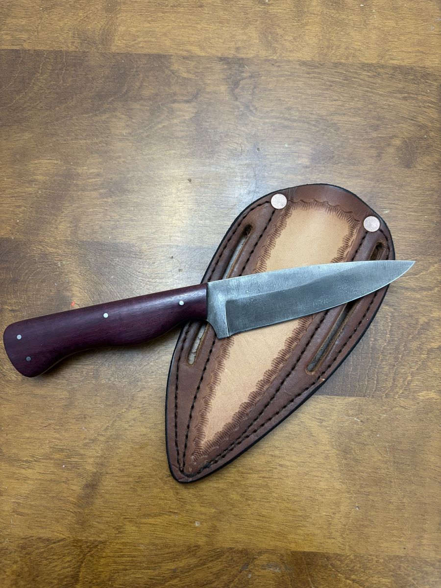ApplePayThis handmade knife is just $175. It has a thick spine, a beefy handle, and heavy skandi grind. The metal is 1095 high carbon steel that creates a really hard edge while still being easy to sharpen. The finish is called brute de forge where the black scale and rustic appearance from the forge and quenching process remains on the blade. I then wire brush the metal for its final finish. This leaves a unique and rustic appearance to each blade.
