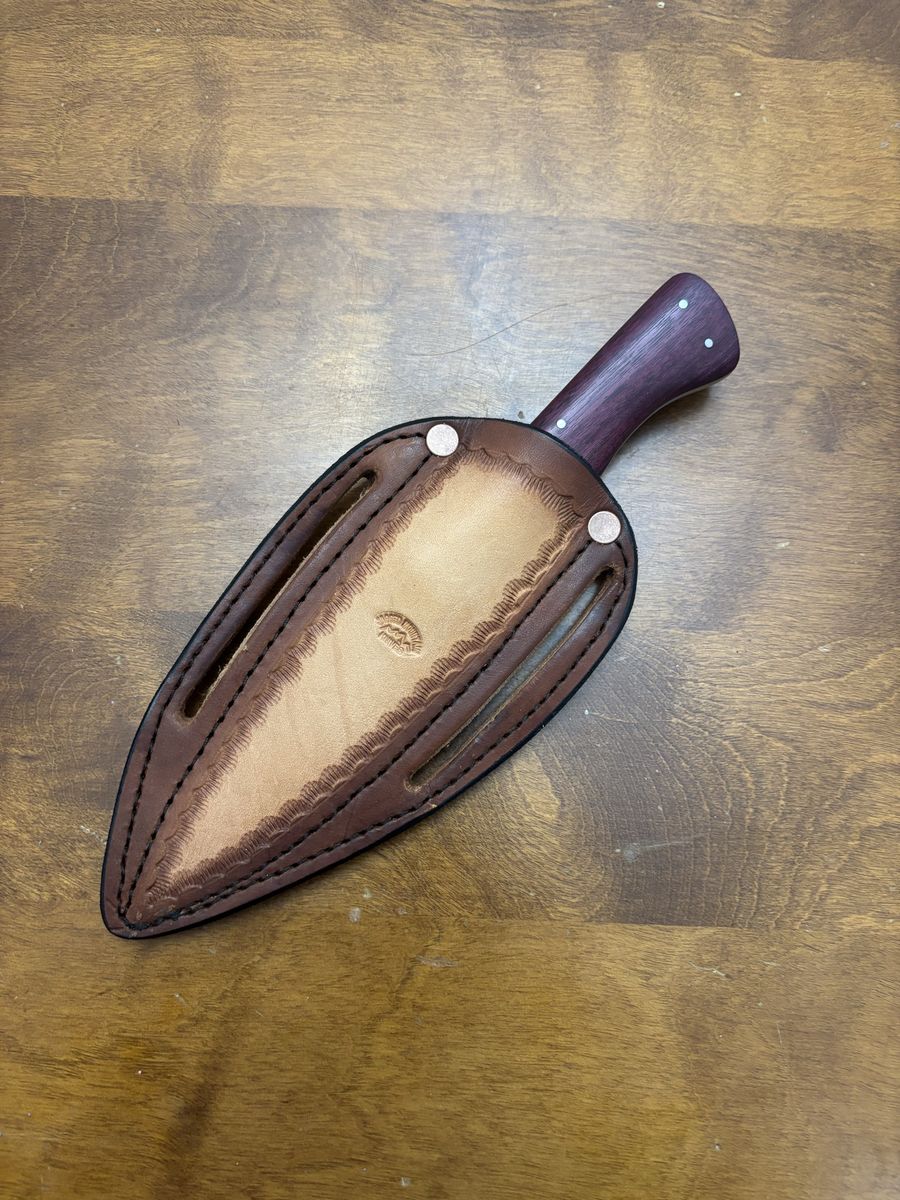 The sheath is made in Springville, UT by Travis Oakey at Western Trade. The Cowboy style sheath is a tan and brown in color. This Cowboy is handcrafted from premium leather and the angled carry keeps your k life secure, accessible, and out of the way as you move and work. It is also hand tooled and stitched.