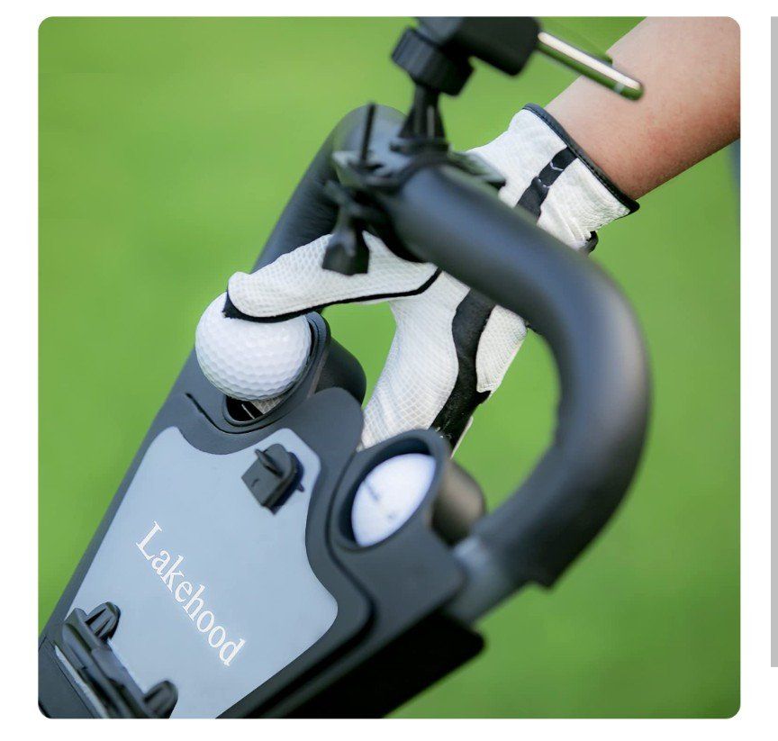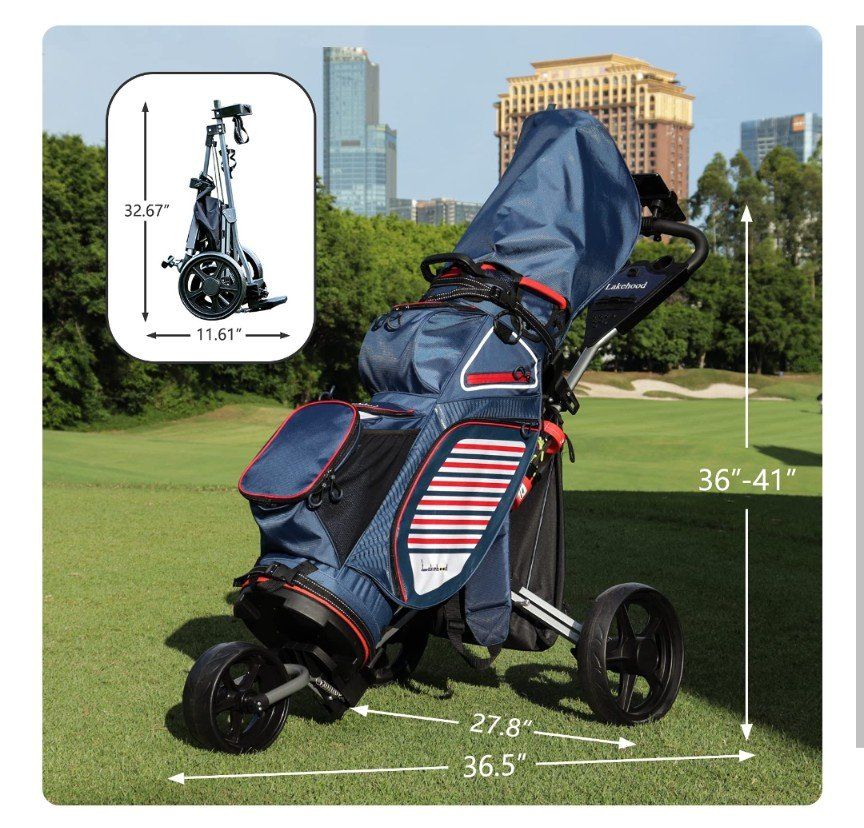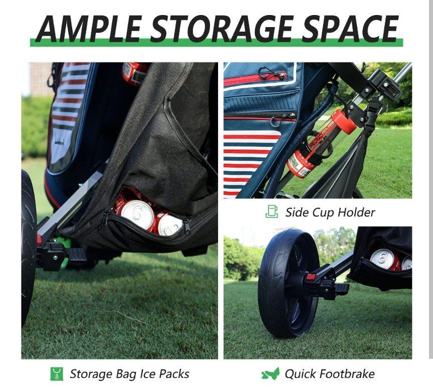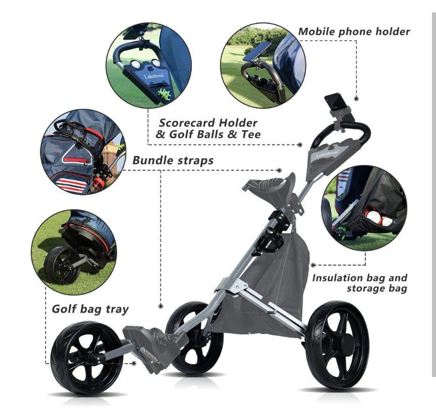 Scorecard holder integrated with storage compartment, cup holder and mobile phone holder, mesh net and a storage bag with cooler built on the cart. Rubber wrapped handle is for more comfortable grip.