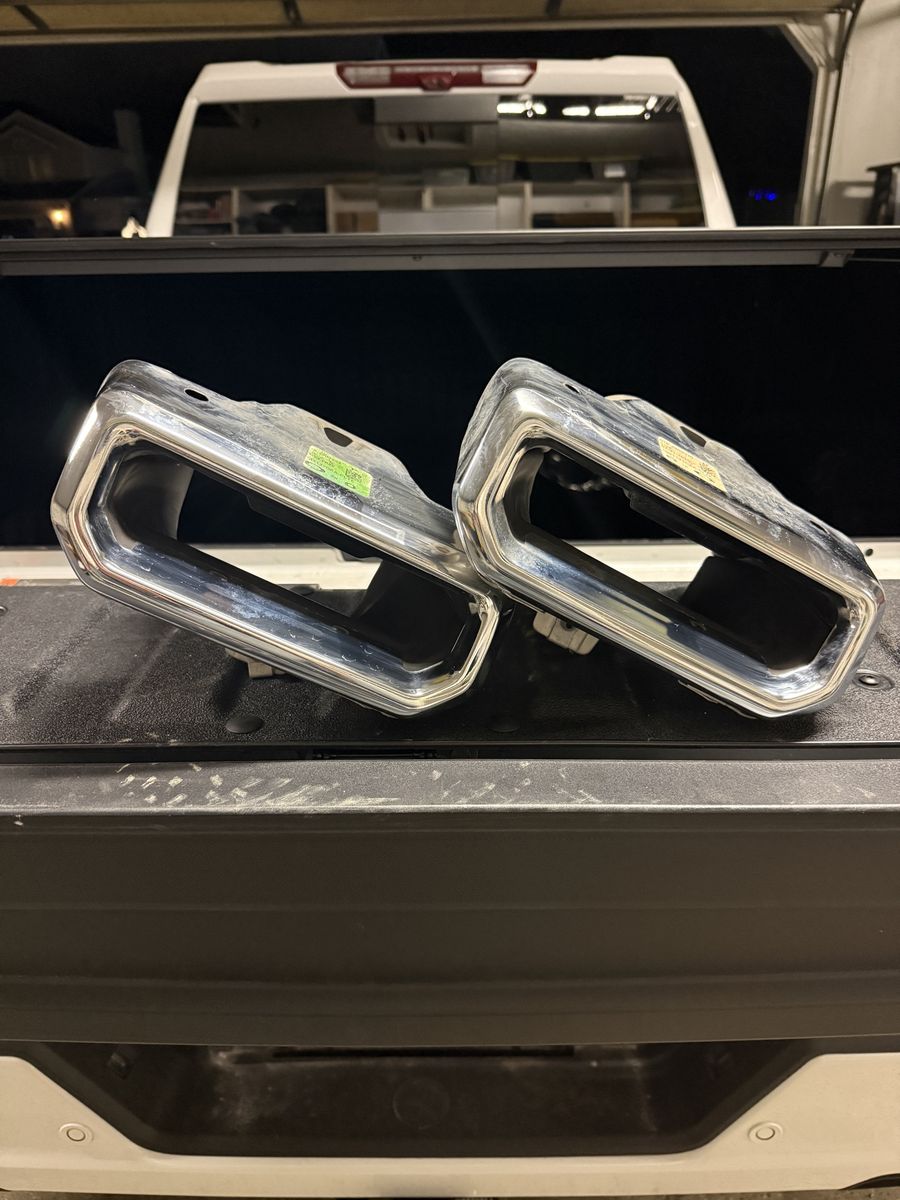 Chrome exhaust caps for current body style GMC Sierra or Chevy Silverado.