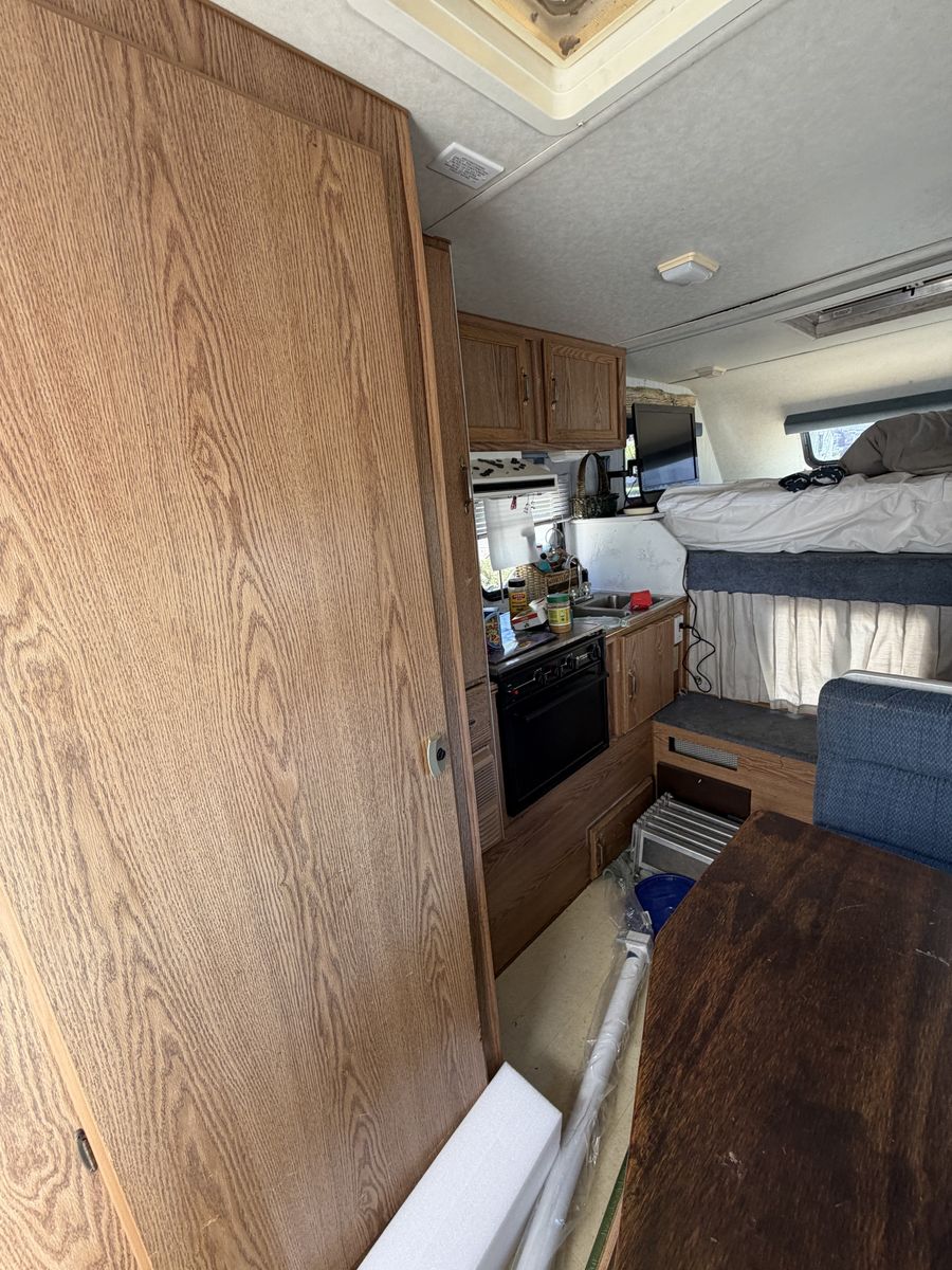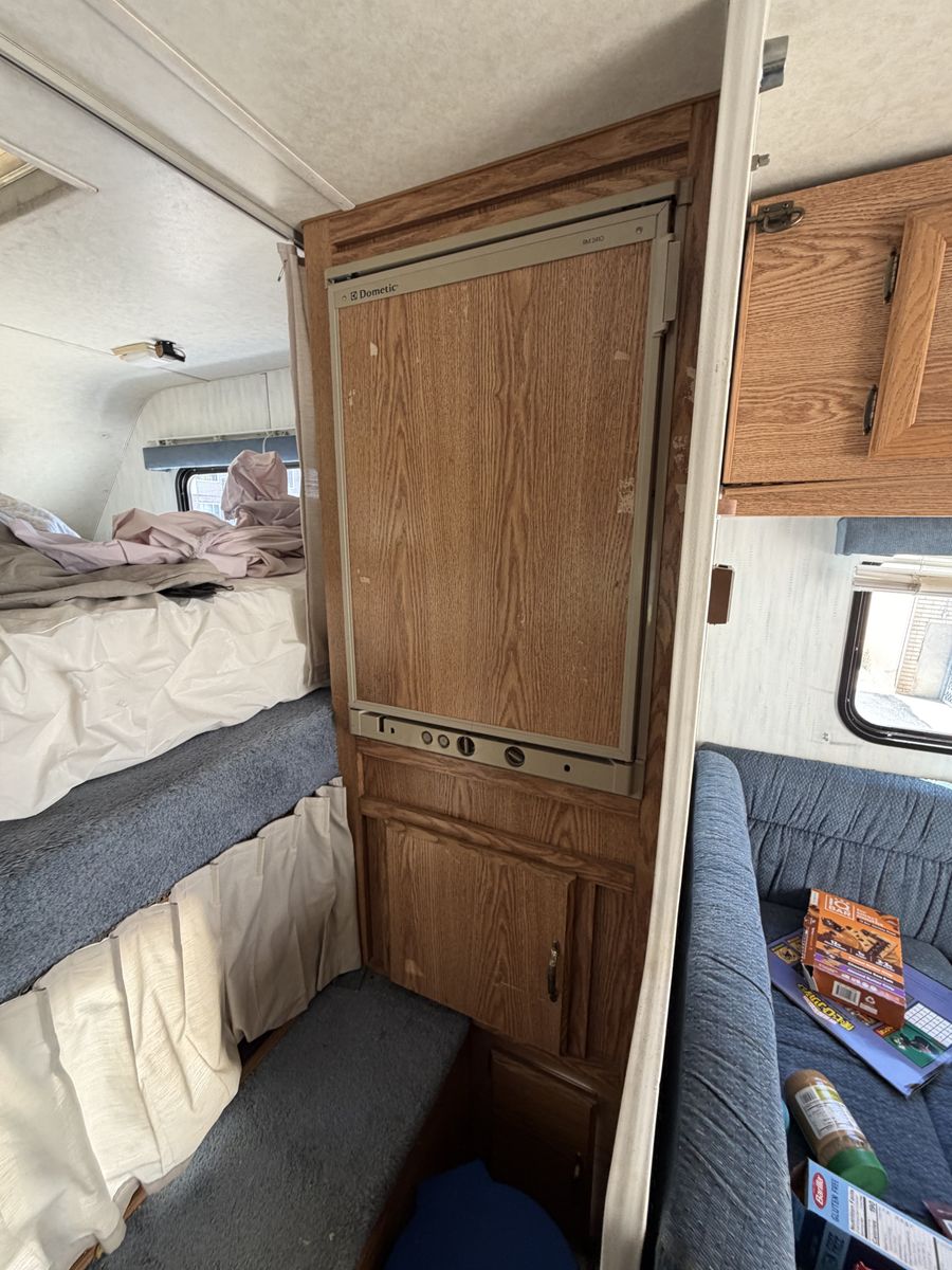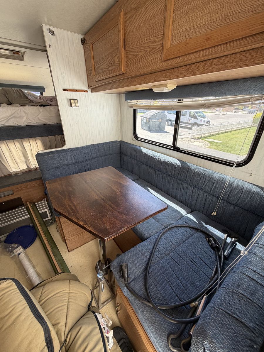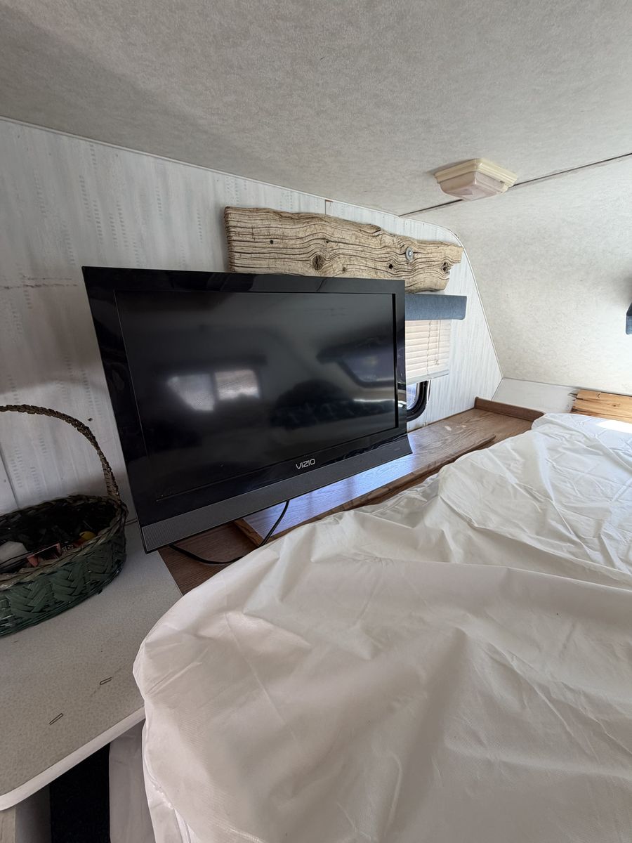 Full bathroom, dining table becomes bed, electric works, fridge works, water pumps work along with bathroom, stove works, tv can run off battery. Heat works, full propane. Lights inside and outside working.