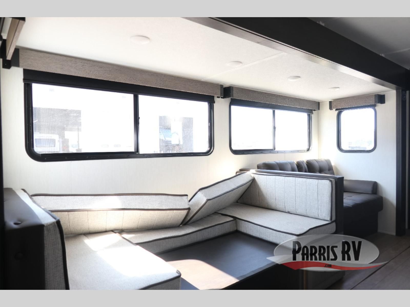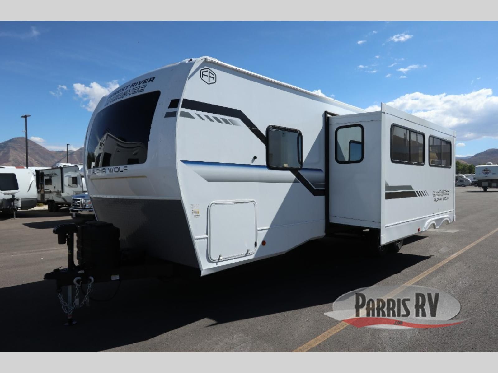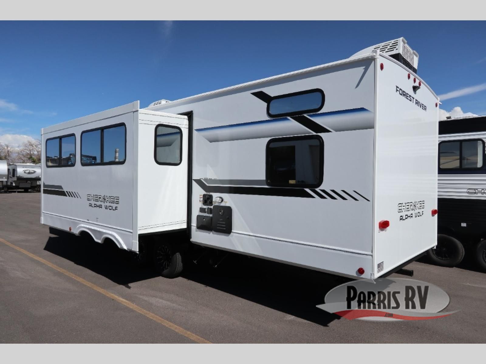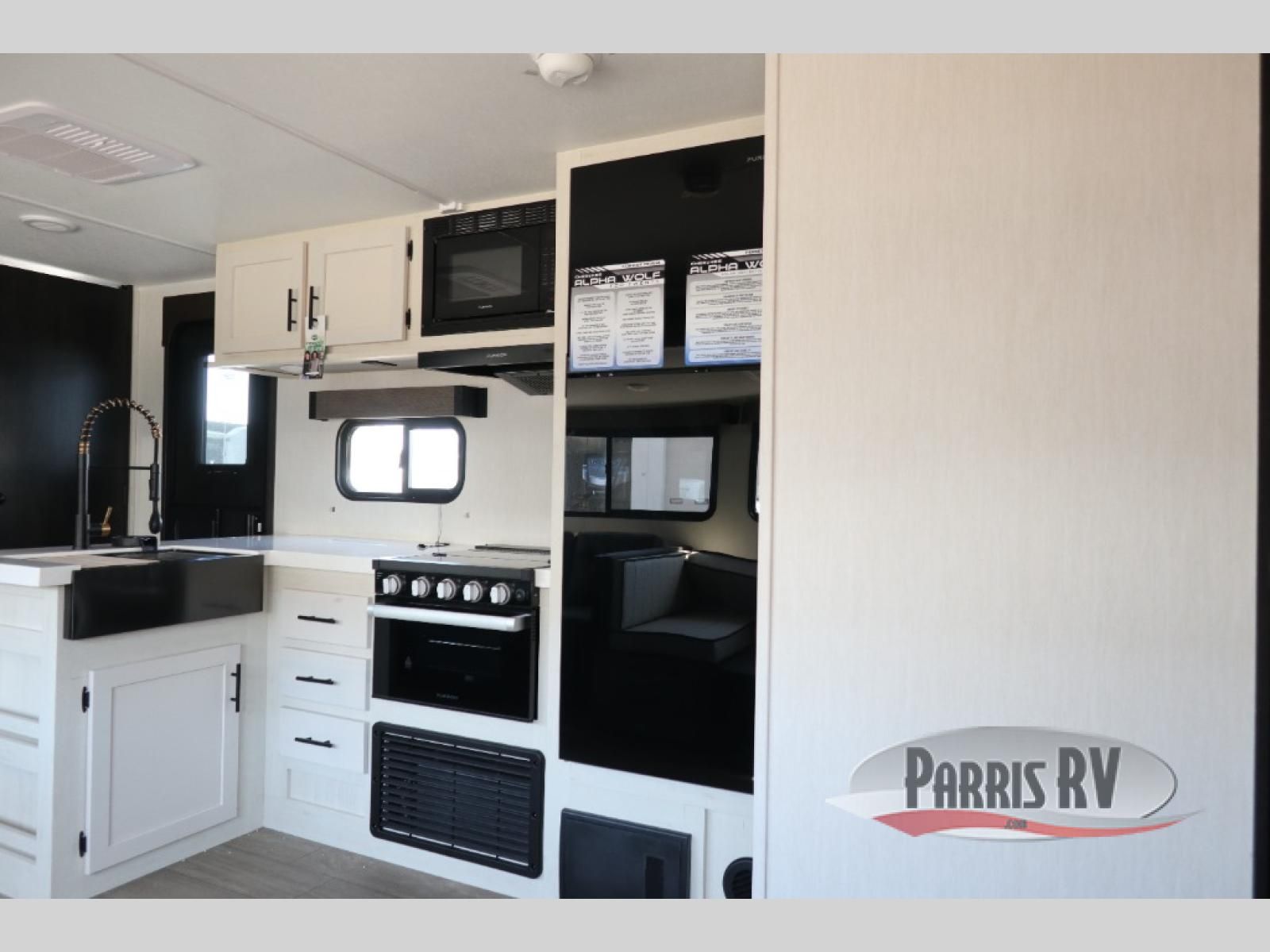 Looking for a spacious travel trailer to sleep nine or ten happy campers? You've found it in this Cherokee Alpha Wolf model with a handy outside kitchen, a bunkhouse with a dinette, a front private bedroom, and a large slide out! The main living and kitchen area has a U-shaped dinette to utilize as a dining table, game table, work station, and/or an extra sleeping space. There is also a jackknife sofa for seating, TV watching, or sleeping. From any seating area you can easily view the entertainment center and fireplace which is centered in the unit with doors on either side to the front private bedroom. You will also find a nice pantry and full kitchen amenities including a large sink, and residential-style refrigerator allowing you to easily create meals for your hungry crew. The exterior provides an 18' awning for an outdoor living area over the outside kitchen, and there is ample exterior storage for all of your camping gear like camp chairs, outside games, rugs, and more.