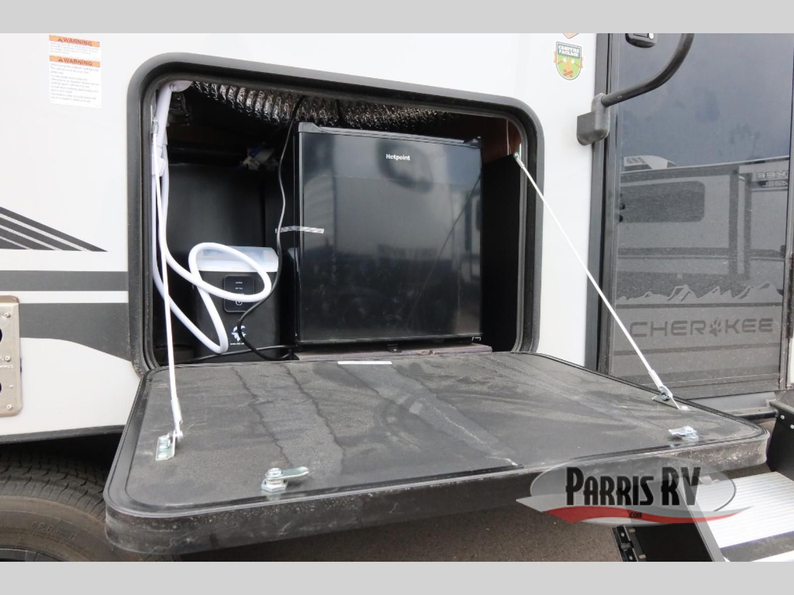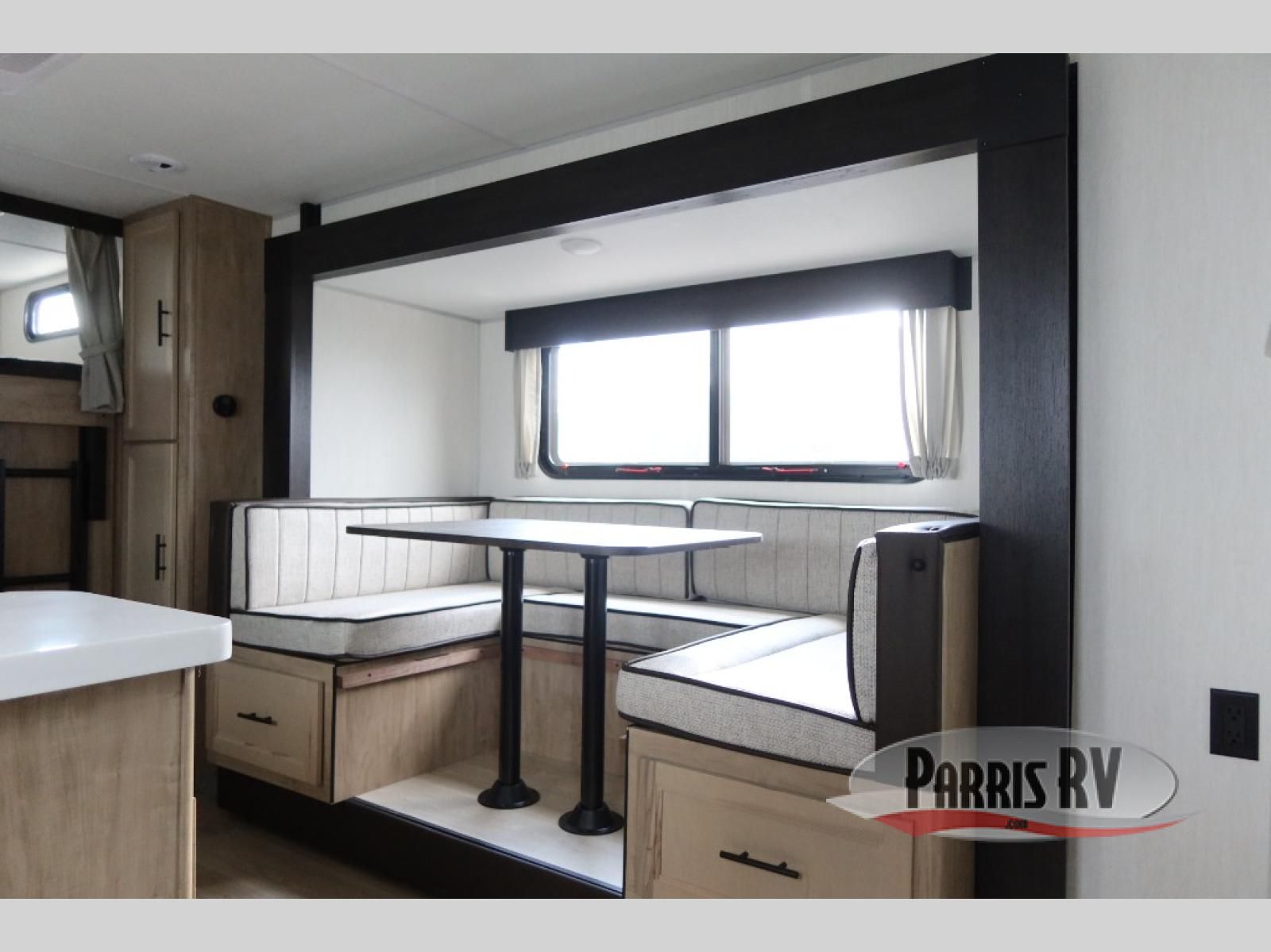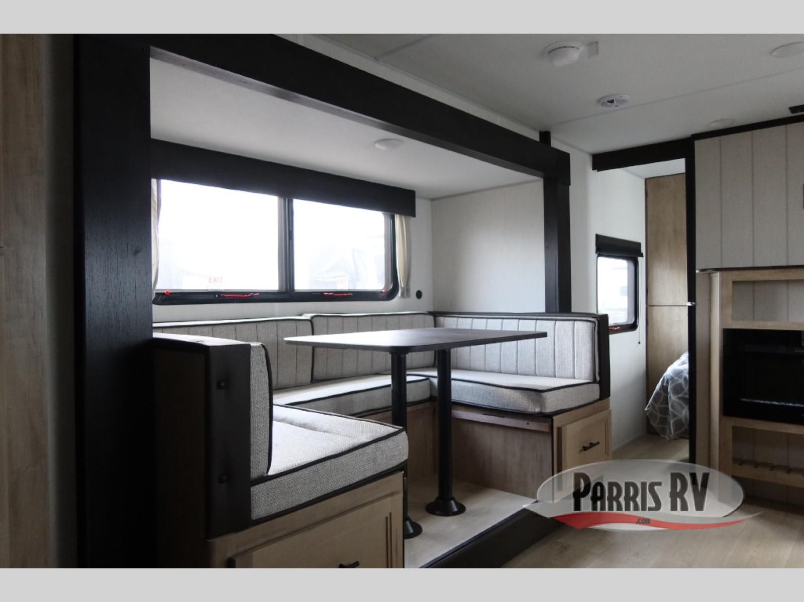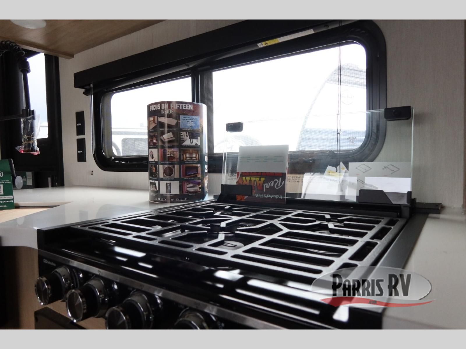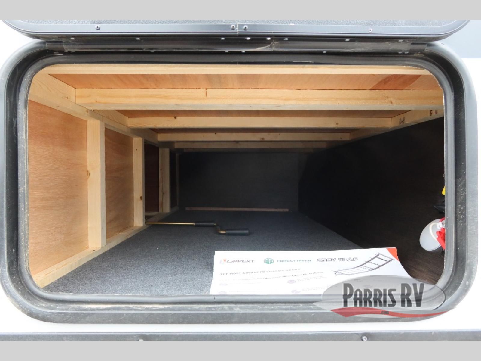 You will love the space provided in this dual entry Cherokee Grey Wolf Black Label travel trailer that has double-size bunks! The rear entry door leads right into the full bath allowing easy access from outside when you need to use the bathroom while you're enjoying the great outdoors. The large U-shaped dinette slide will not only seat everyone comfortably for a meal or a game, but since it also slides out, it opens up the interior even more to give you plenty of space for foot traffic. This space also serves as extra sleeping space if needed. For all of your outdoor gear, you will find the outside storage compartments handy for stowing away your things when not in use. While the kids enjoy their bunk beds, you will enjoy a good night's rest on the RV king bed with a wardrobe in the front private bedroom!