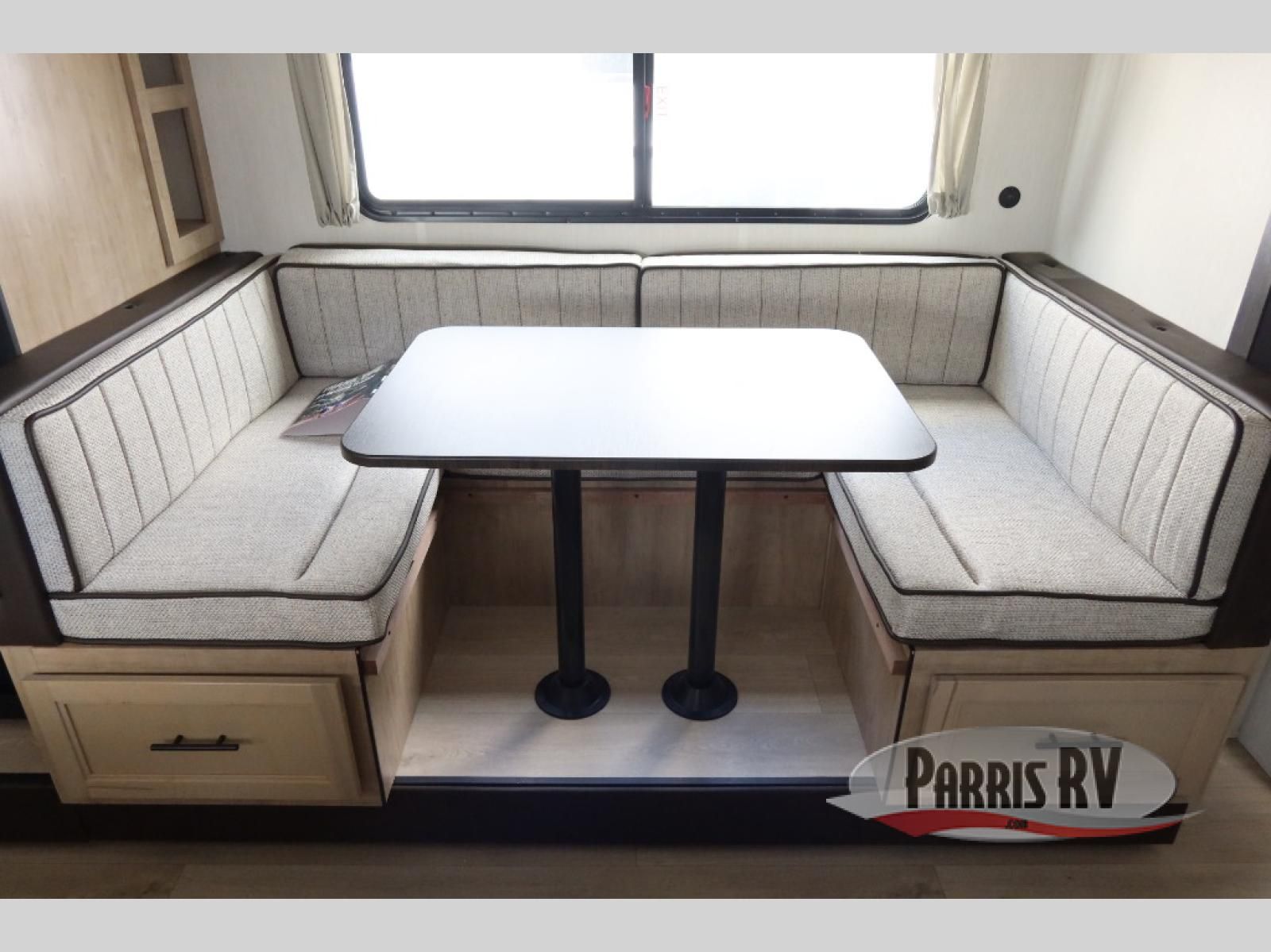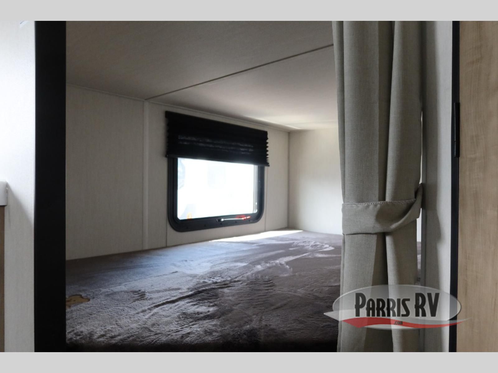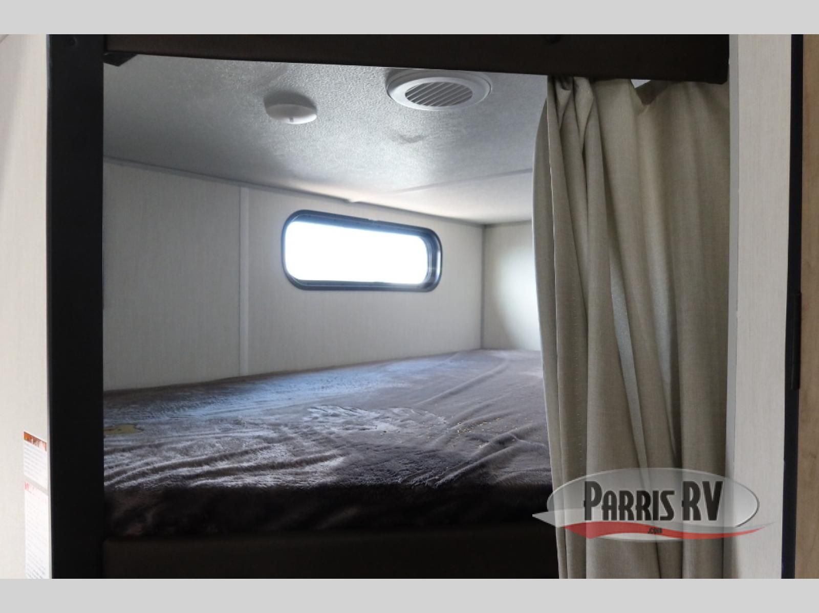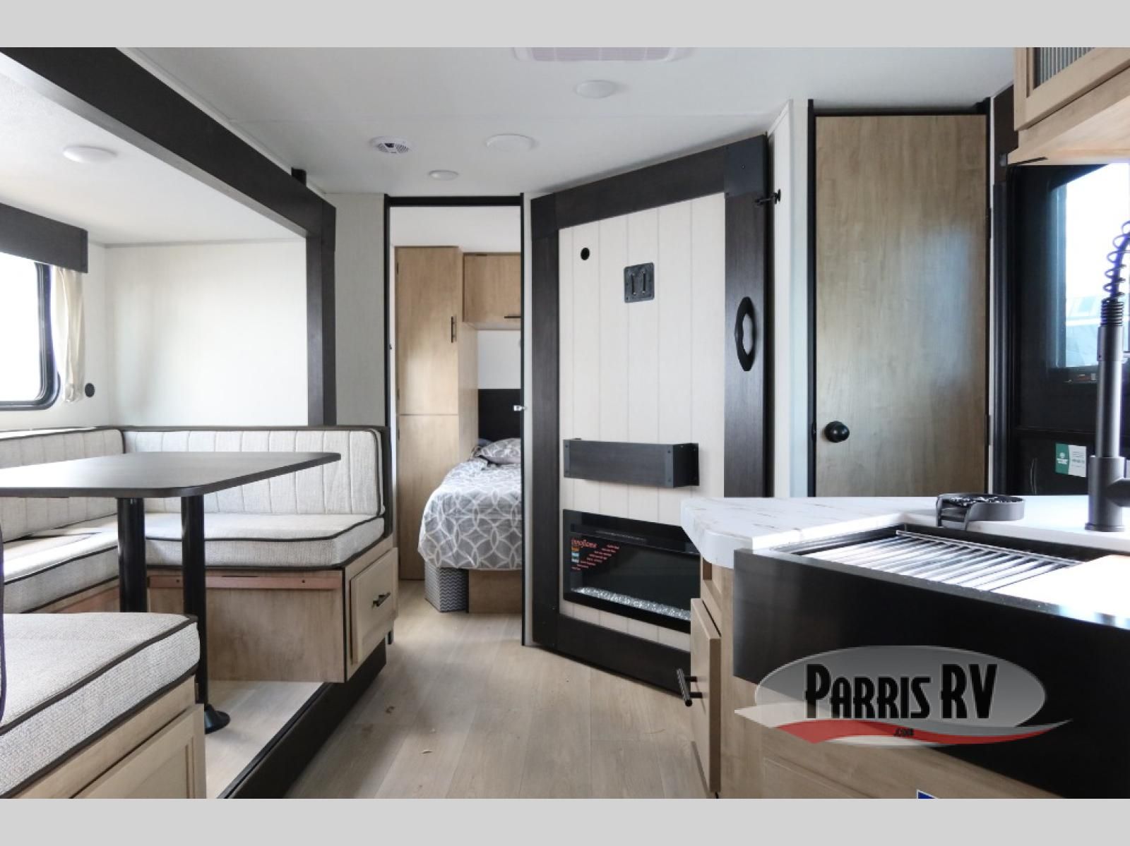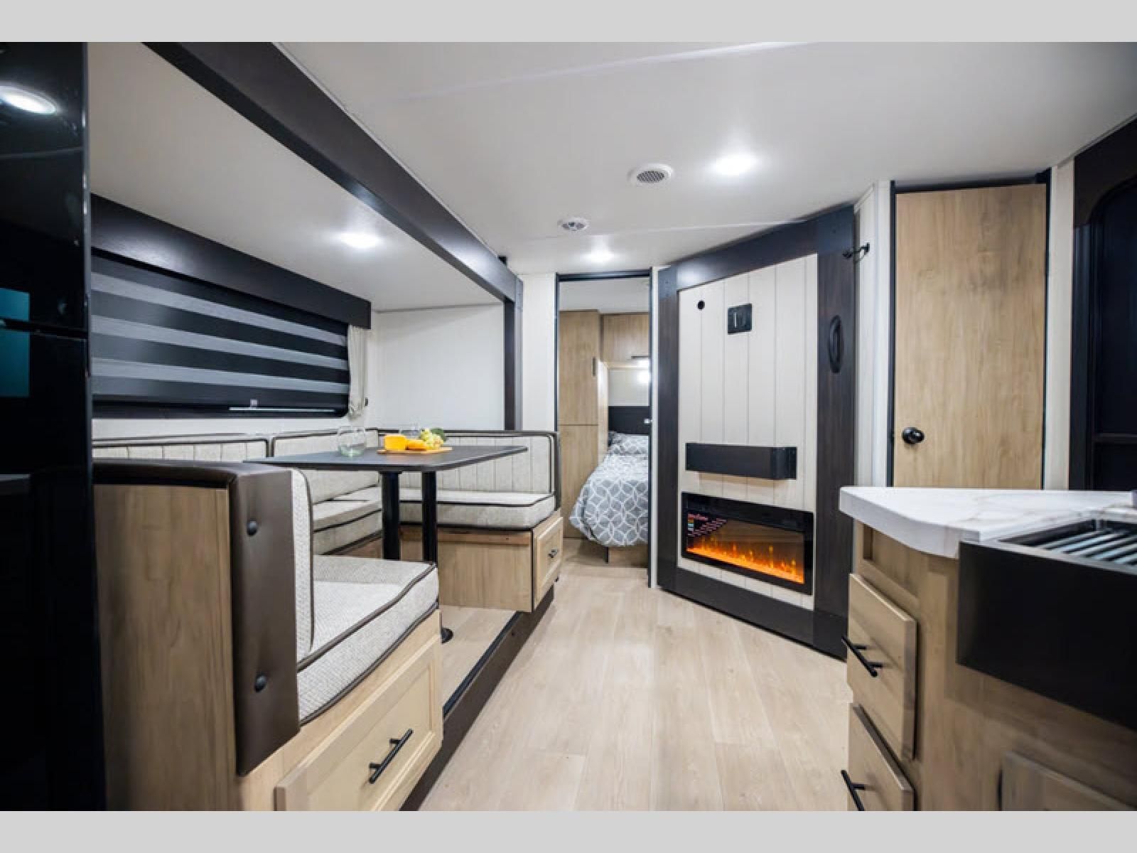 Enjoy time at the campground in this spacious travel trailer with a front private bedroom and double-size bunks for guests! The front bedroom has a wardrobe and shelf for you to store your clothing and essentials. The full interior kitchen and outside kitchen will let you make meals each day, and everyone can dine around the U-shaped dinette, which can service as extra sleeping space if needed. Or dine under the 15' awning outside! This unit also includes ample storage space, including hidden shelves behind the fireplace and outside storage!