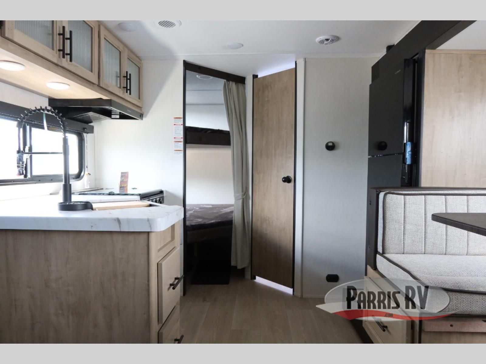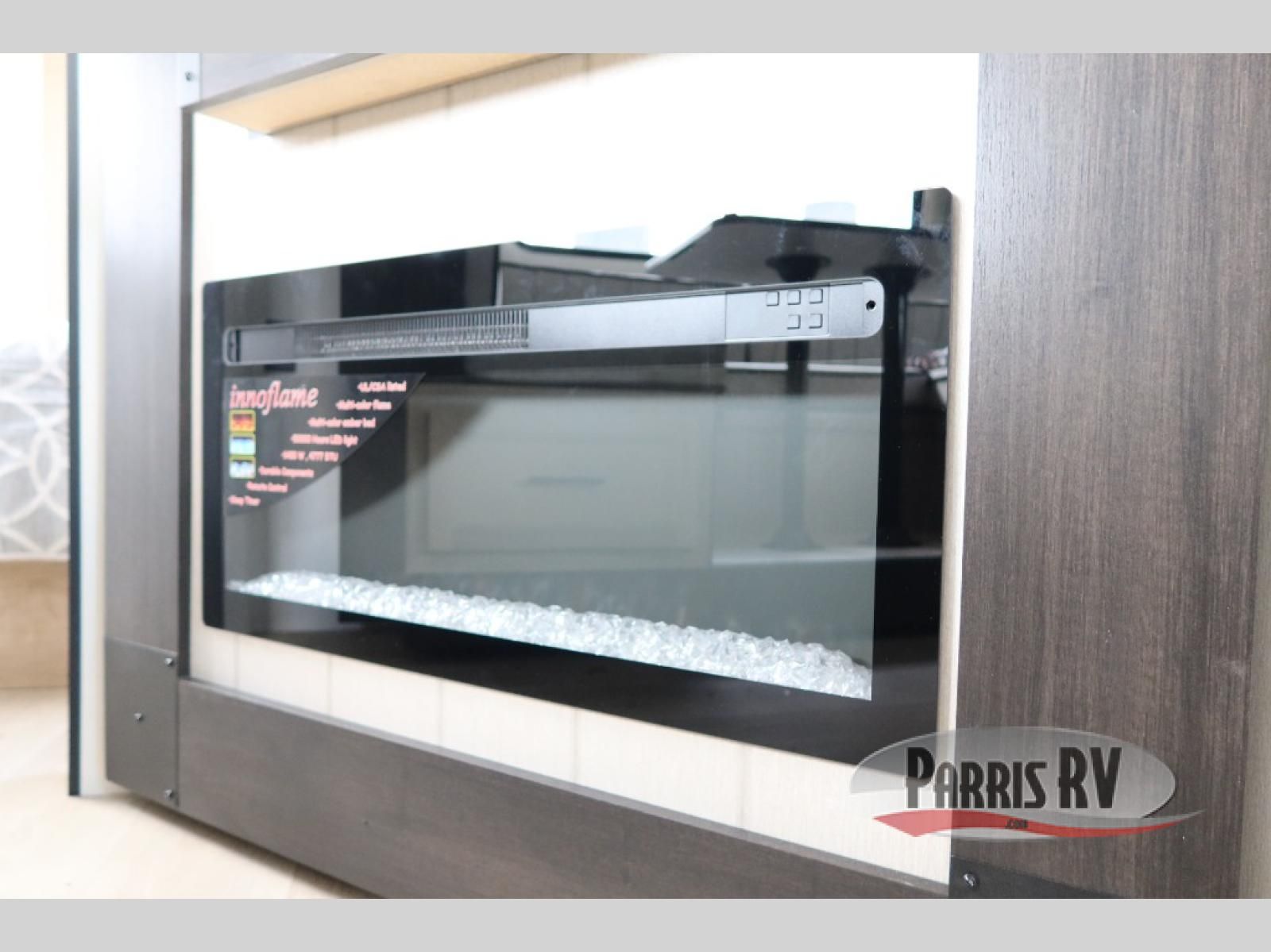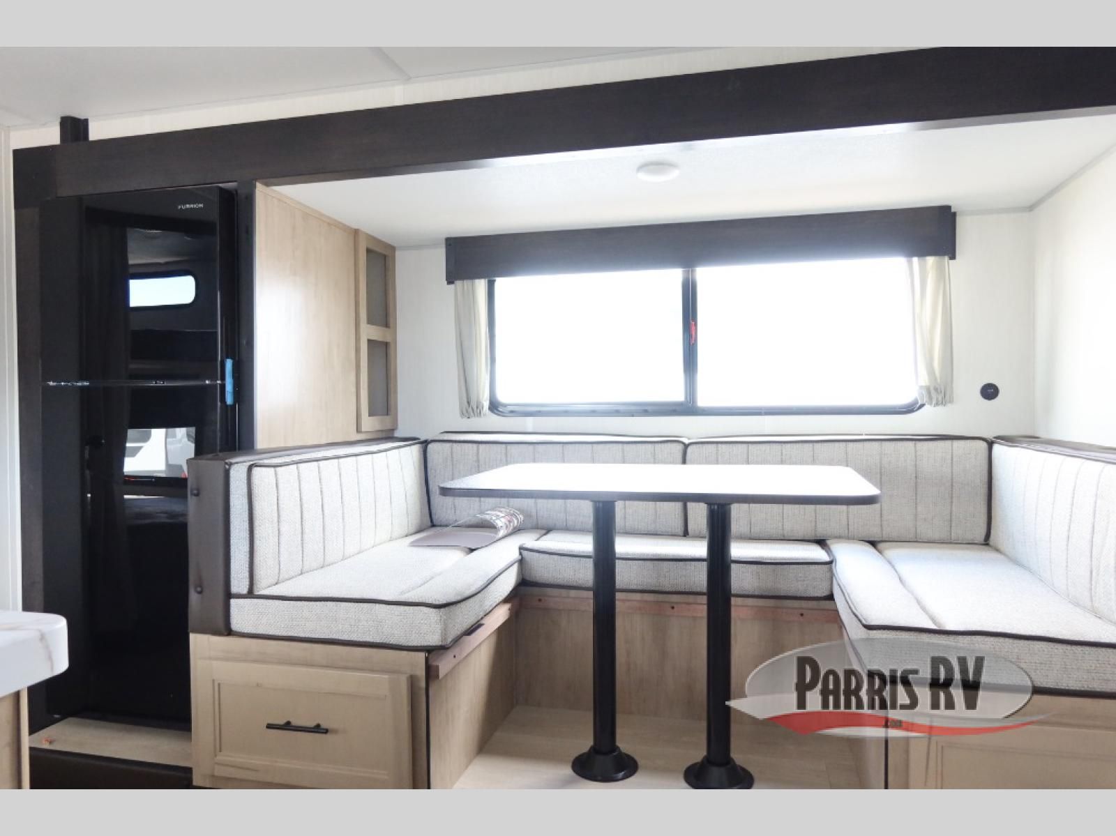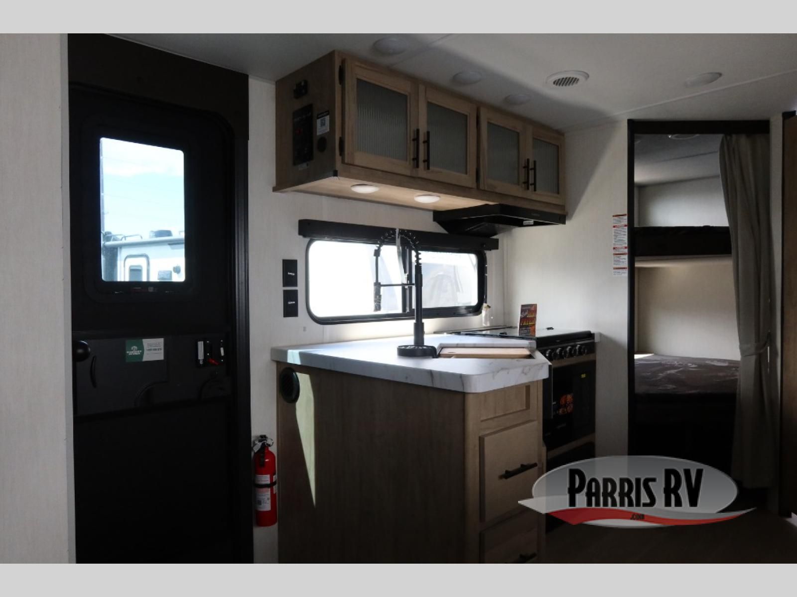 Enjoy time at the campground in this spacious travel trailer with a front private bedroom and double-size bunks for guests! The front bedroom has a wardrobe and shelf for you to store your clothing and essentials. The full interior kitchen and outside kitchen will let you make meals each day, and everyone can dine around the U-shaped dinette, which can service as extra sleeping space if needed. Or dine under the 15' awning outside! This unit also includes ample storage space, including hidden shelves behind the fireplace and outside storage!