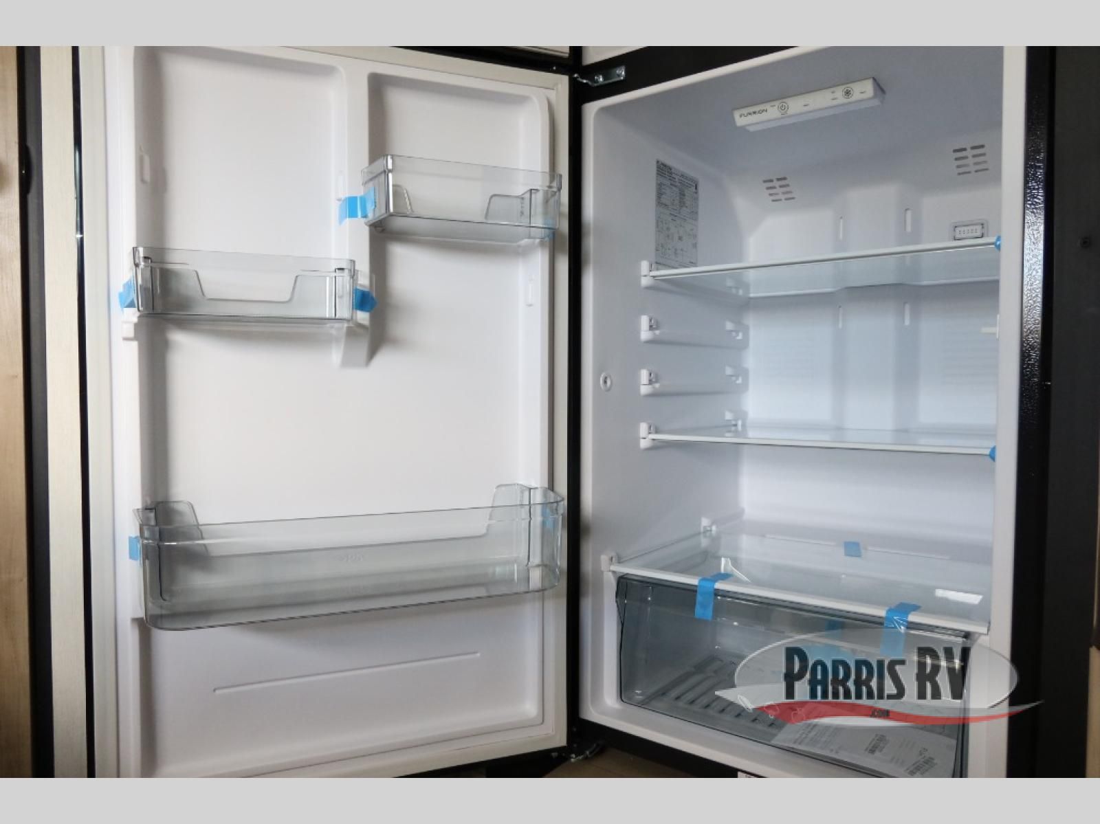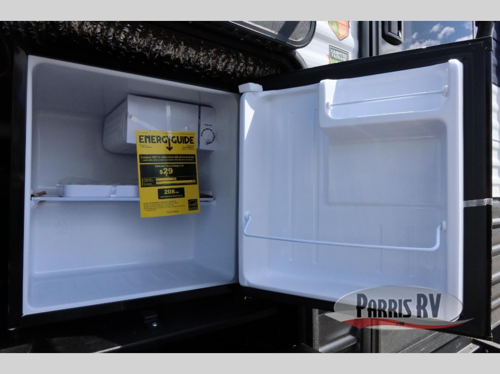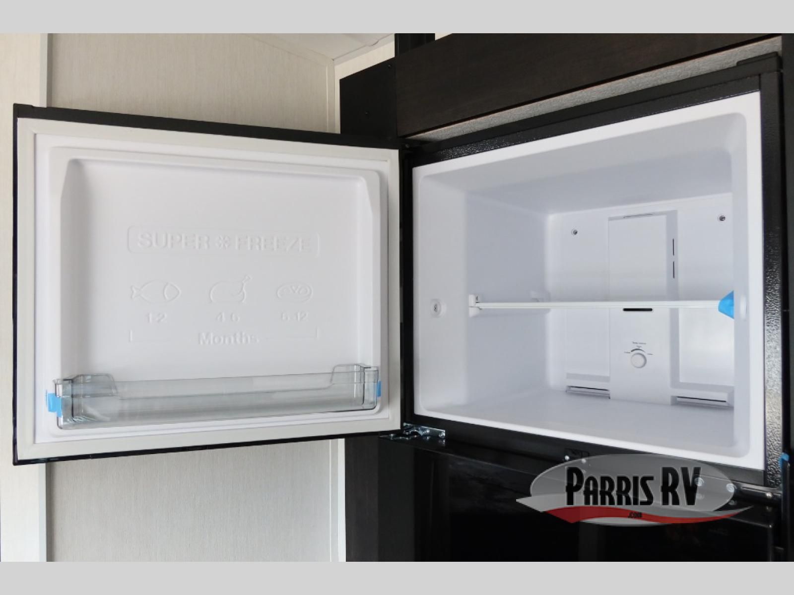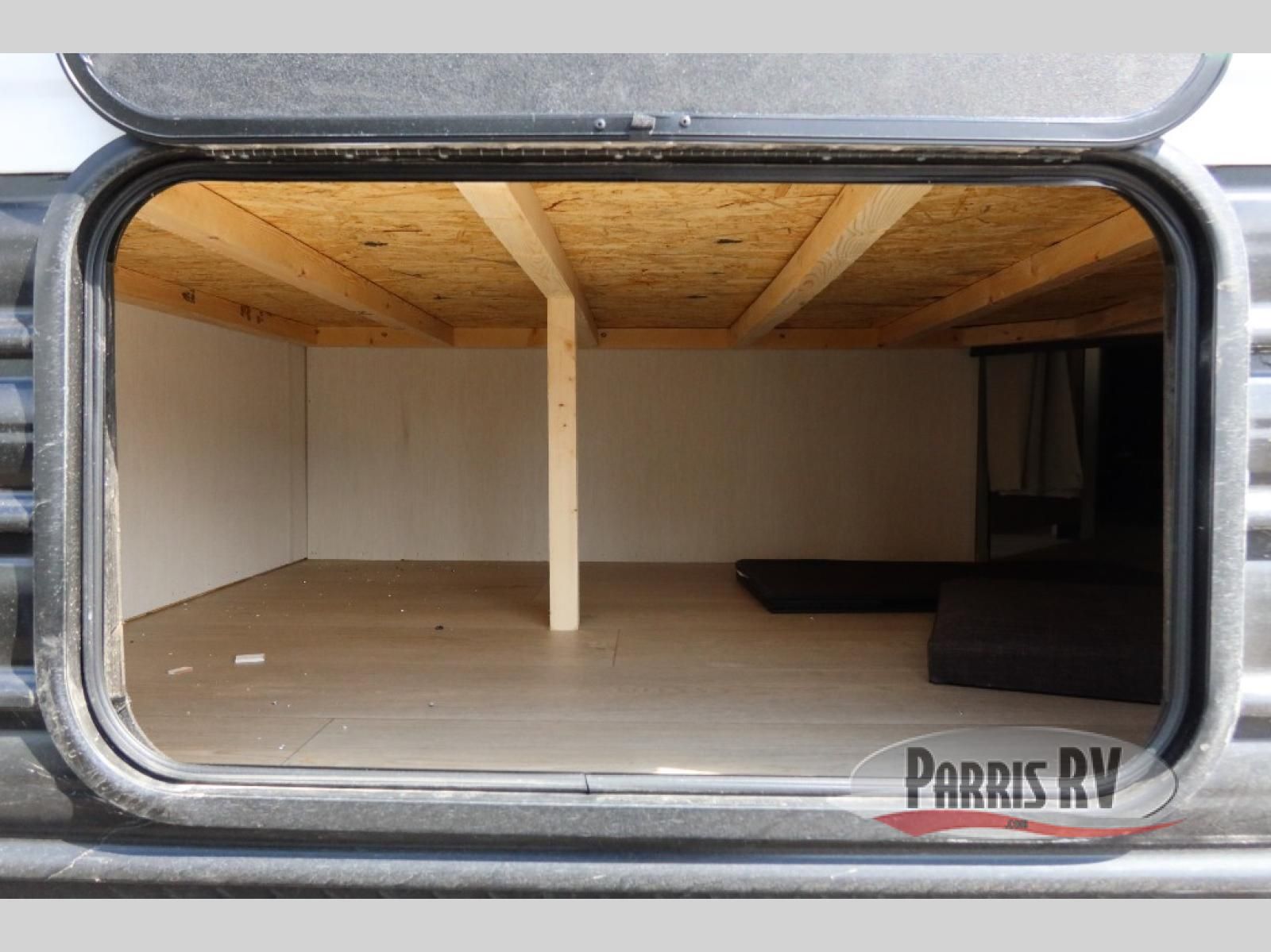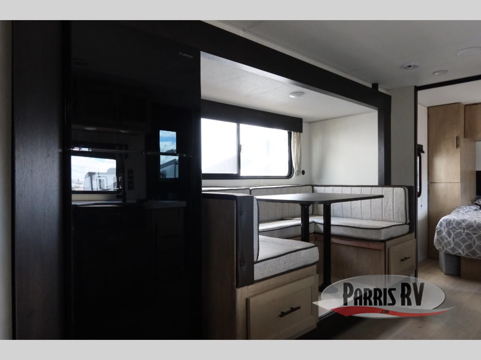 Enjoy time at the campground in this spacious travel trailer with a front private bedroom and double-size bunks for guests! The front bedroom has a wardrobe and shelf for you to store your clothing and essentials. The full interior kitchen and outside kitchen will let you make meals each day, and everyone can dine around the U-shaped dinette, which can service as extra sleeping space if needed. Or dine under the 15' awning outside! This unit also includes ample storage space, including hidden shelves behind the fireplace and outside storage!
