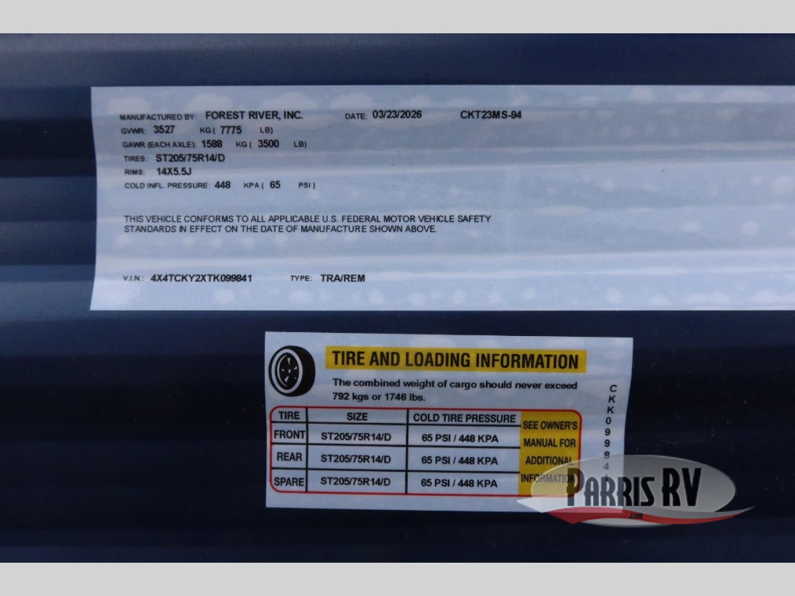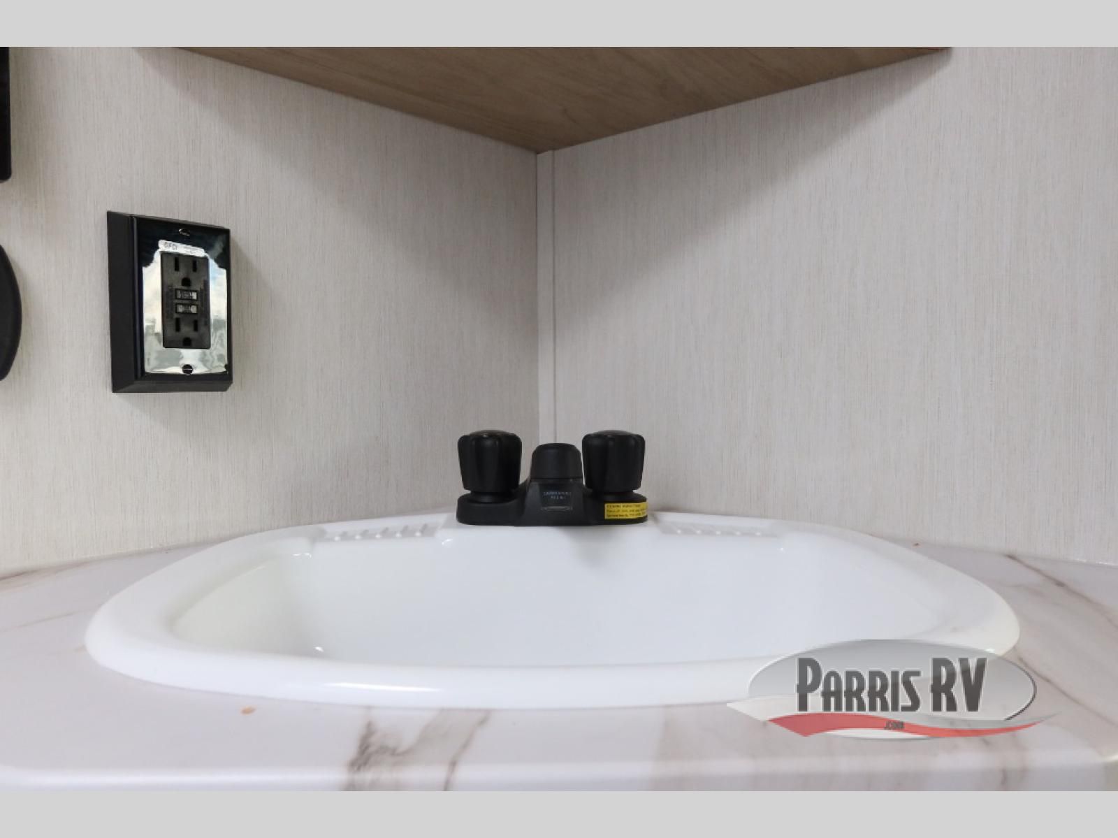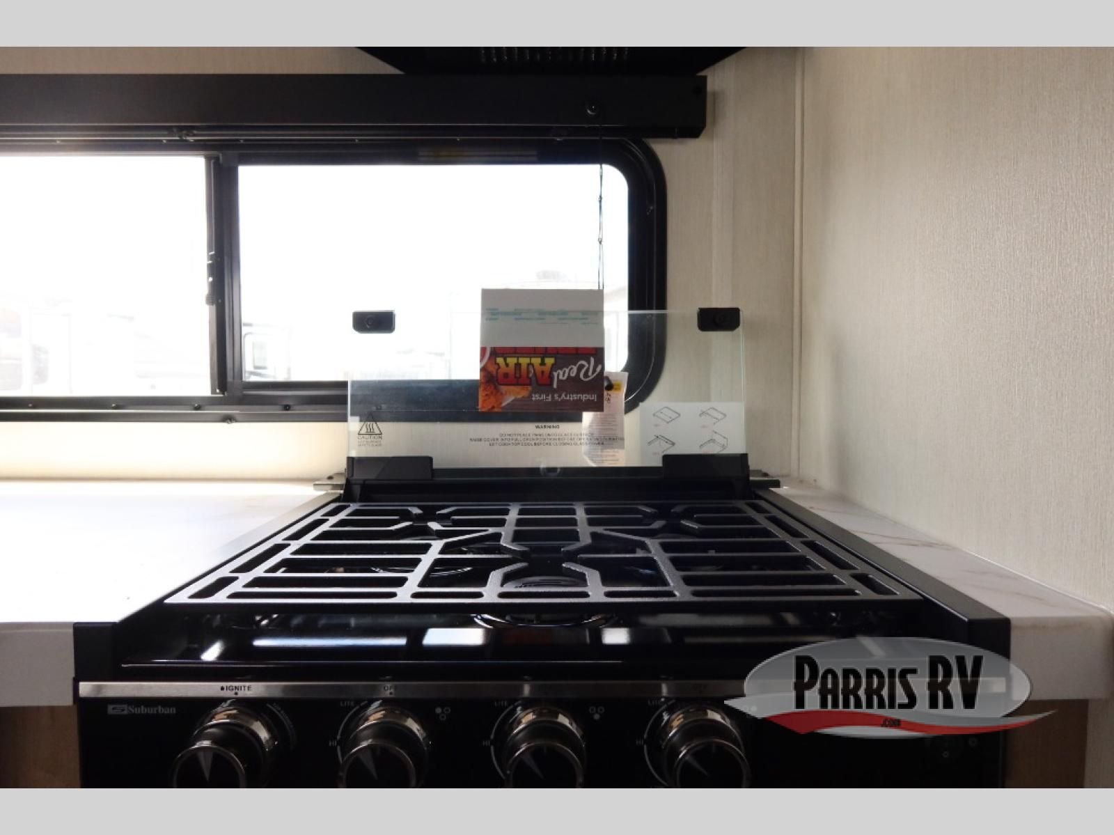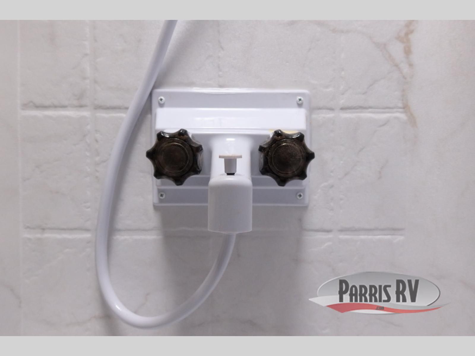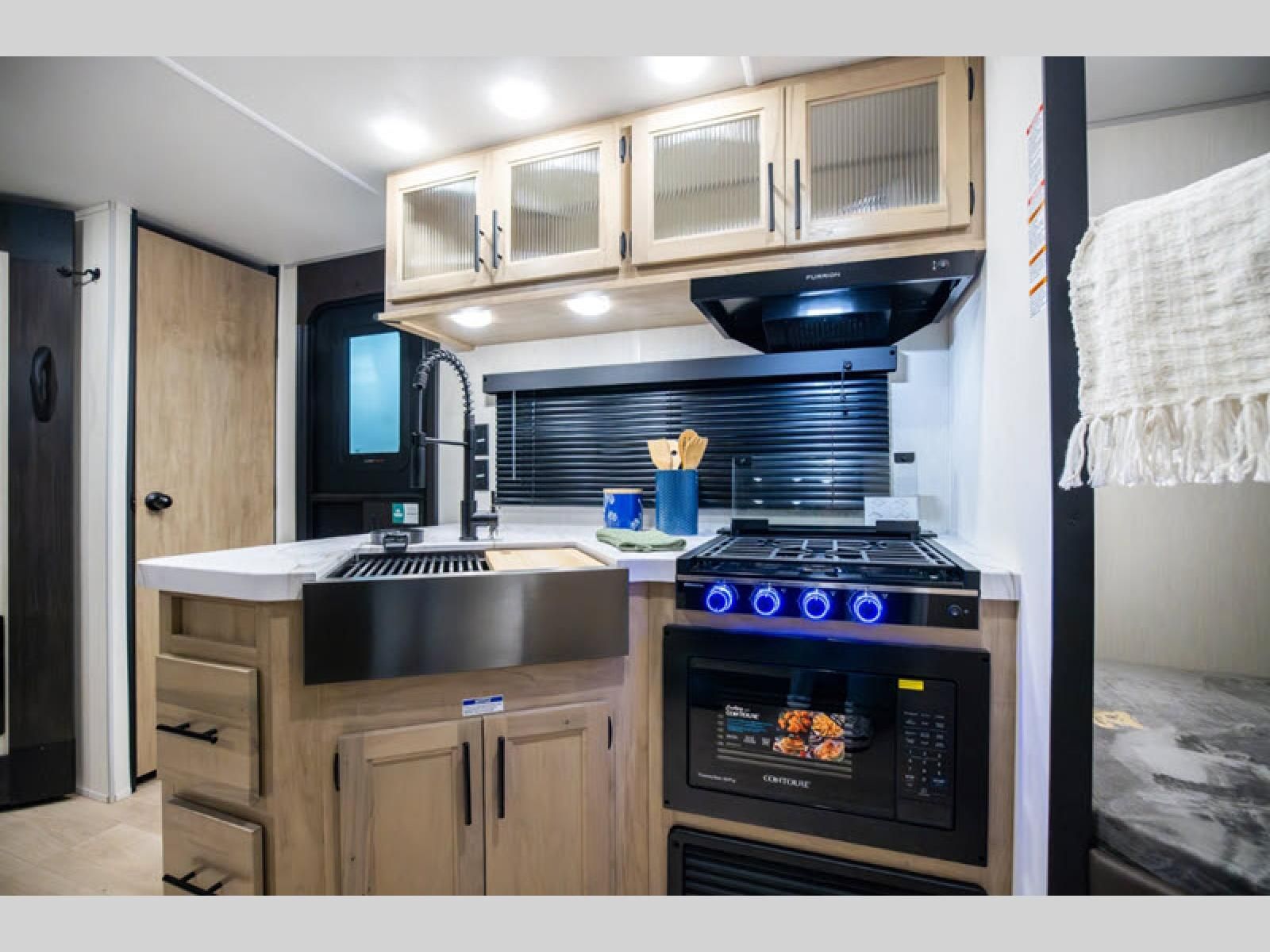 Enjoy time at the campground in this spacious travel trailer with a front private bedroom and double-size bunks for guests! The front bedroom has a wardrobe and shelf for you to store your clothing and essentials. The full interior kitchen and outside kitchen will let you make meals each day, and everyone can dine around the U-shaped dinette, which can service as extra sleeping space if needed. Or dine under the 15' awning outside! This unit also includes ample storage space, including hidden shelves behind the fireplace and outside storage!