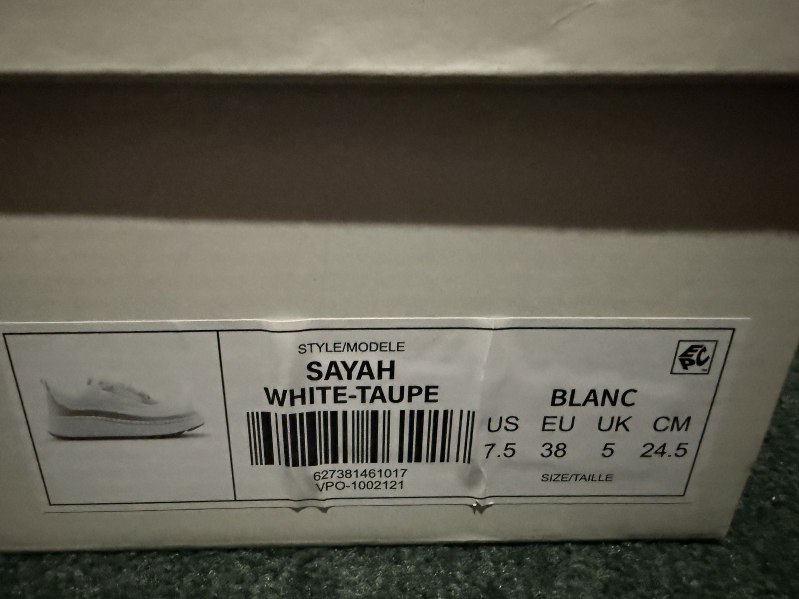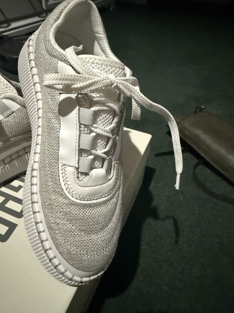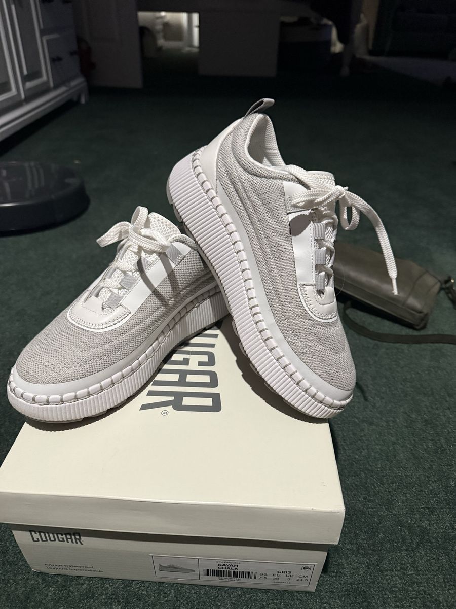VenmoLike new didn’t fit size 7.5 comfy walking and working in gym shoes. Cougar, color sayah chalk white with greyish-white canvas outer.
