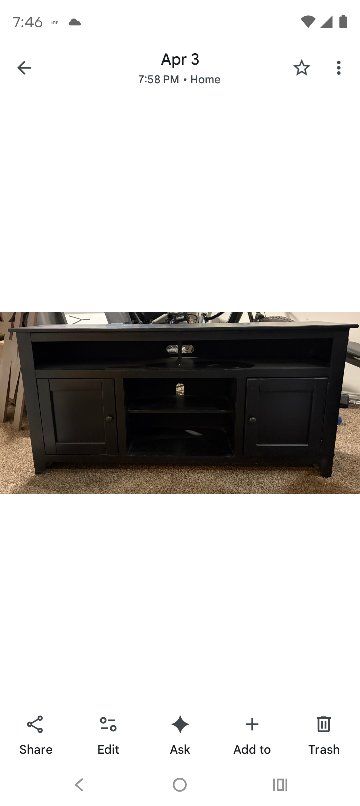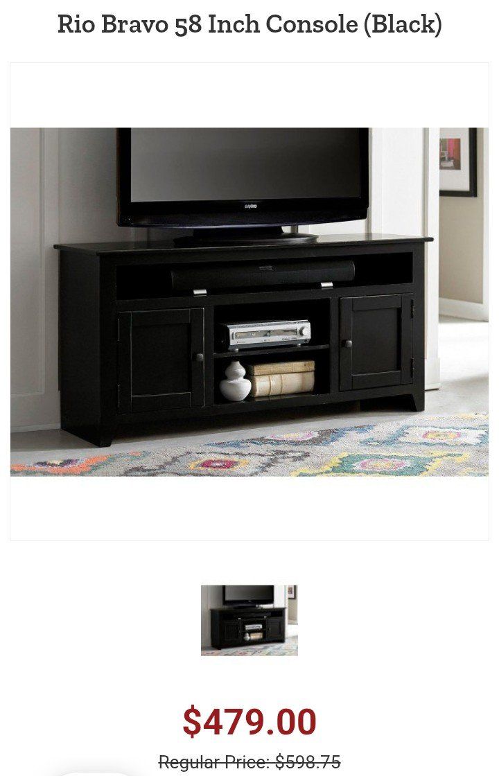 VenmoProgressive Furniture Rio Bravo 58" Console. TV stand from solid pine. For TVs up to 65". Central open soundbar shelf, 2 cabinet doors with adjustable shelving. 58"L x 28"H x 17"D. $150.