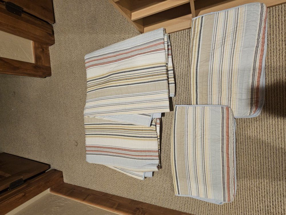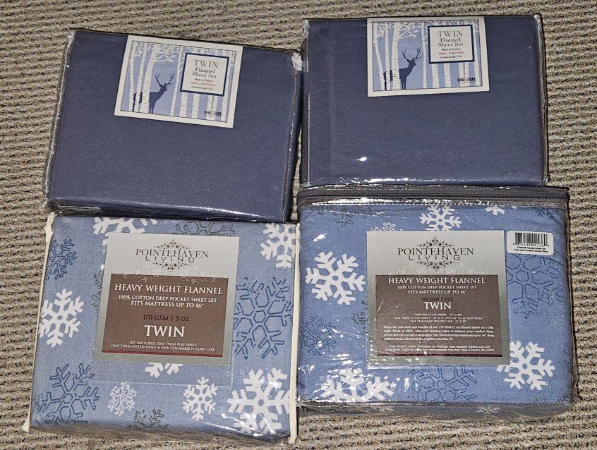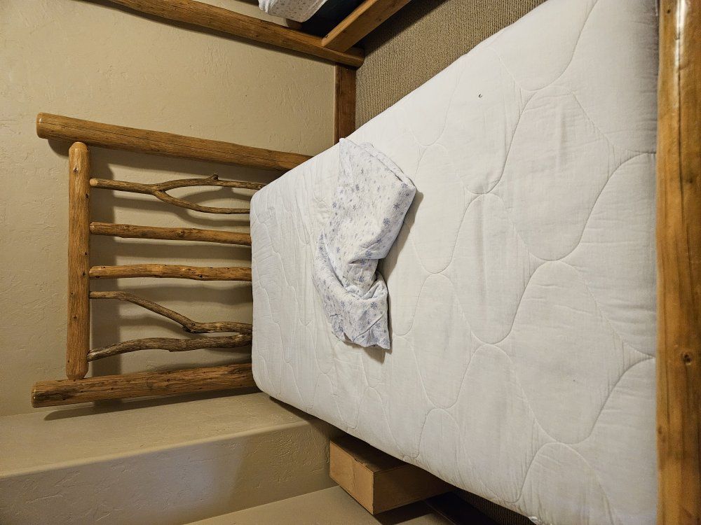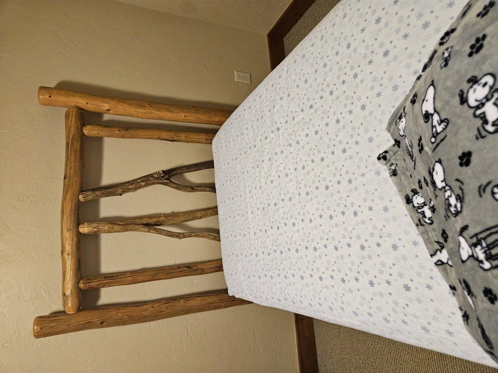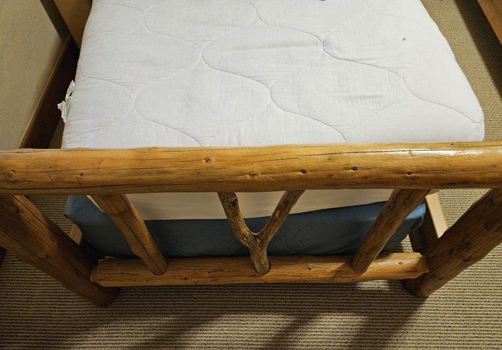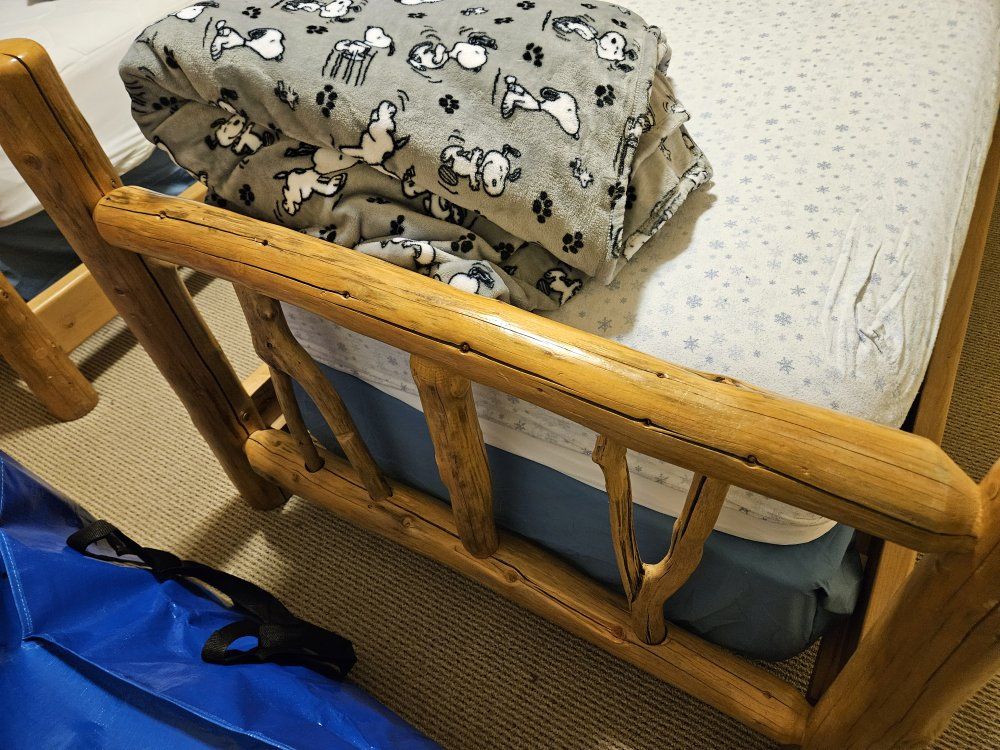 Pair of solid wood twin log beds with mattresses, 2 sets of brand new flannel sheets (2 pair), bedspreads, pillow shams, and 2 comforters. Great condition. Already disassembled for easy pickup. You must load.