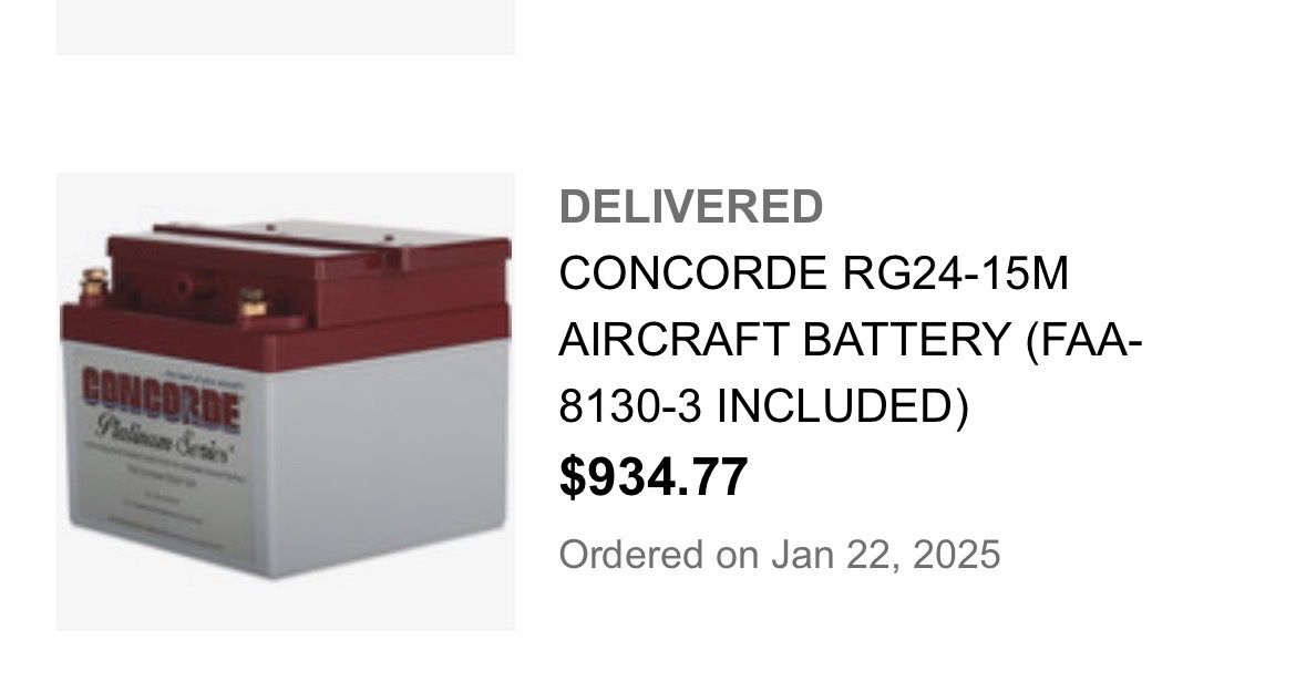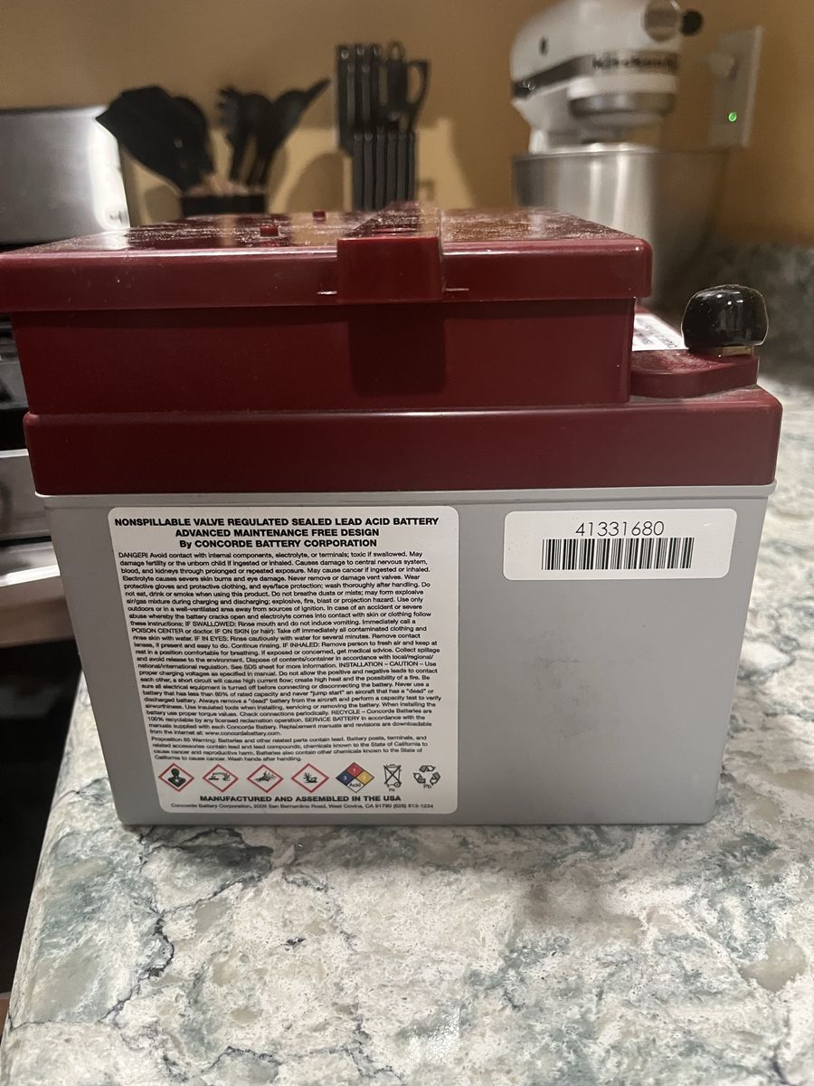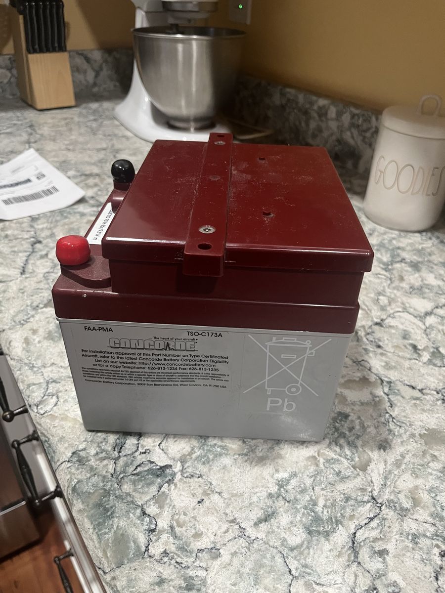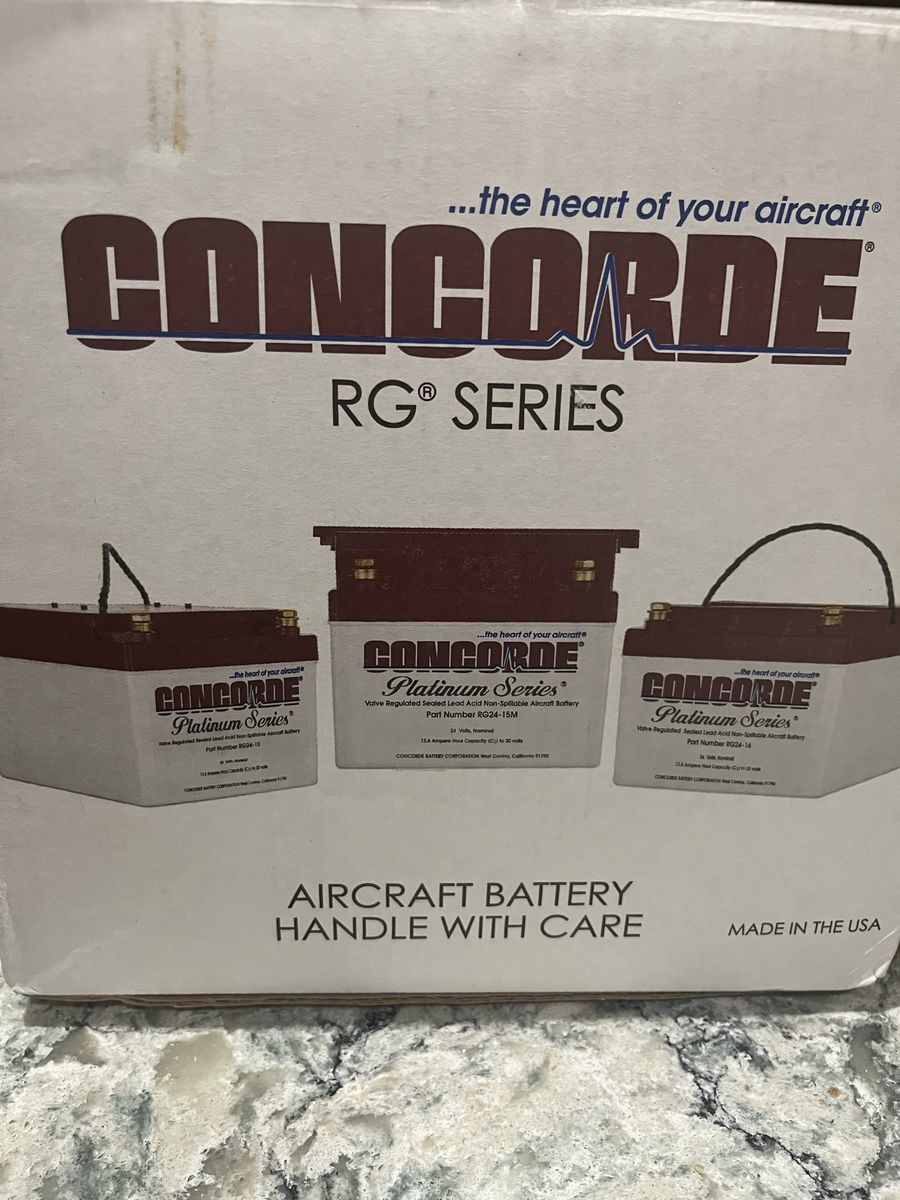 ZelleConcord 24 volt battery platinum series RG 24-15M This is a New never installed premium battery Cost me over 900 But it doesn’t fit my Cessna so I will sacrifice it for only 400