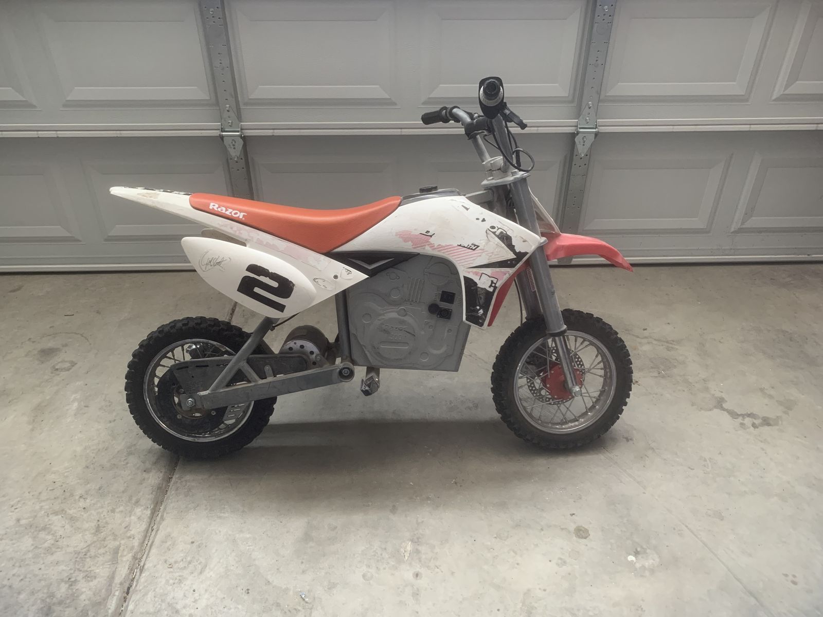 the razor mx500 was my kids first motorcycle. it is electric and goes around 15-17mph. This bike was great for leaning balance point and basic riding skills before adding the speed and in between hitting the dirt. It has new batterie. I upgraded them to three 12v 20Ah battery to give it a longer riding time. It comes with charger and extra brake pads i bought them when i got the batteries just in case. i adjusted the brakes and it stops well. The tires have ok tread.