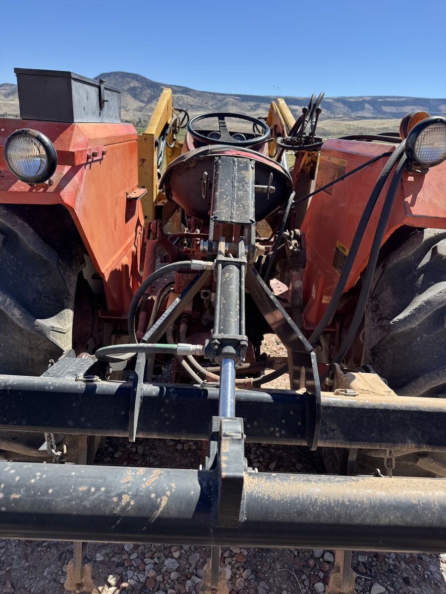 50 HP diesel tractor 8 speed transmission PTO HP 51.4@540 RPM Tractor runs excellent, all lights and all gauges work. All tan is present and in great shape. Including girl, not shown in picture.. This tractor has lived a life of leisure and has spent the last 27 years, mostly parked inside. Very well maintained, nothing broken or farmer welded. The loader bucket curl function does bleed down and will need a hydraulic ram rebuild. No real leaks anywhere. Includes: loader, scraper blade, two bottom plow, auger with two bits.