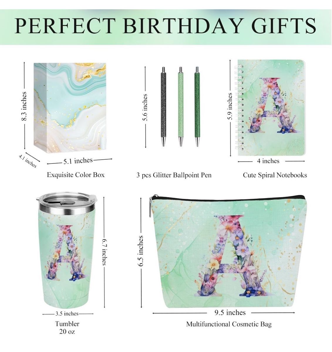 ApplePayBeautiful 6-piece gift set! Brand New! Retails for $40+tax Pick up in Centerville features a mint green marble and floral monogram 'A' design. Set includes a 20 oz stainless steel insulated tumbler with lid, a 9.5-inch zippered cosmetic bag, a spiral notebook, and three glitter ballpoint pens. Items come in a matching decorative gift box.
