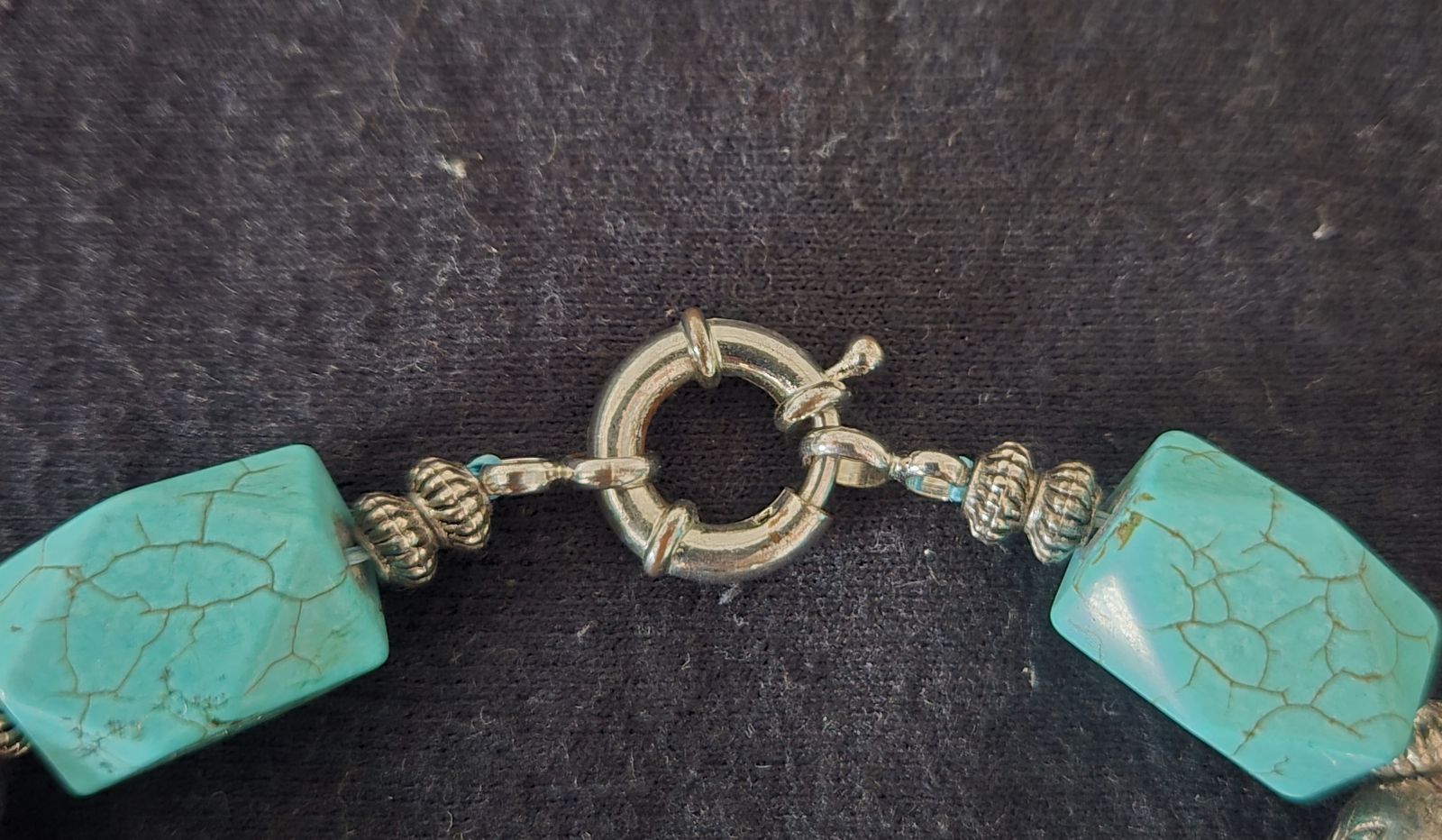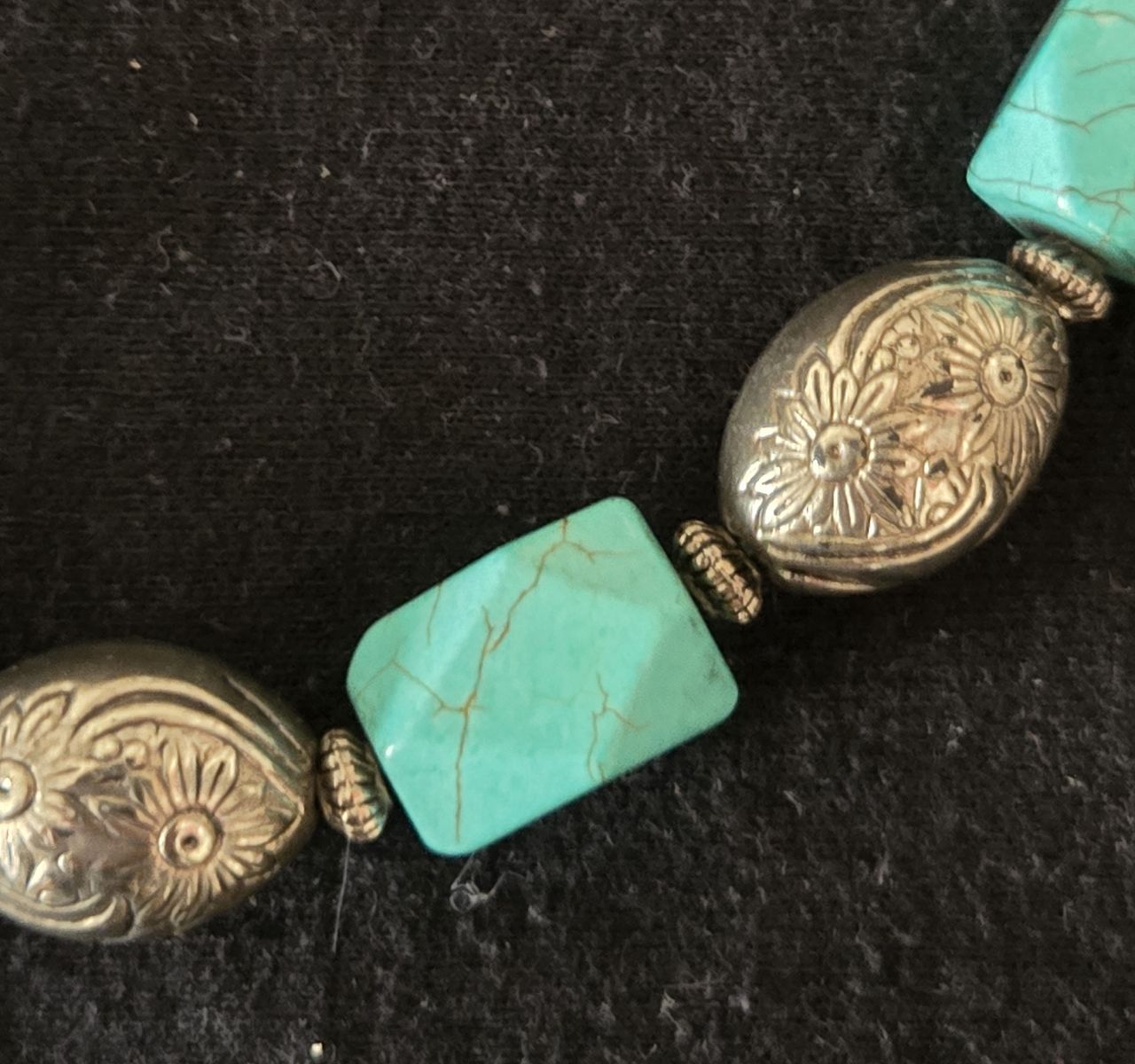 ZelleVintage 1980’s Large Faux Faceted Veined Turquoise and Silvertone Engraved Sunflowers Beaded Necklace