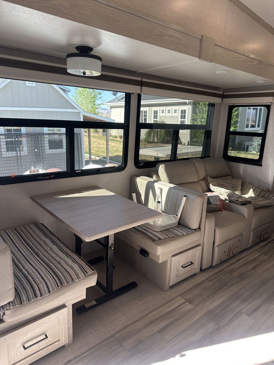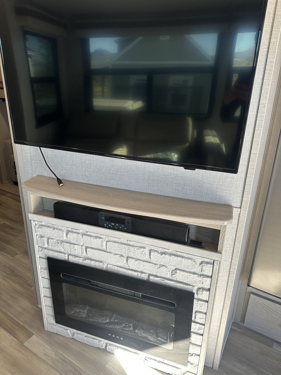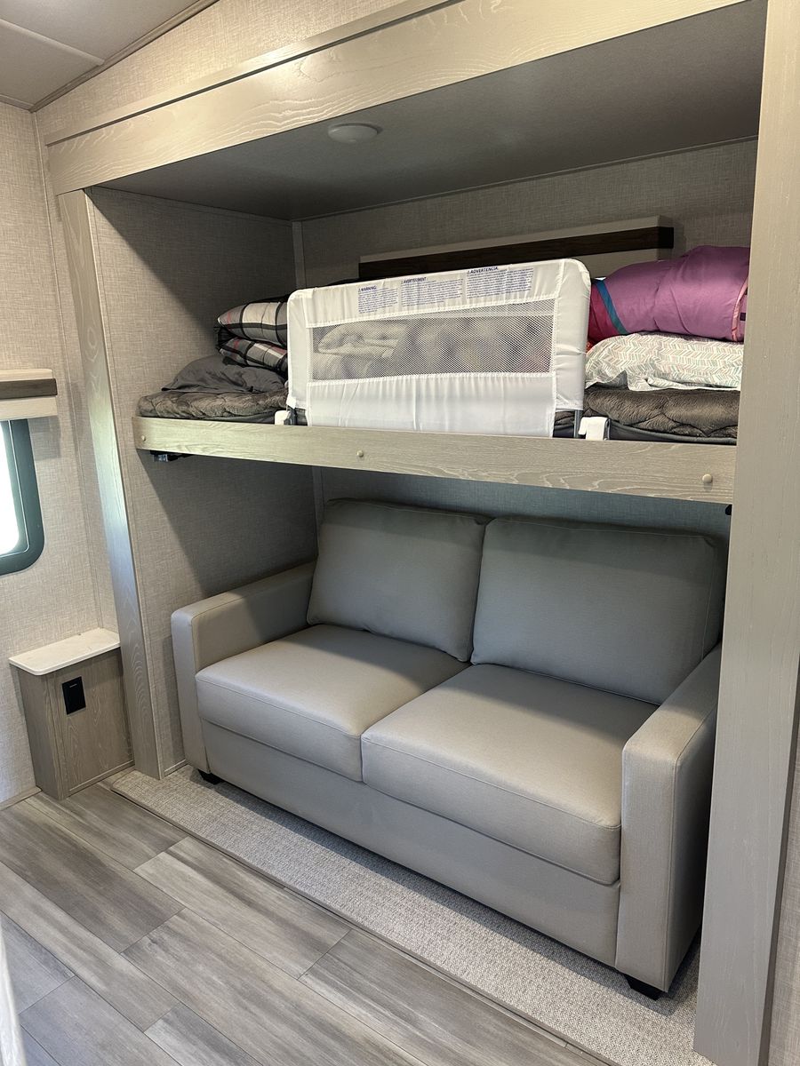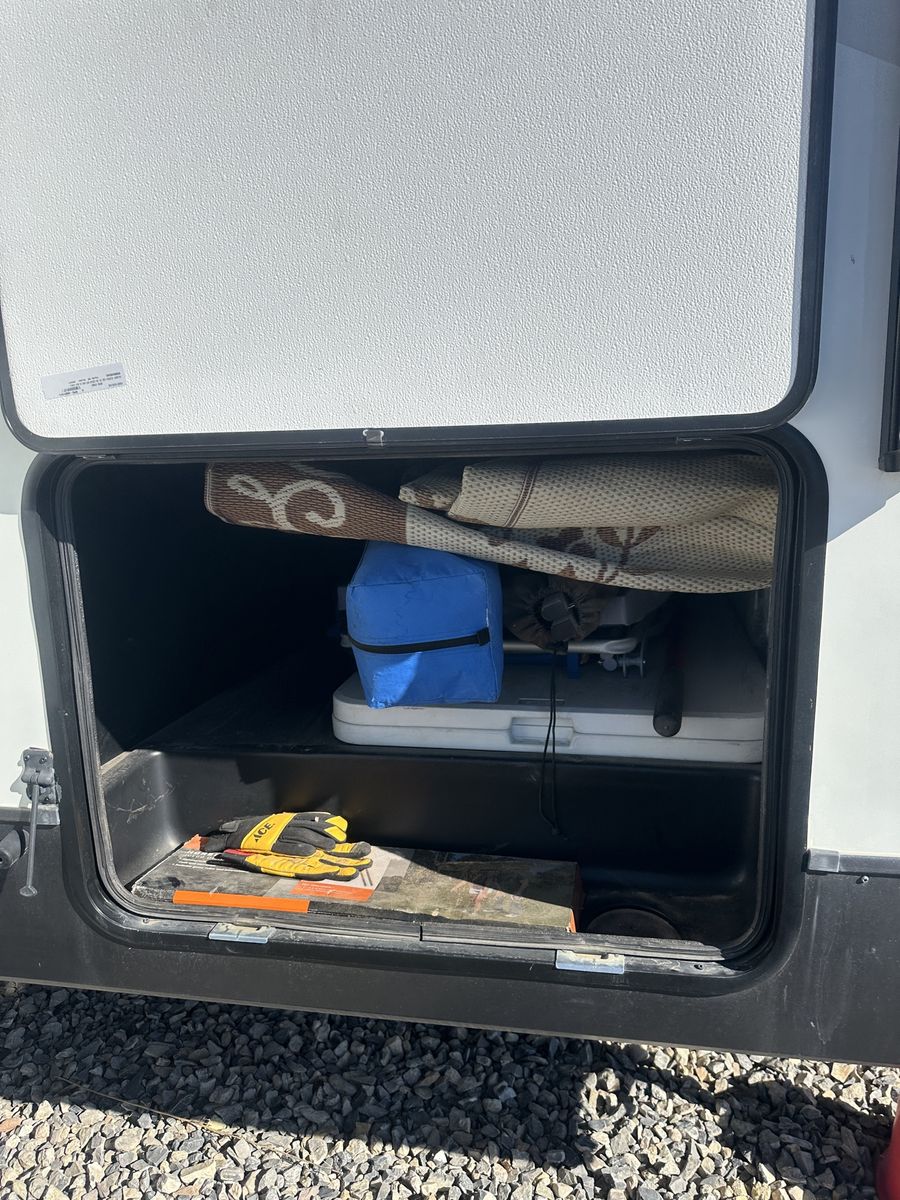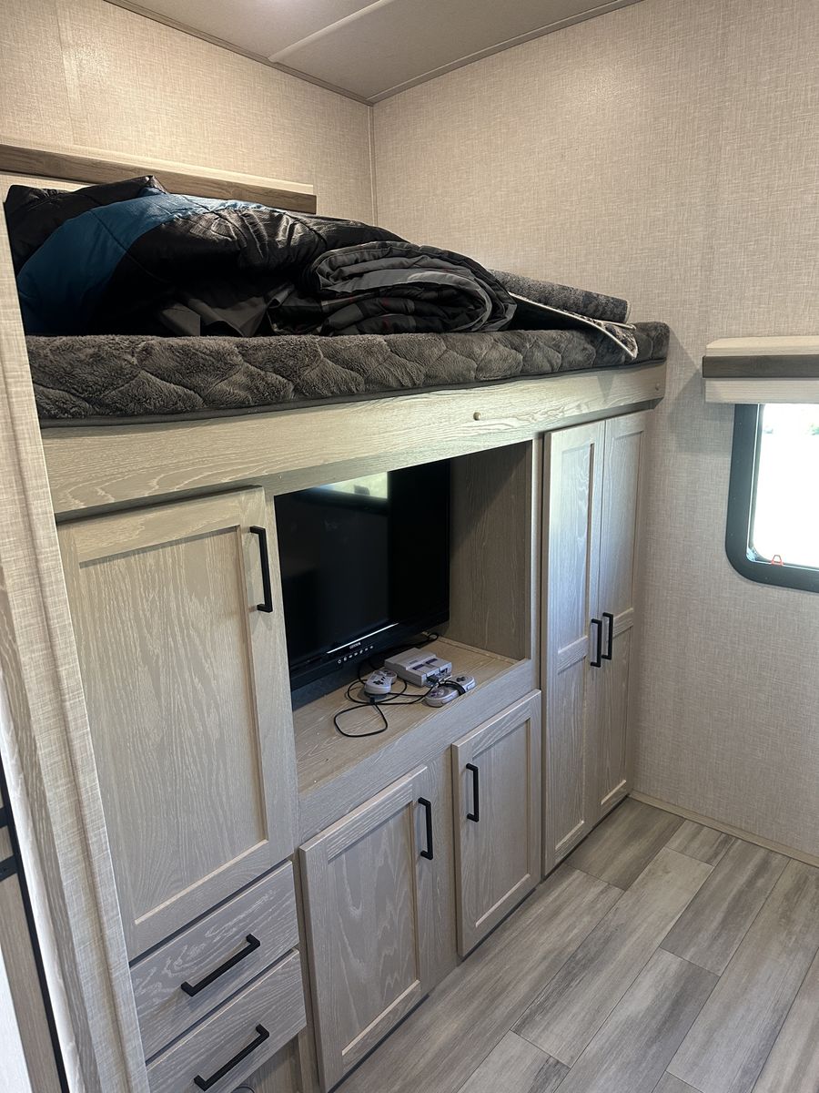 Barely used, only five trips in 3 years, 37 foot, 5th wheel, great storage, bunk beds, auto leveling, outside kitchen with grill, outside speakers, awning, rear storage rack, tow package for doubles, heat, air conditioning, solar panels, 1.5 bathrooms, sleeps 6 comfortably, rear bunkhouse, two tv’s, electric fireplace, lots of space, large fridge, pantry, three pop outs, two reclining chairs in main living space, tire pressure monitoring system.