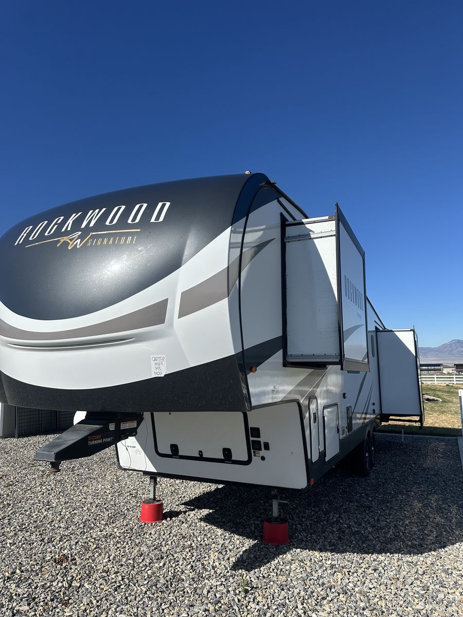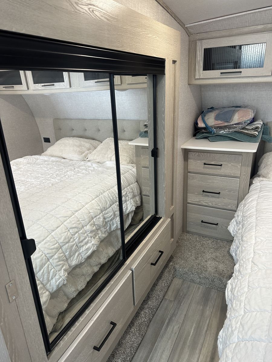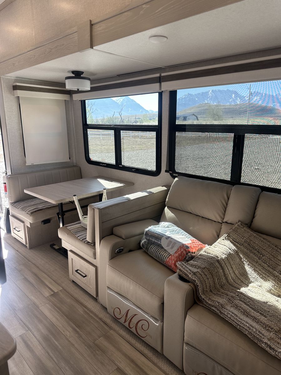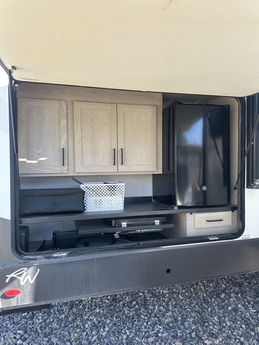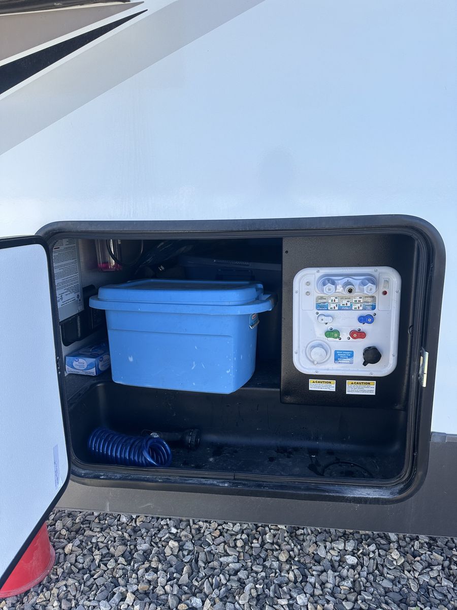 Barely used, only five trips in 3 years, 37 foot, 5th wheel, great storage, bunk beds, auto leveling, outside kitchen with grill, outside speakers, awning, rear storage rack, tow package for doubles, heat, air conditioning, solar panels, 1.5 bathrooms, sleeps 6 comfortably, rear bunkhouse, two tv’s, electric fireplace, lots of space, large fridge, pantry, three pop outs, two reclining chairs in main living space, tire pressure monitoring system.