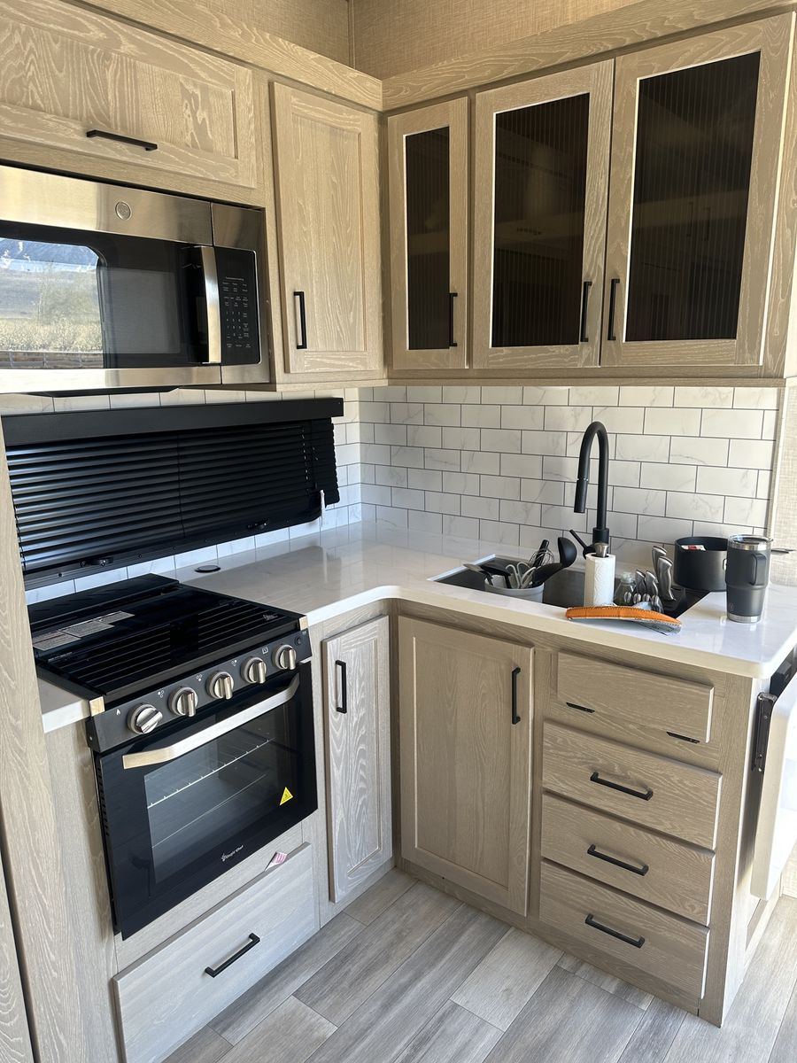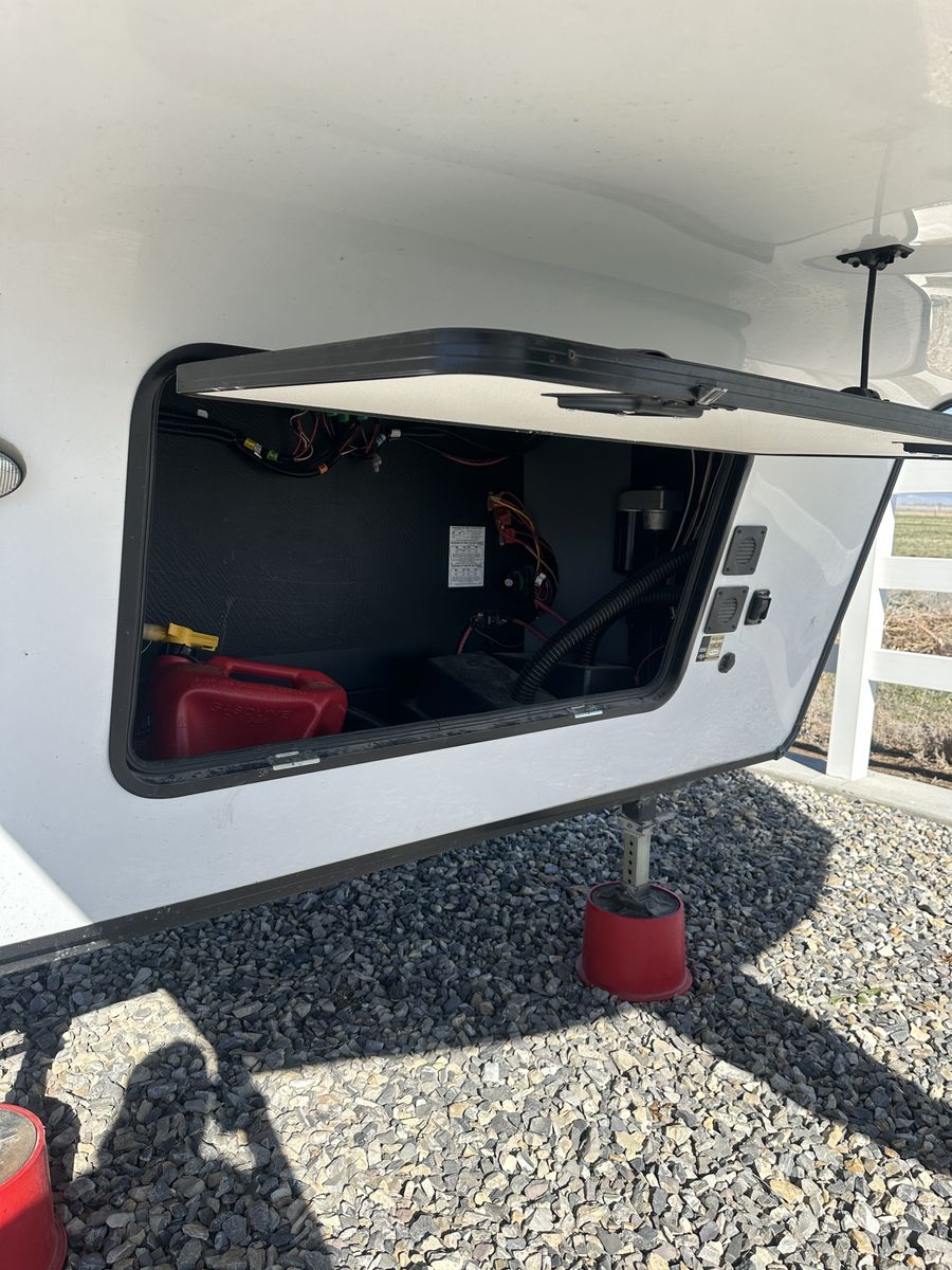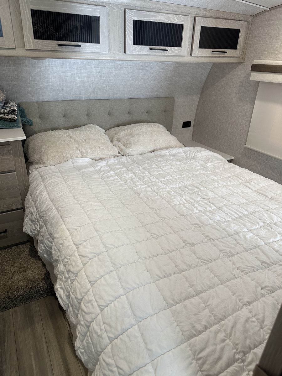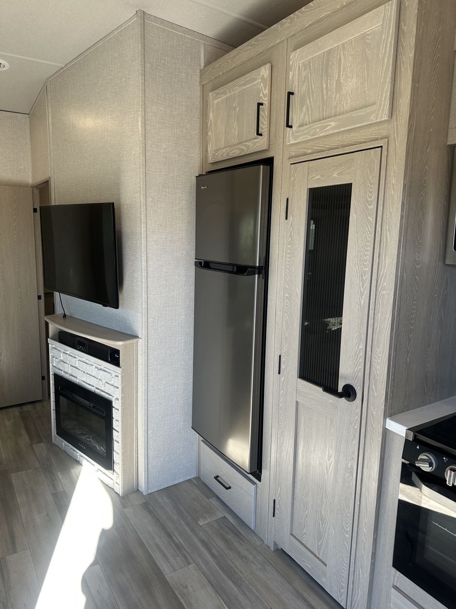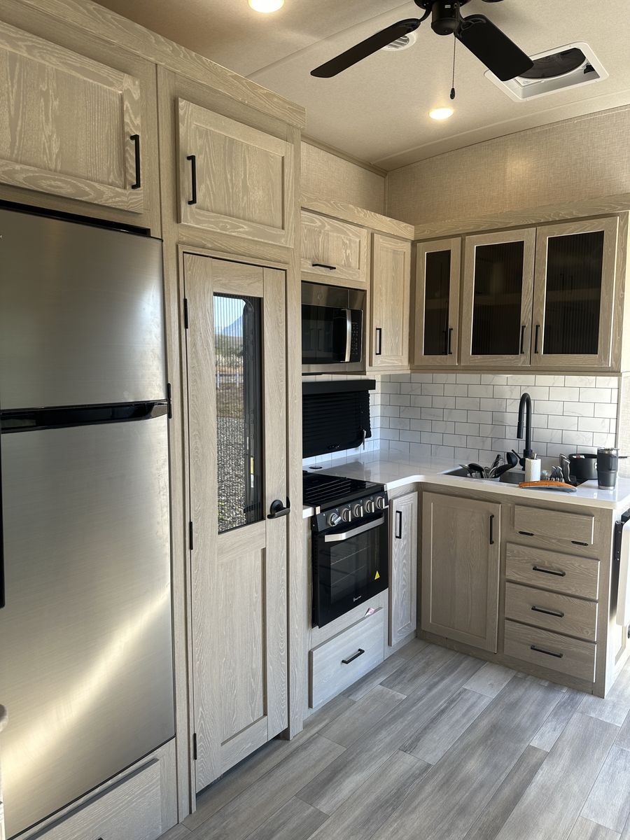 Barely used, only five trips in 3 years, 37 foot, 5th wheel, great storage, bunk beds, auto leveling, outside kitchen with grill, outside speakers, awning, rear storage rack, tow package for doubles, heat, air conditioning, solar panels, 1.5 bathrooms, sleeps 6 comfortably, rear bunkhouse, two tv’s, electric fireplace, lots of space, large fridge, pantry, three pop outs, two reclining chairs in main living space, tire pressure monitoring system.