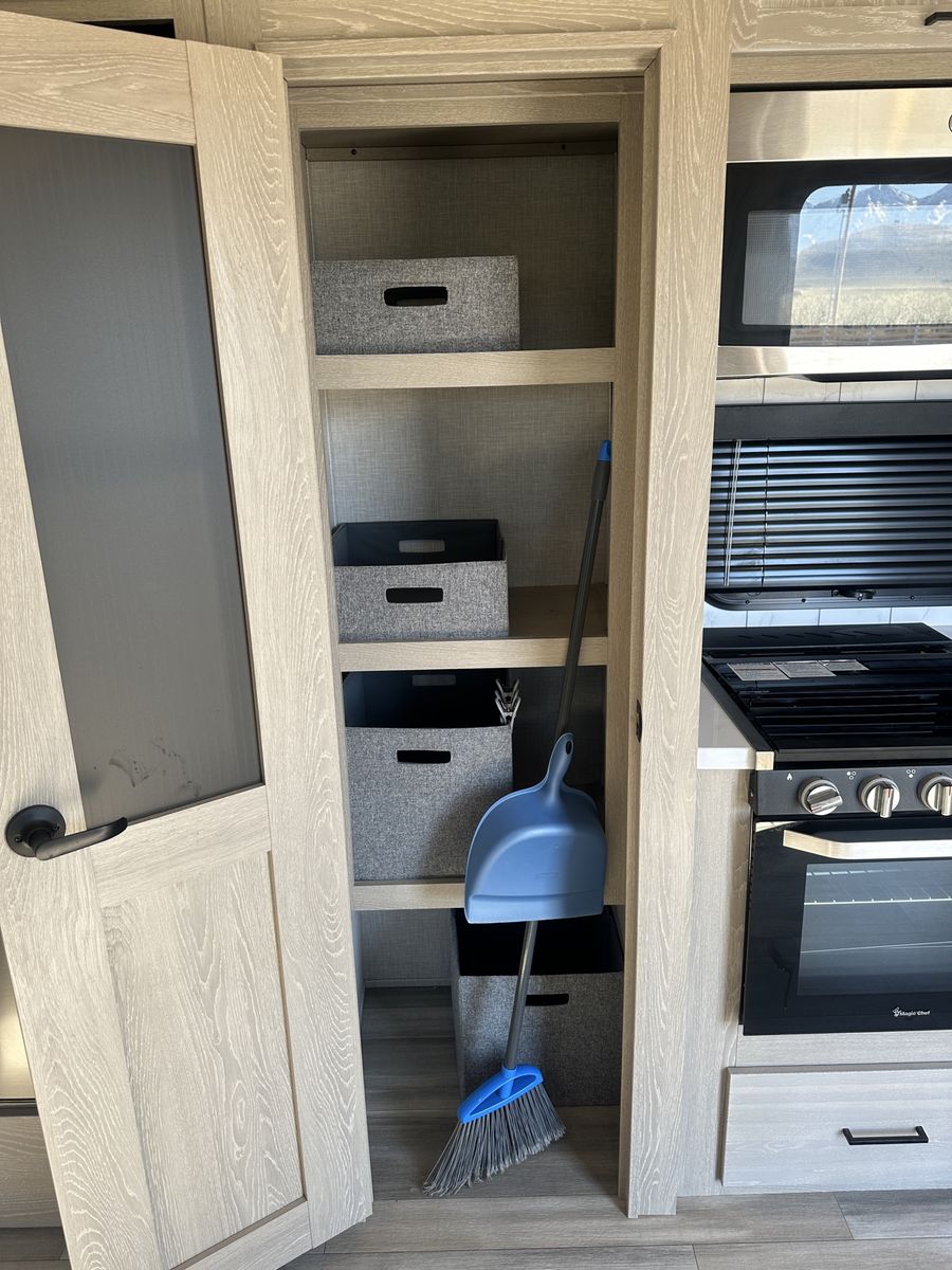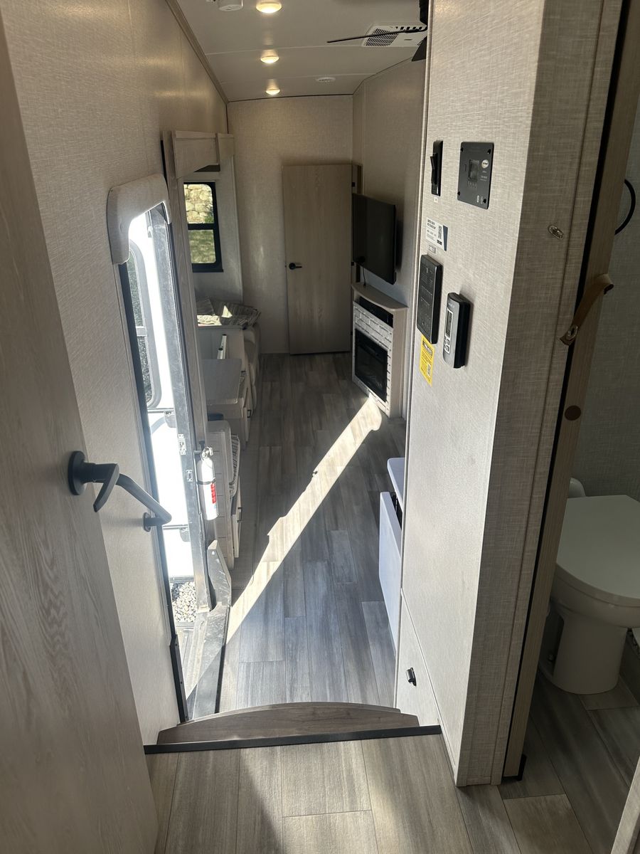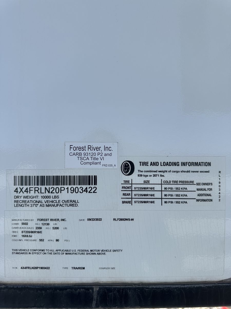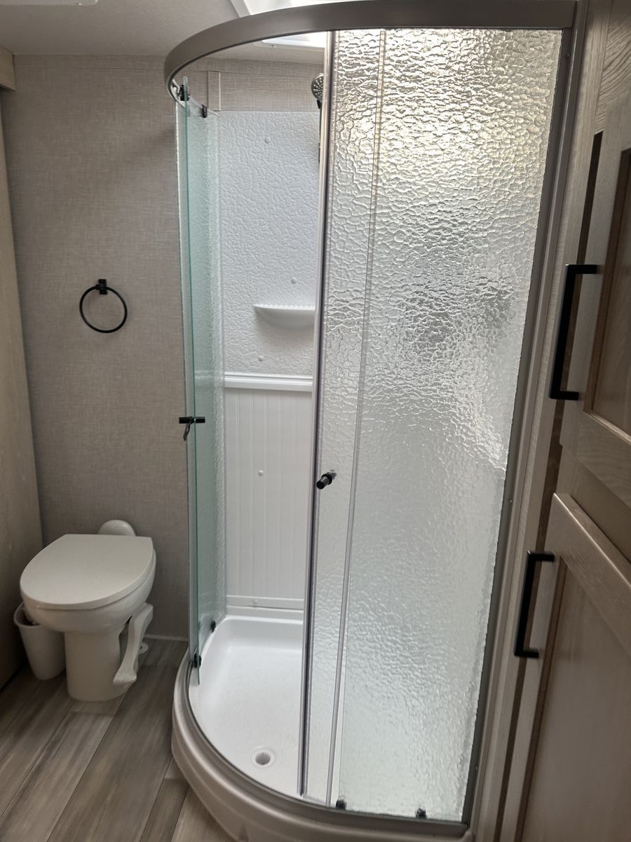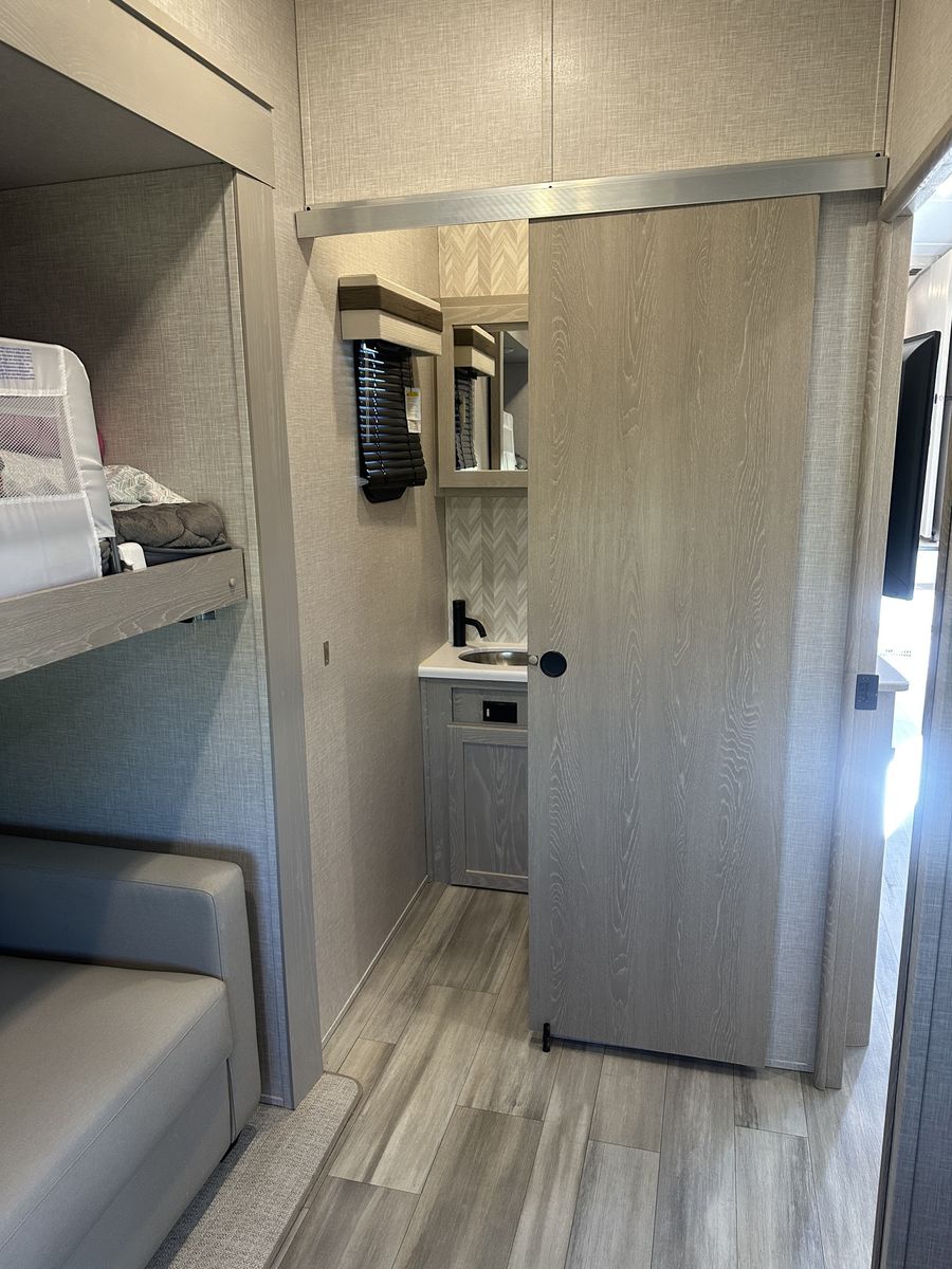 Barely used, only five trips in 3 years, 37 foot, 5th wheel, great storage, bunk beds, auto leveling, outside kitchen with grill, outside speakers, awning, rear storage rack, tow package for doubles, heat, air conditioning, solar panels, 1.5 bathrooms, sleeps 6 comfortably, rear bunkhouse, two tv’s, electric fireplace, lots of space, large fridge, pantry, three pop outs, two reclining chairs in main living space, tire pressure monitoring system.