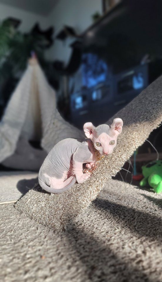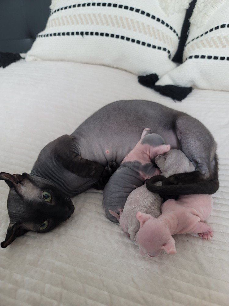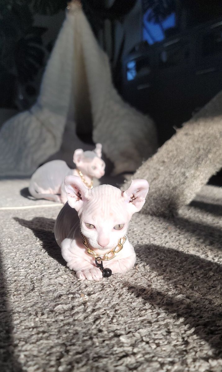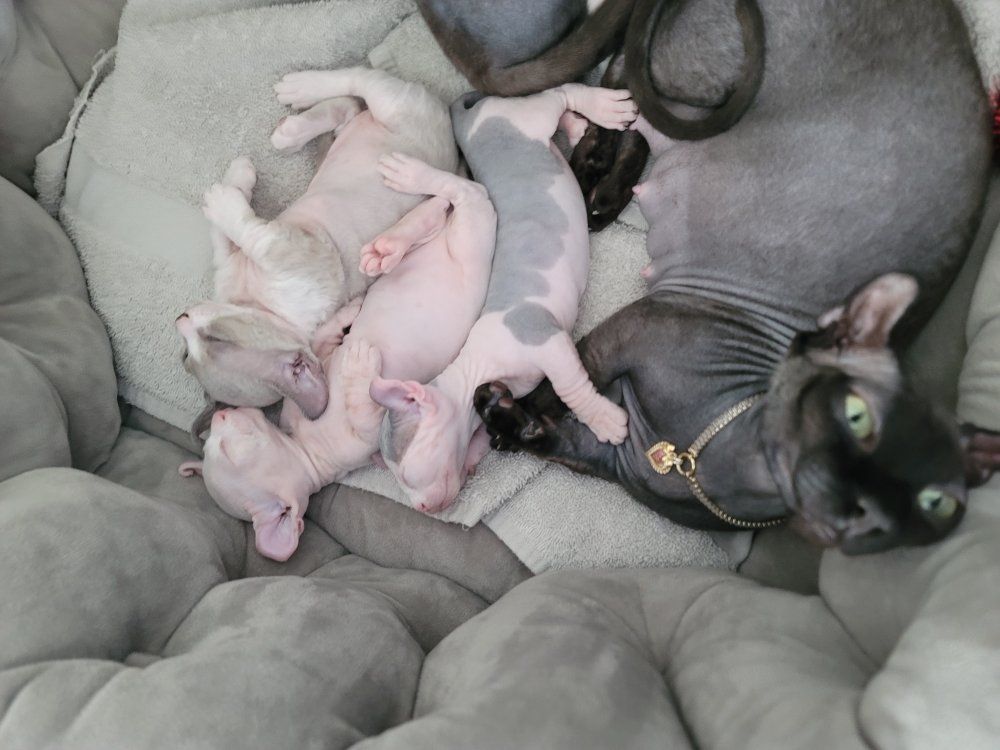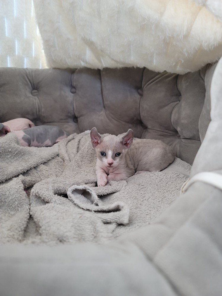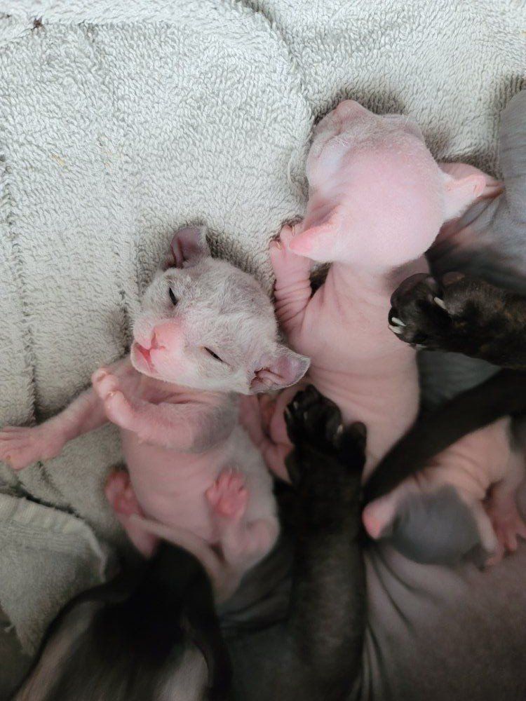 Venmo3 Healthy dwelf sphynx kittens born Feb 19th. Cute curled elf ears, short bambino legs, bicolored naked girl ($2000), pink naked boy($2000), and silver devon rex short wavy haired girl($2500).