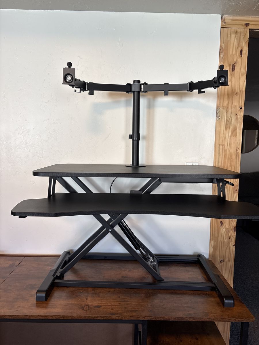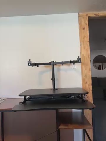 VenmoDual computer monitor mount for the top of desk. Can be raised and lowered for standing or seated position. Turns an average desk into a standing desk.
