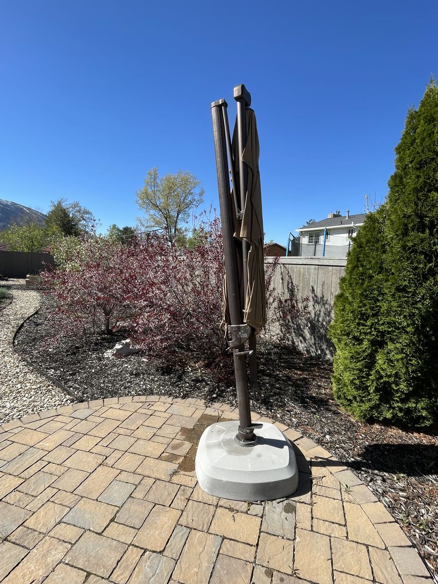 VenmoPatio Umbrella. 10' cantilever, offset, w heavy duty frame, stand and base. Treasure Garden brand $1200 new.
