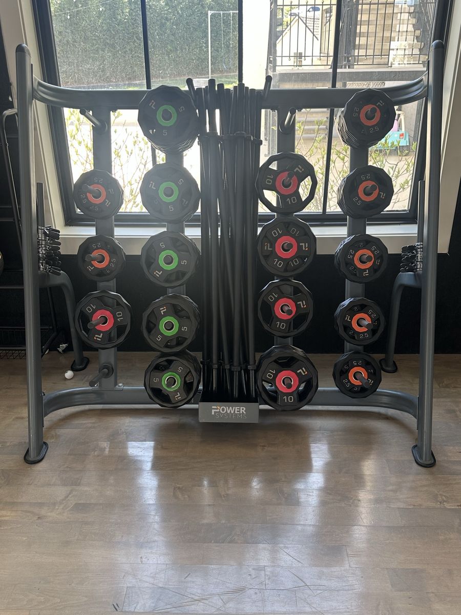 Dimensions: 31"L x 63"W x 58"H $150/set or $2000 for all (20) 51” Power Coated Steel Bars (24) 10lb Beveled Edge Durable Urethane Plates (40) 5lb Beveled Edge Durable Urethane Plates (38) 2.5lb Beveled Edge Durable Urethane Plates (32) Spring Collars