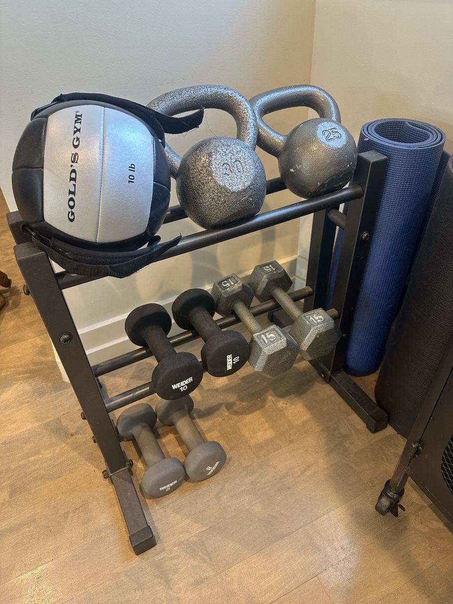 Comes with : 1 (10lb) medicine ball $20 1 (30lb) kettlebell $20 1 (25lb) kettlebell $15 1 set (15lb) Dumbbells $5 1 set (10lb) Dumbbells $5 1 set (8lb) Dumbbells $5