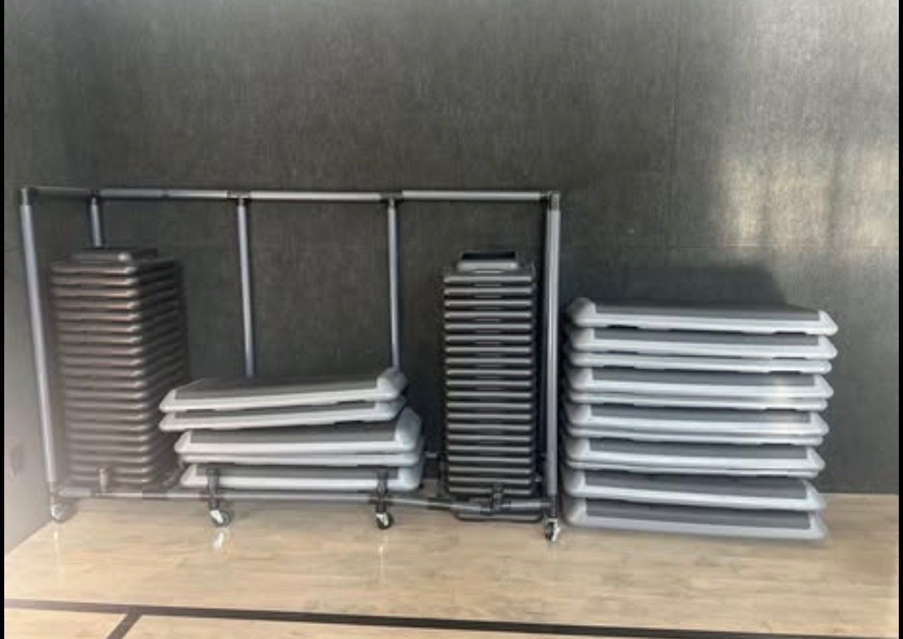 (18) The Step Health Club Size Platforms with rack and (36) risers Dimensions: (43" L x 16" W x 4" H)