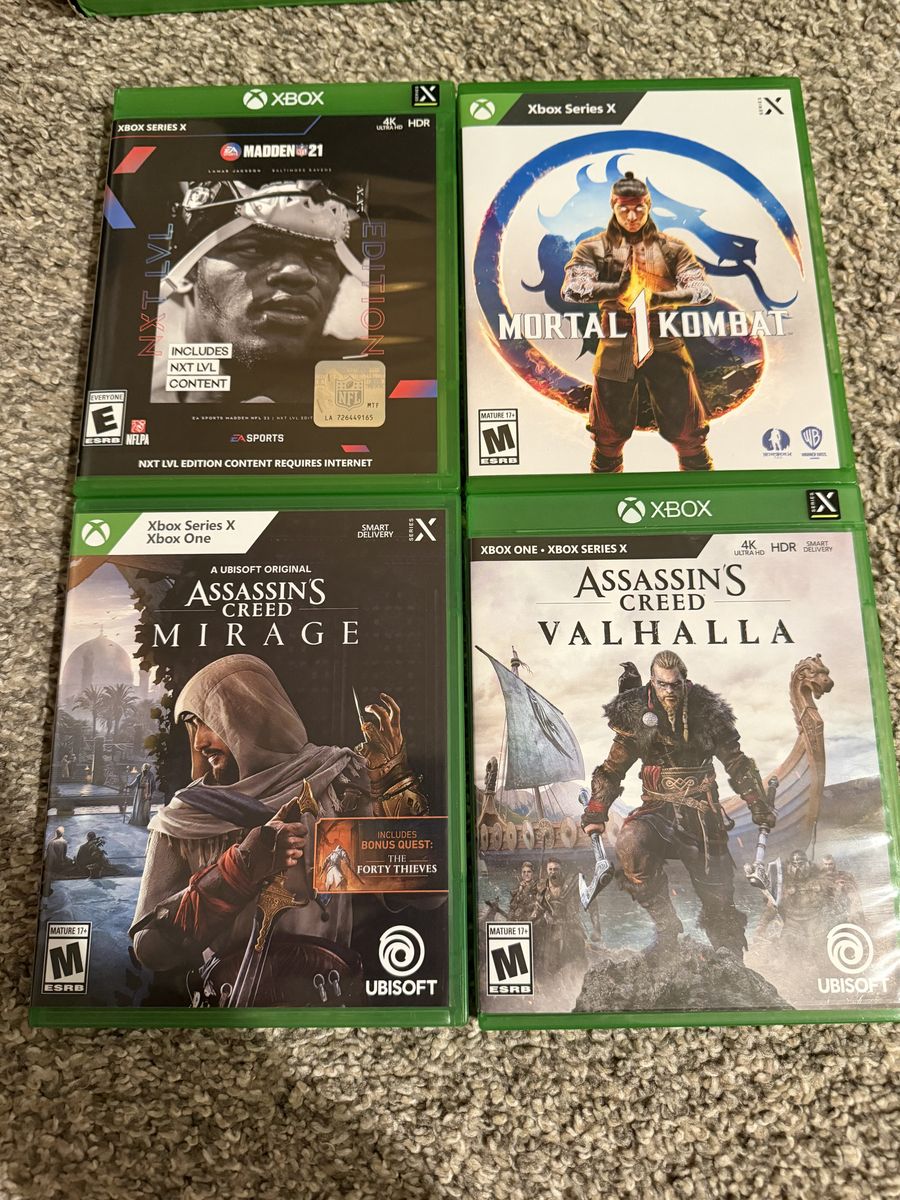 ∙ Xbox Series X console (original box) ∙ USB-C cable ∙ Power cable ∙ Black Xbox wireless controller ∙ Assassin’s Creed Valhalla ∙ Assassin’s Creed Mirage ∙ Mortal Kombat 1 ∙ Madden NFL 21 Console is in excellent condition — no scratches, no damage, barely touched.
