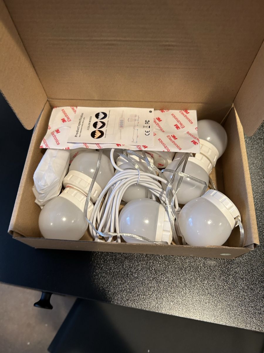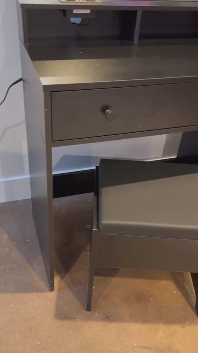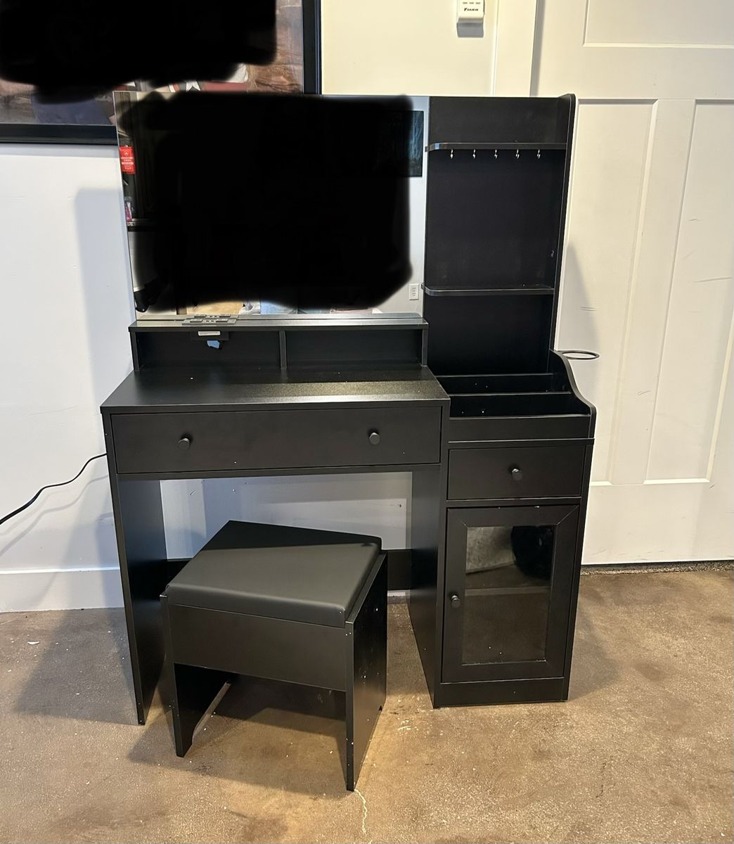 Here’s what it features: Two drawers, a cabinet with glass panel door, open shelving, jewelry hooks along the top, a built-in hot tool holder on the side, a padded black stool, usb and power outlet, and a set of stick-on vanity bulbs you can place along the mirror however you like.