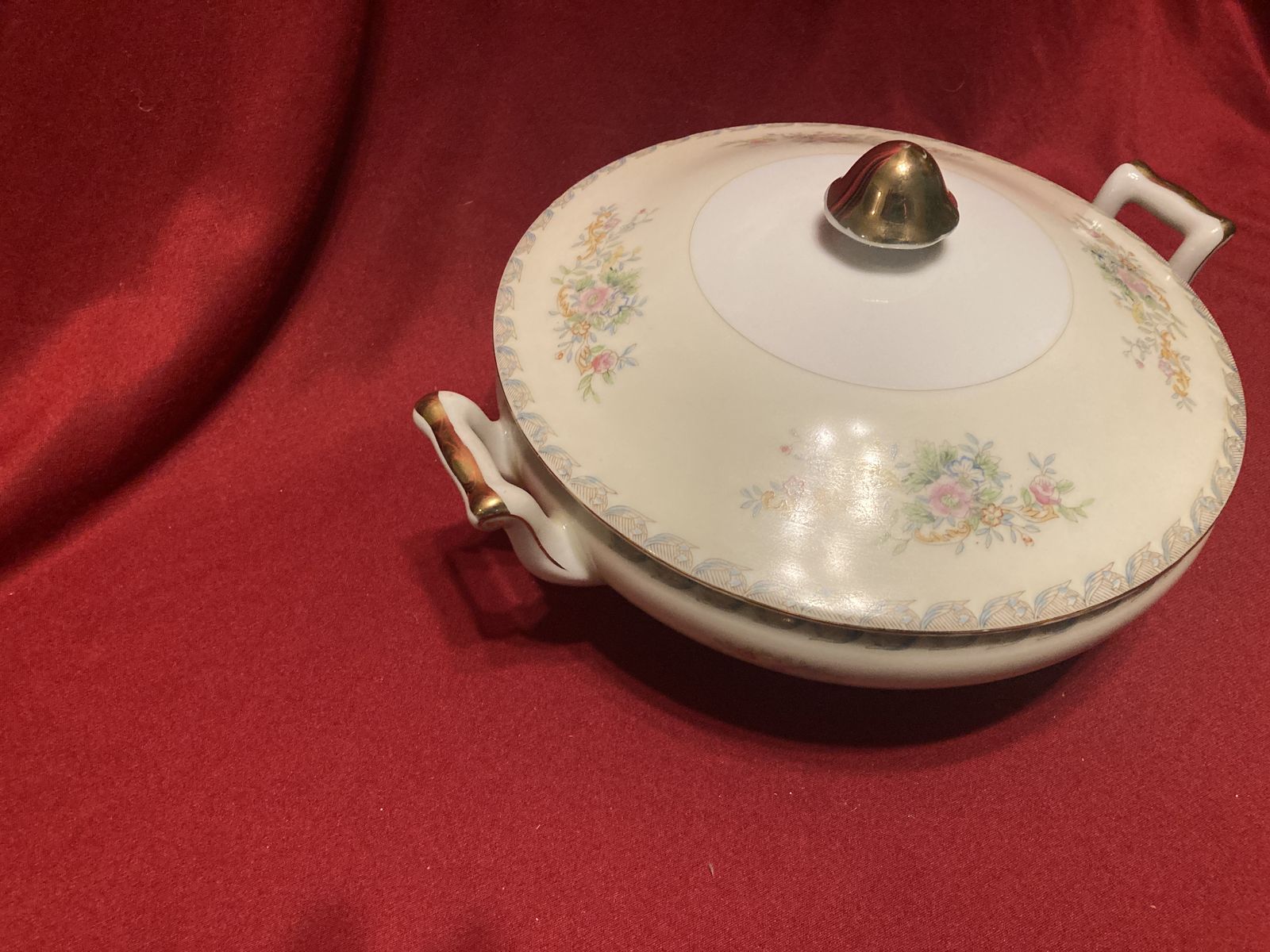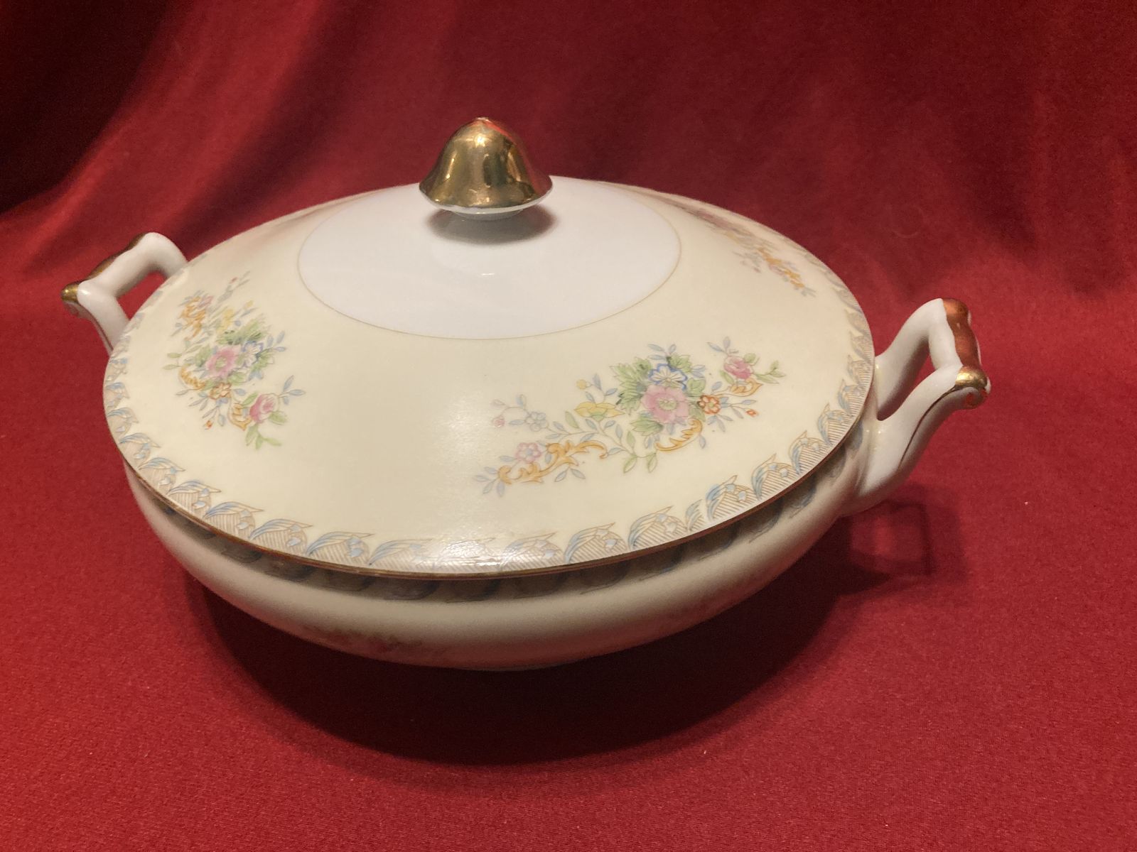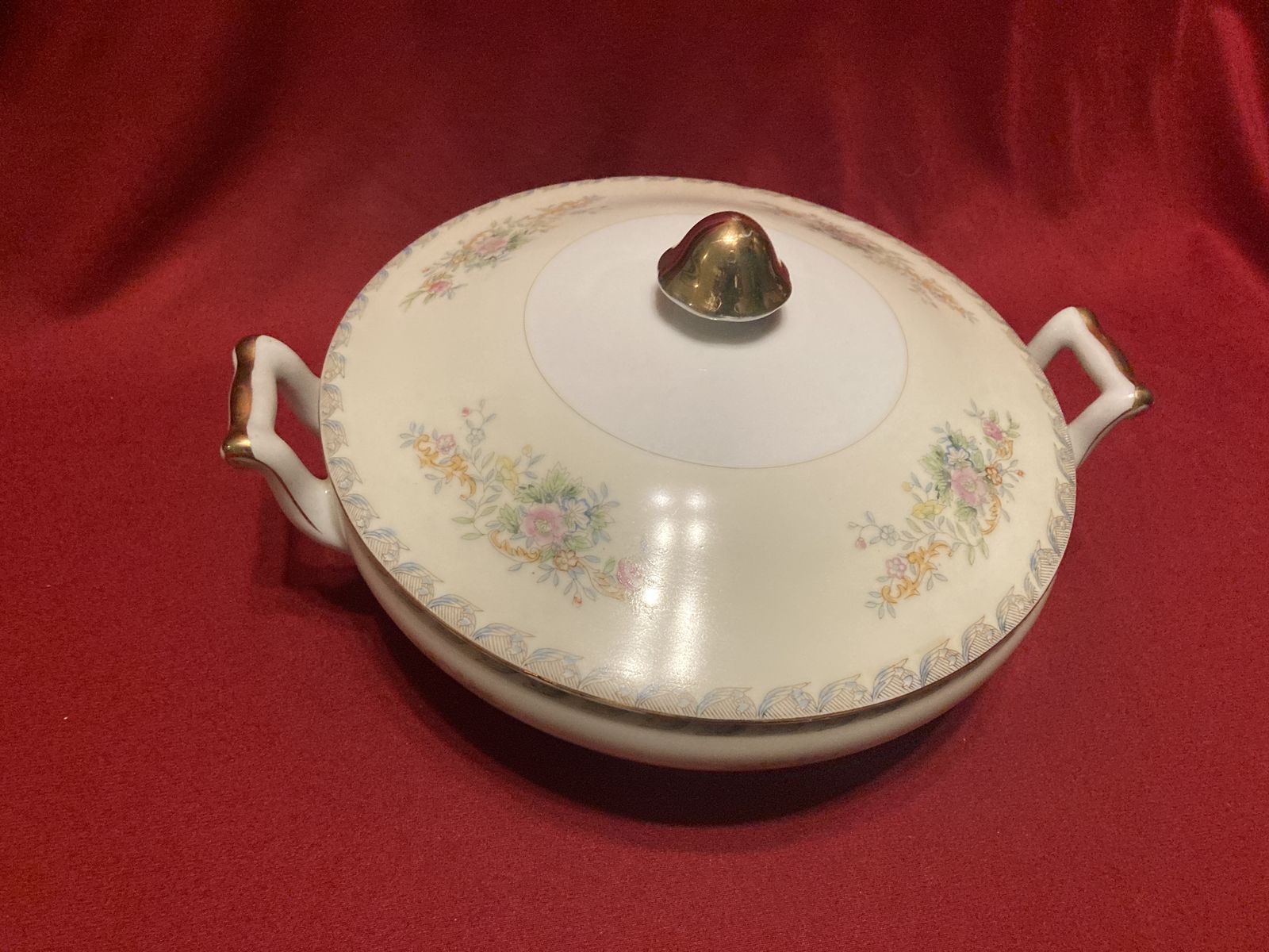 Hello I have a Vintage Gold China Vegetable Serving Bowl With Lid Very Nice Classy Vintage Style With Floral Design