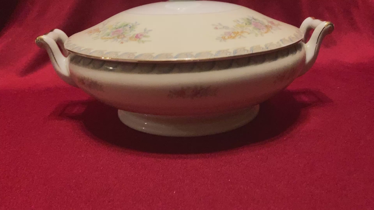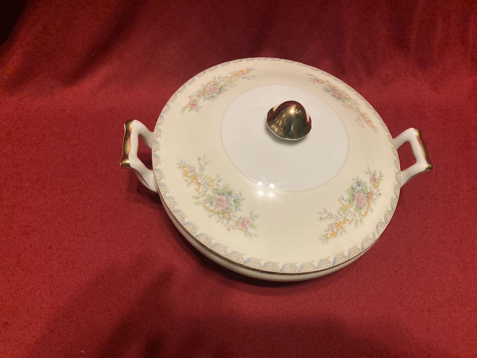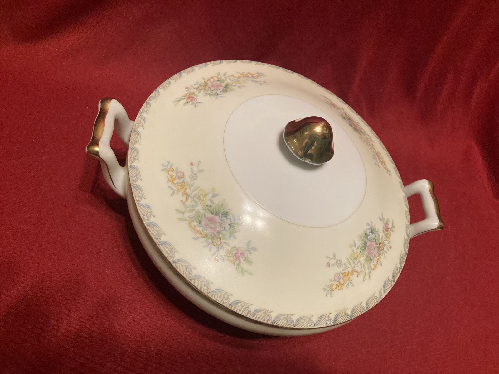 Hello I have a Vintage Gold China Vegetable Serving Bowl With Lid Very Nice Classy Vintage Style With Floral Design