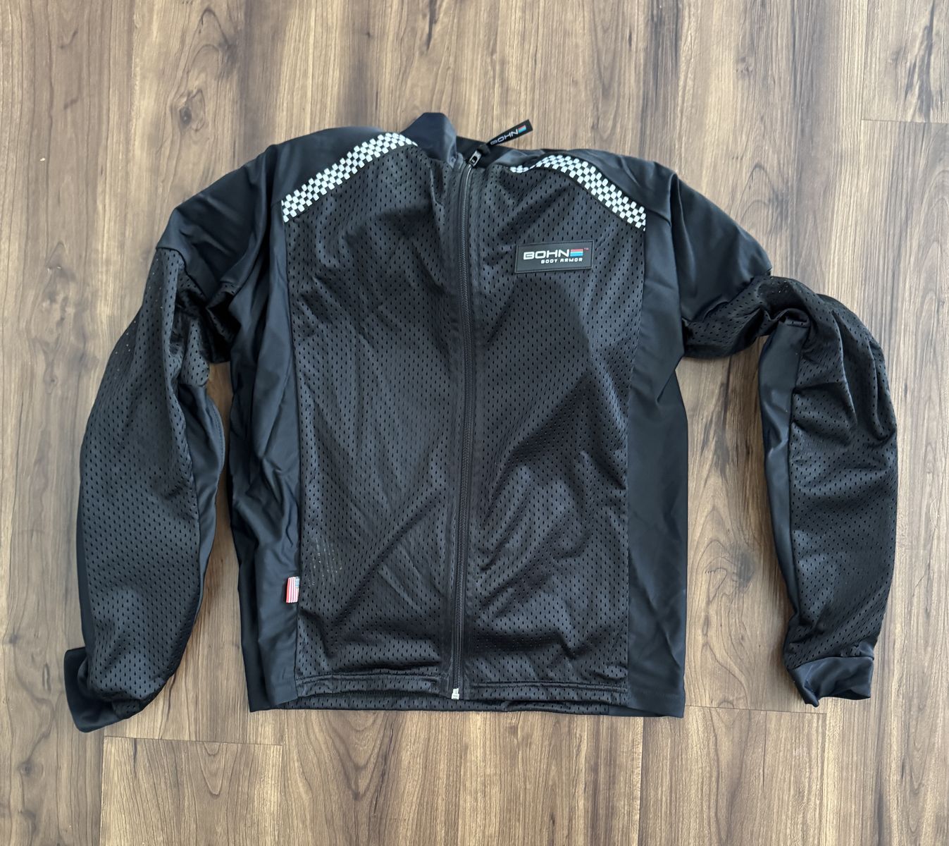 Sporty jacket style with checkered flag trim Convenient full-length front zipper—easy on, easy off Soft Lycra and mid-weight mesh construction Ventilated mesh comfort-great for all seasons Features: