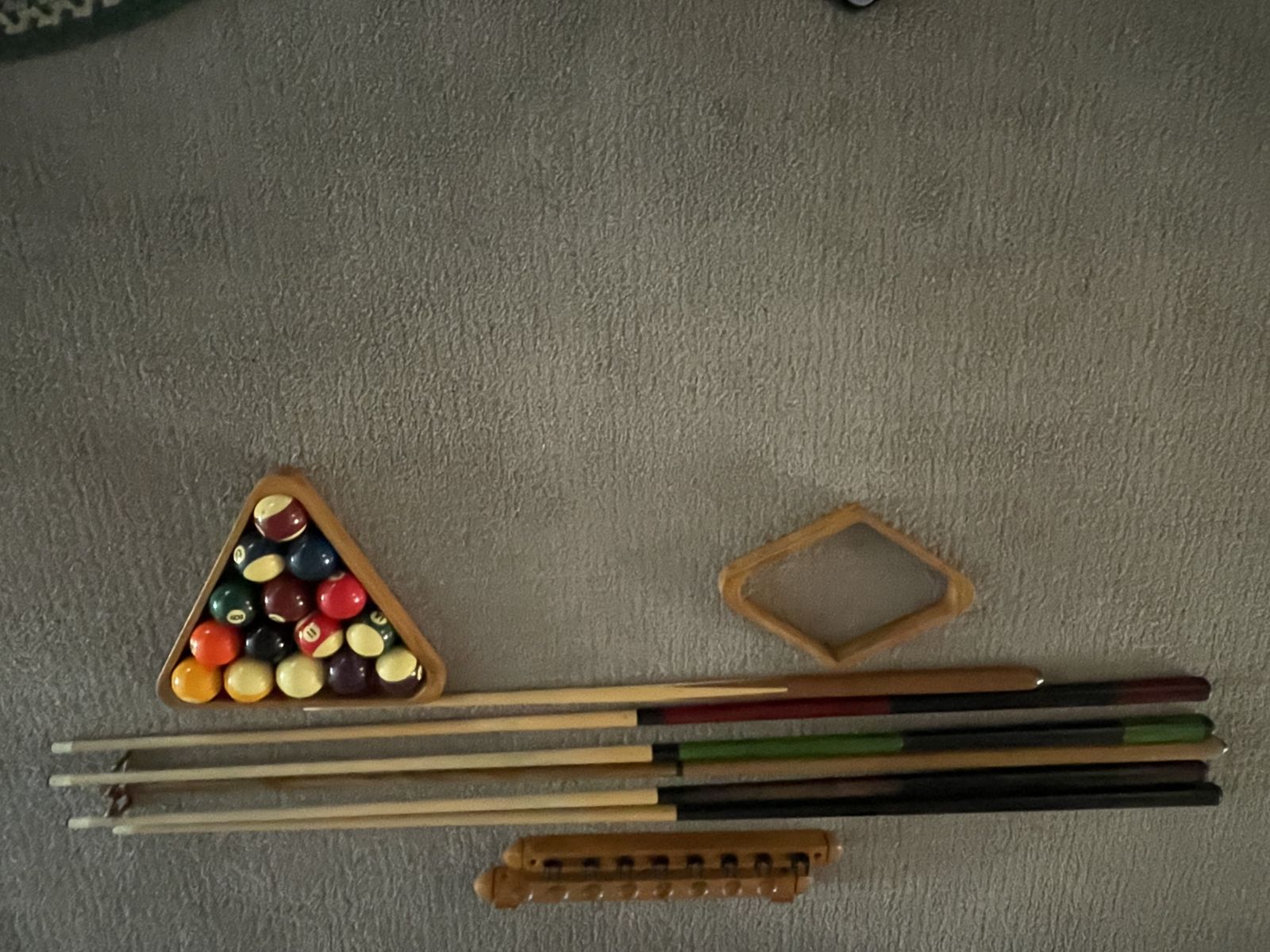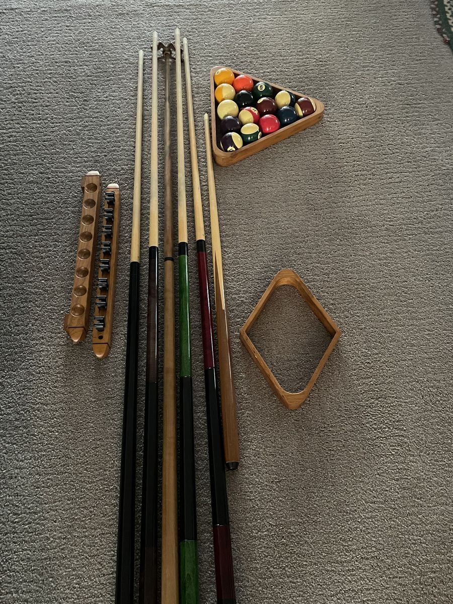 Venmo4 standard cues, 1 short cue, & 1 Granny stick. Cue rack, balls, 8-ball rack & 9 ball rack