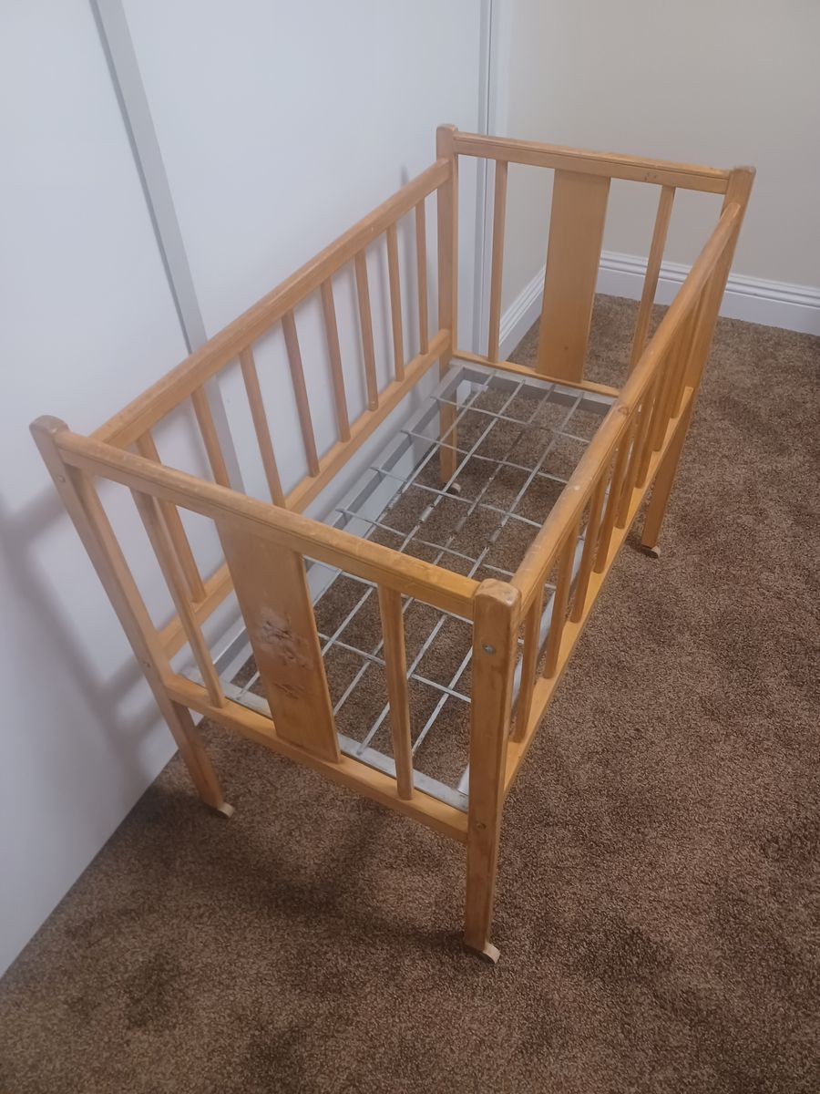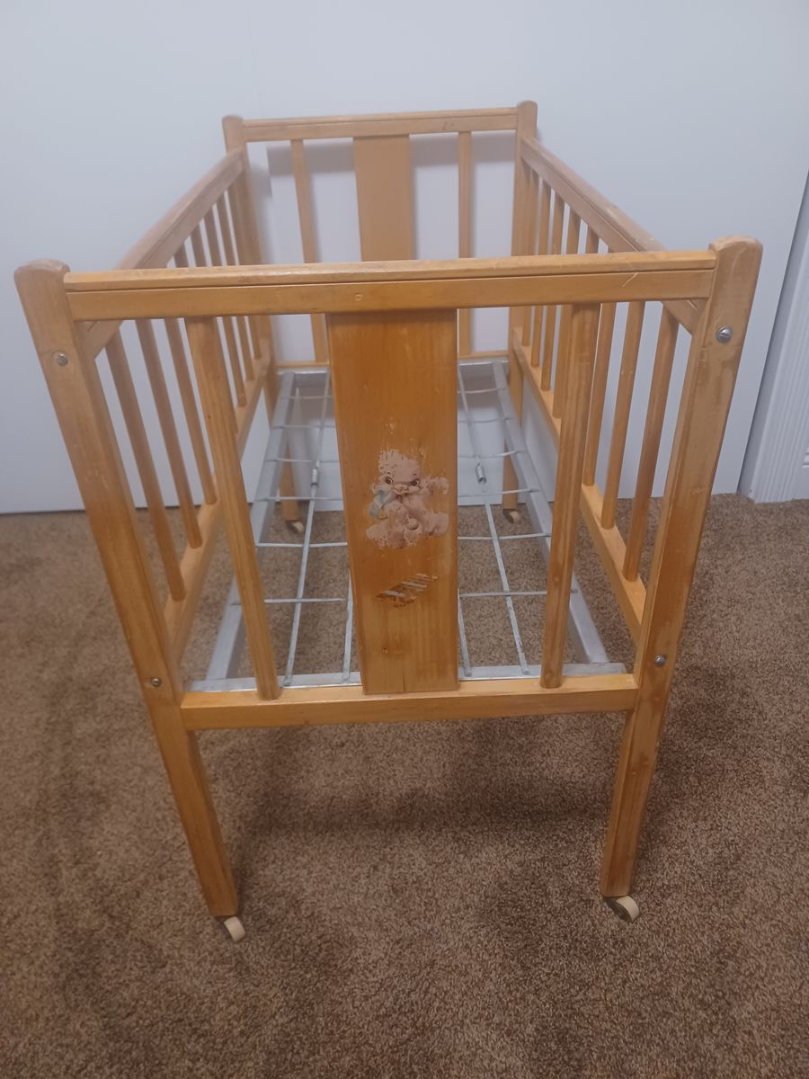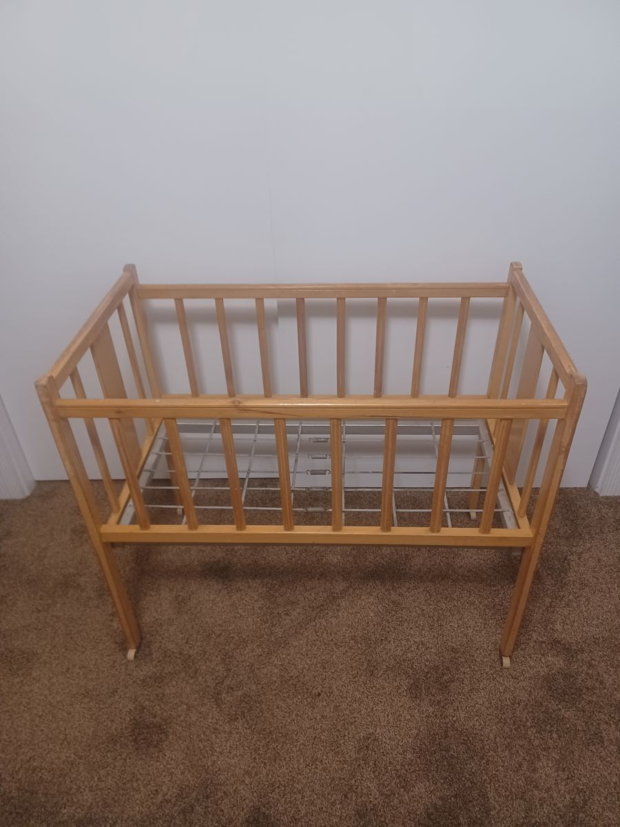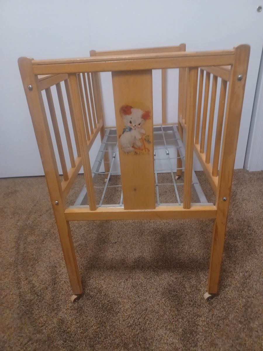 for sale is a vintage wood baby bed. Don't know the year or maker. Would make a nice gift for a young girl to use with her dolls. Comes with bedding shown. Has metal wheels on the legs.