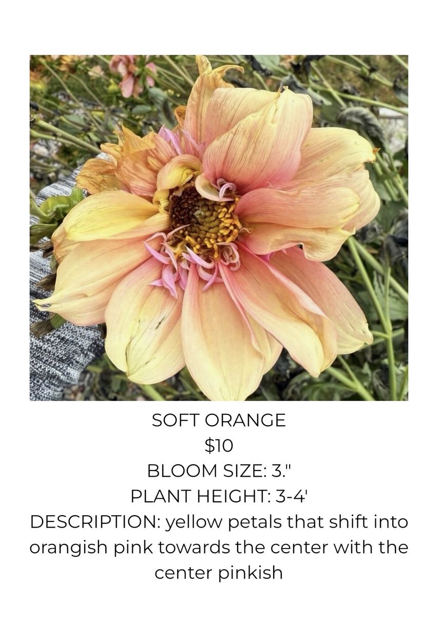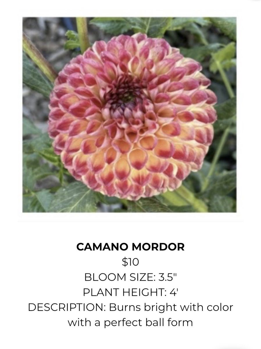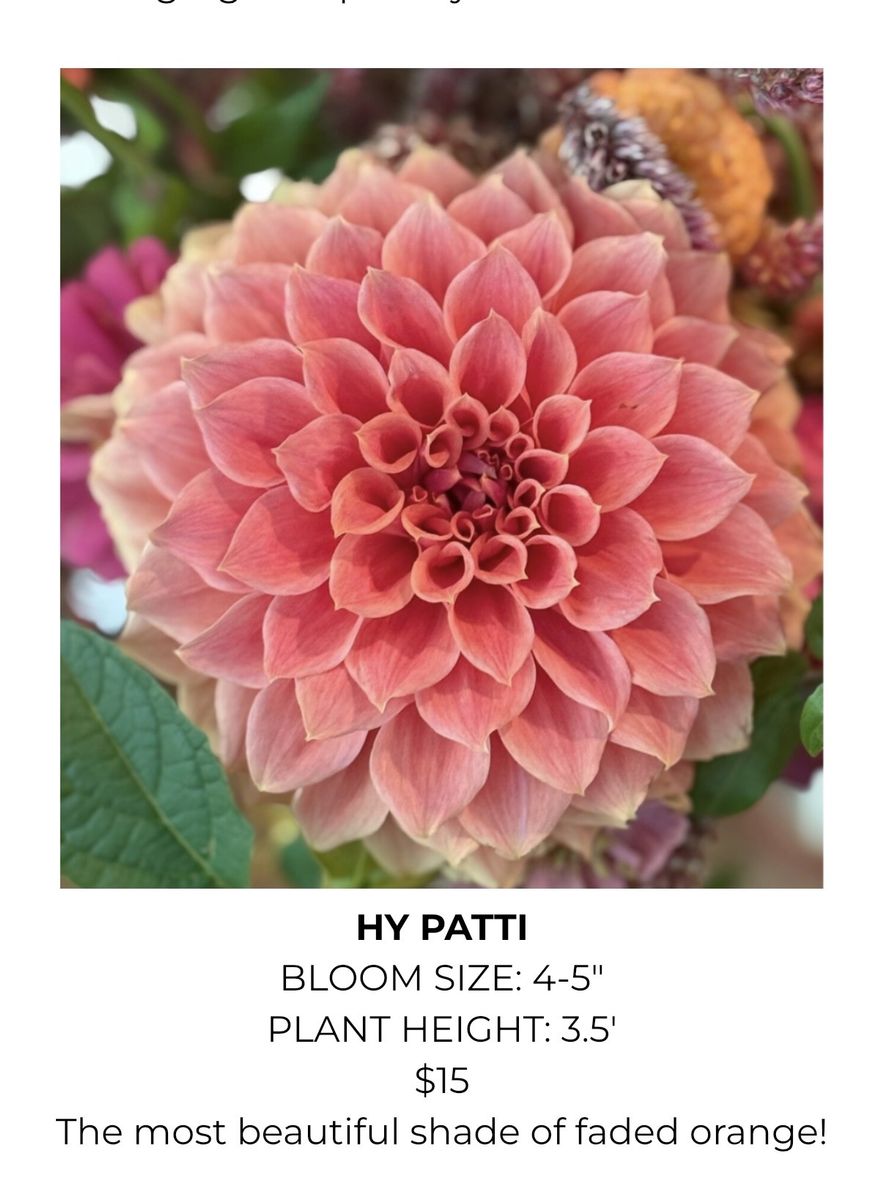 Variety of Dahlia Tubers Soft Orange Dahlia $10 each (22 available) Valley Tawny Dahlia $12 each (8 available) Hy Patti Dahlia $15 each (8 available) Camano Mordor $10 each (2 available) Mystic Illusion Dahlia $10 each (15 available) Creamy Dahlia $12 (8 available) Imperialis Dahlia $10 (6 available) Hartenaas Dahlia $12 (8 available)