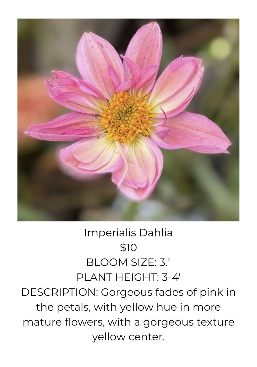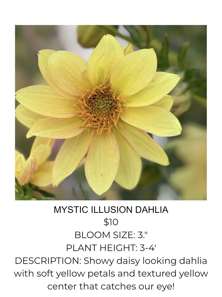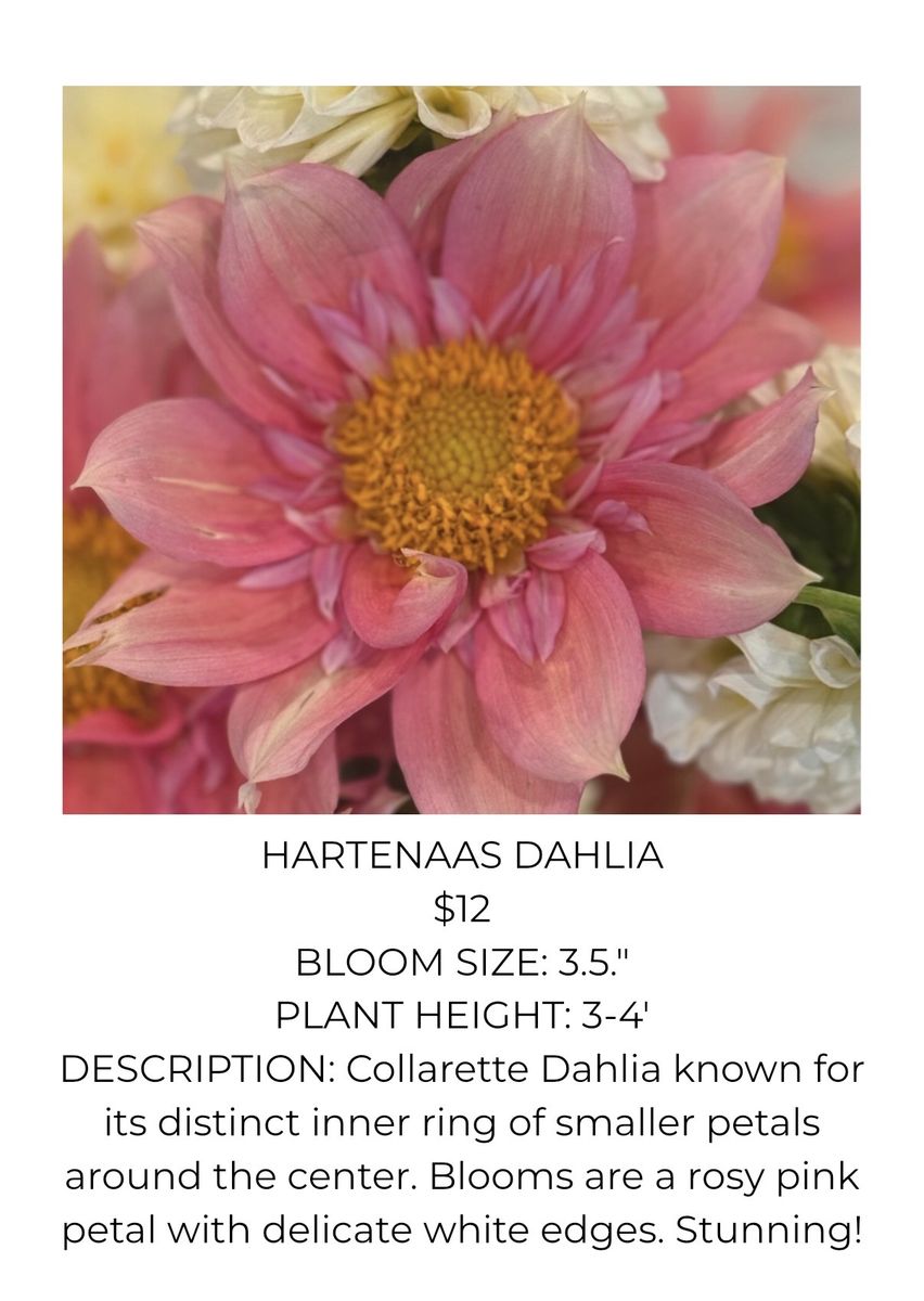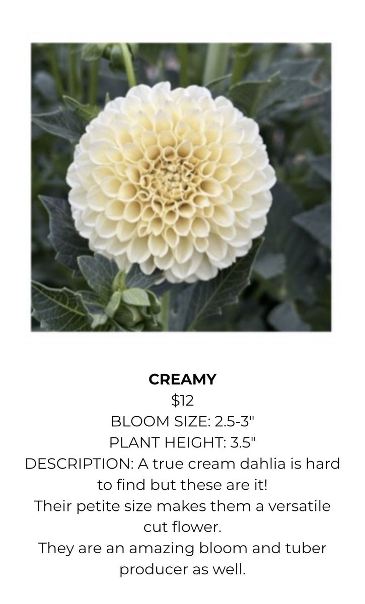Variety of Dahlia Tubers Soft Orange Dahlia $10 each (22 available) Valley Tawny Dahlia $12 each (8 available) Hy Patti Dahlia $15 each (8 available) Camano Mordor $10 each (2 available) Mystic Illusion Dahlia $10 each (15 available) Creamy Dahlia $12 (8 available) Imperialis Dahlia $10 (6 available) Hartenaas Dahlia $12 (8 available)