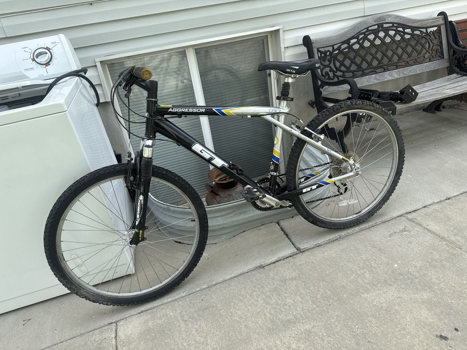 This Bike is still in good shape still in good condition both tires hold air , tire treads are still good, pedals are good, chain is good , handlebars are good , aluminum frame is still solid and has no cracks, brakes work great and shifters work great , 7x3 , 21 speed , Front suspension works great