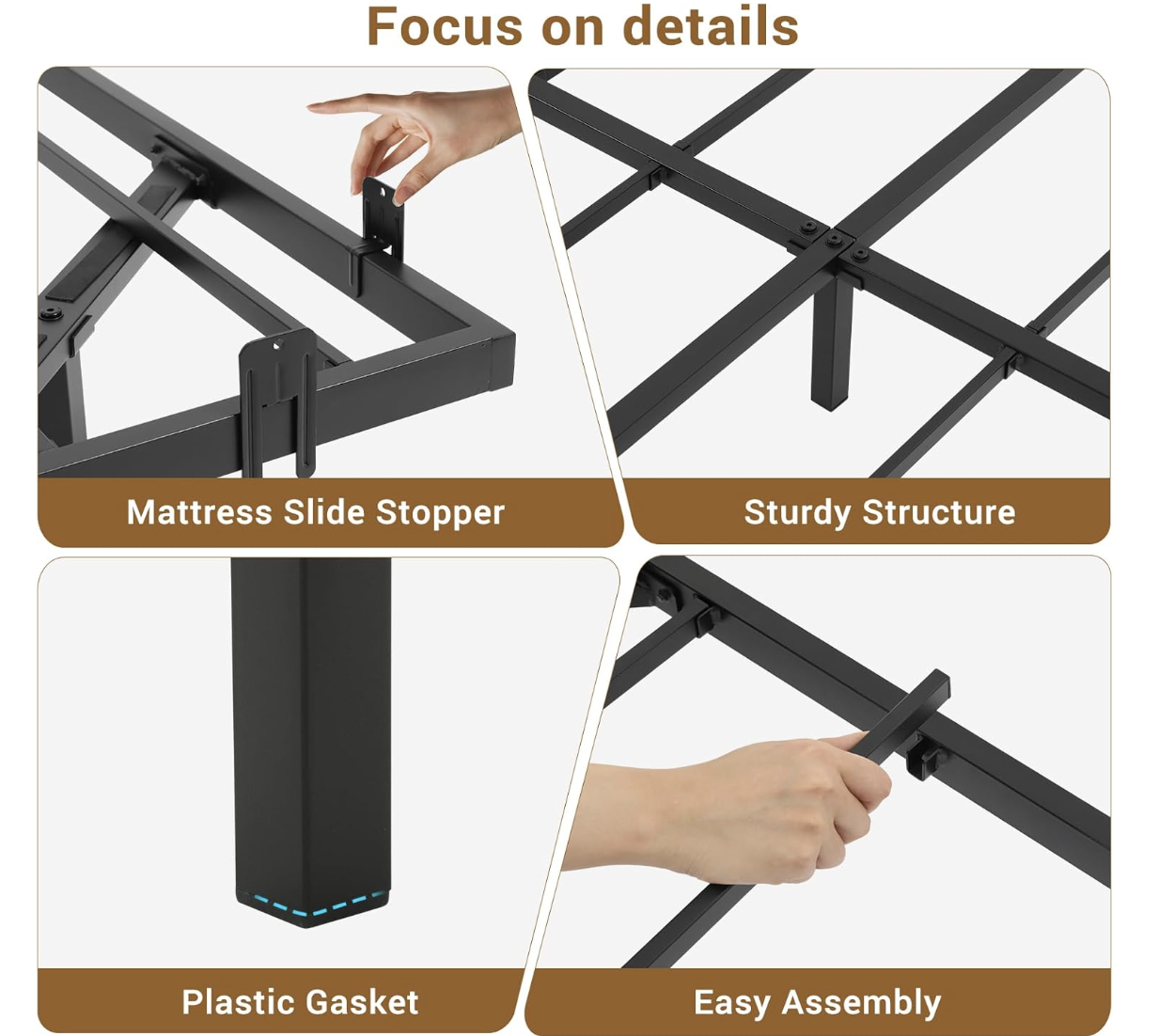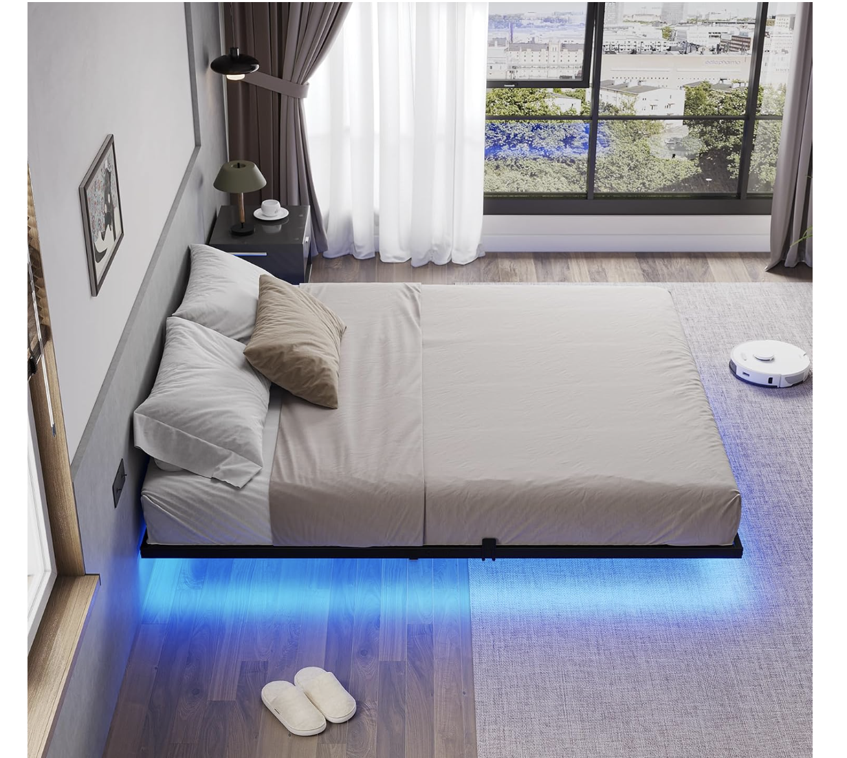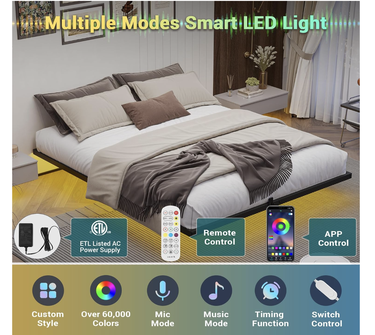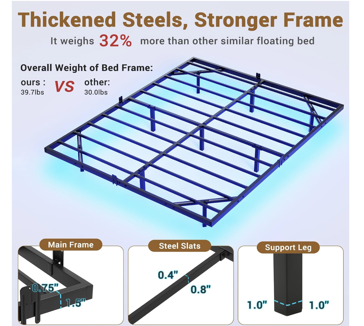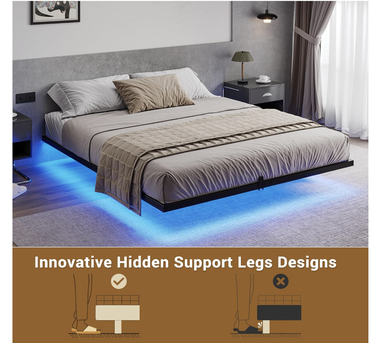 Modern Floating Bed The floating bed frame queen size is supported by inside legs on the reinforced main frame, which provides adequate stabilizing support while still making the bed appear to be floating in mid-air. Combined with the three side light strips under the bed, gives it a more modern feel. Under-bed Smart LED Lights The queen bed frame is equipped with three side hidden light strips under the bed frame. The LED light with a variety of colors and light patterns to choose from. You can also adjust the light change by APP or key control, In addition to directly adjusting the light in the APP, you can also set the music, voice, and timing modes, to discover more wonderfully! Sturdy, Stable, DurableThe frame around the perimeter is 38mm x 25mm iron pipe and the cross core frame and 9 support legs are 25mm x 25mm iron pipe. Each part of the connection is a tested design to make the queen size bed frame stronger and more durable. Mattress Slide StopperEach metal platform bed frame comes with 4 mattress slide stoppers. Simply press it onto the mounted metal bed frame, made of high-quality material for durability, no screws are required, customized for a perfect fit, and prevents any unwanted movement or sliding of the mattress. Easy to AssembleThe queen floating bed frame comes with an instruction manual with clear part numbers and detailed installation steps,