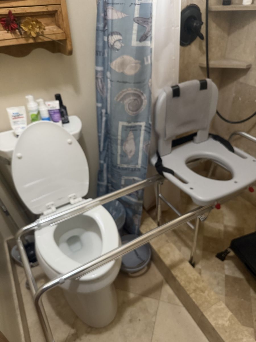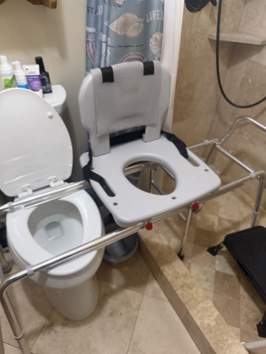 This toilet to shower is adjustable in height and width. It’s been a nice and helpful for showering my mom.