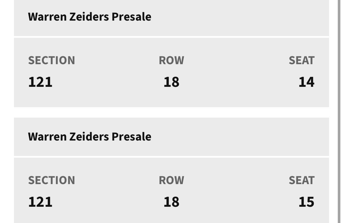 ApplePaySelling 2 tickets to Warren Zeiders for 04/15 at Maverick Center. Section 121 row 18 seats 14&15. Asking what we paid $110 for both.