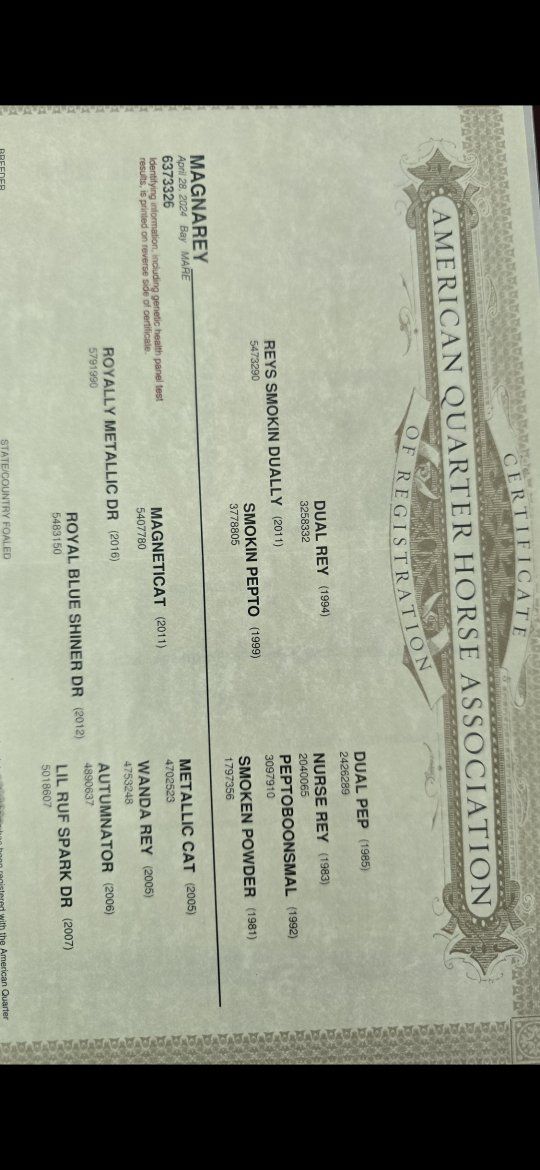 This filly is awesome! She is athletic, kind, and willing. With her pedigree and temperament, she is truly made for great things. She has been started in the round pen, and shows a lot of potential. NOT spooky or mean at all. We've handled and hauled her from day 1.
